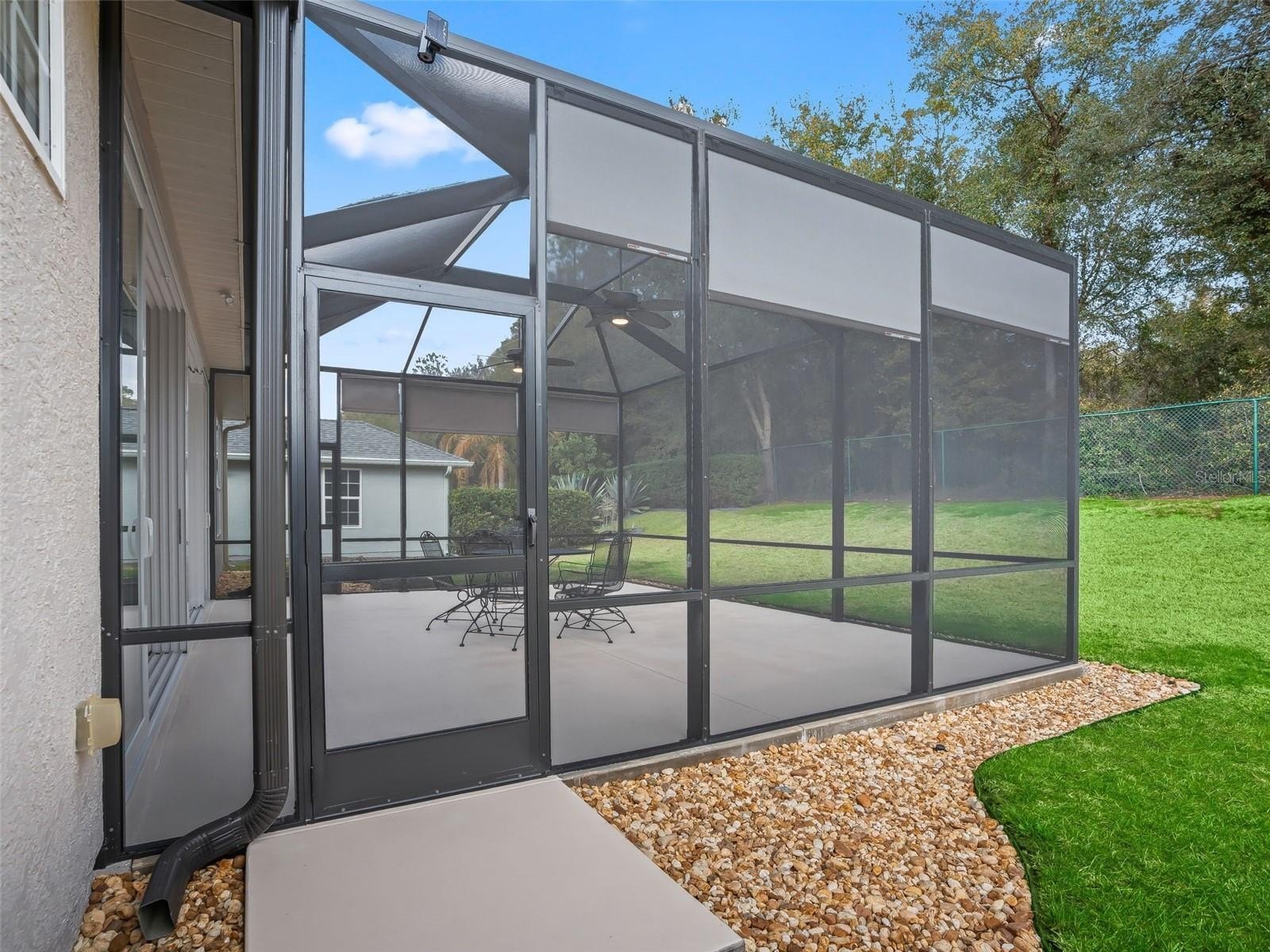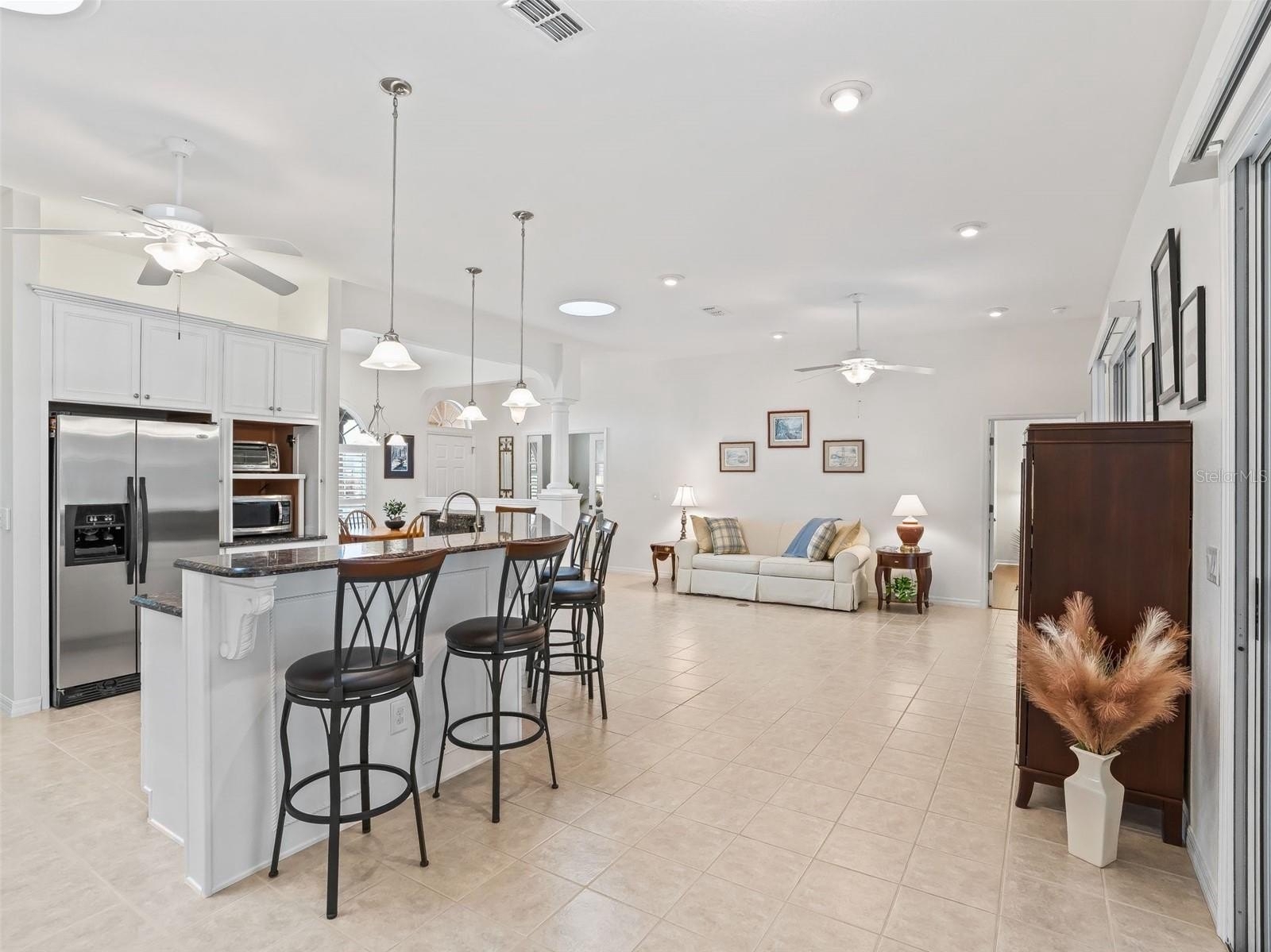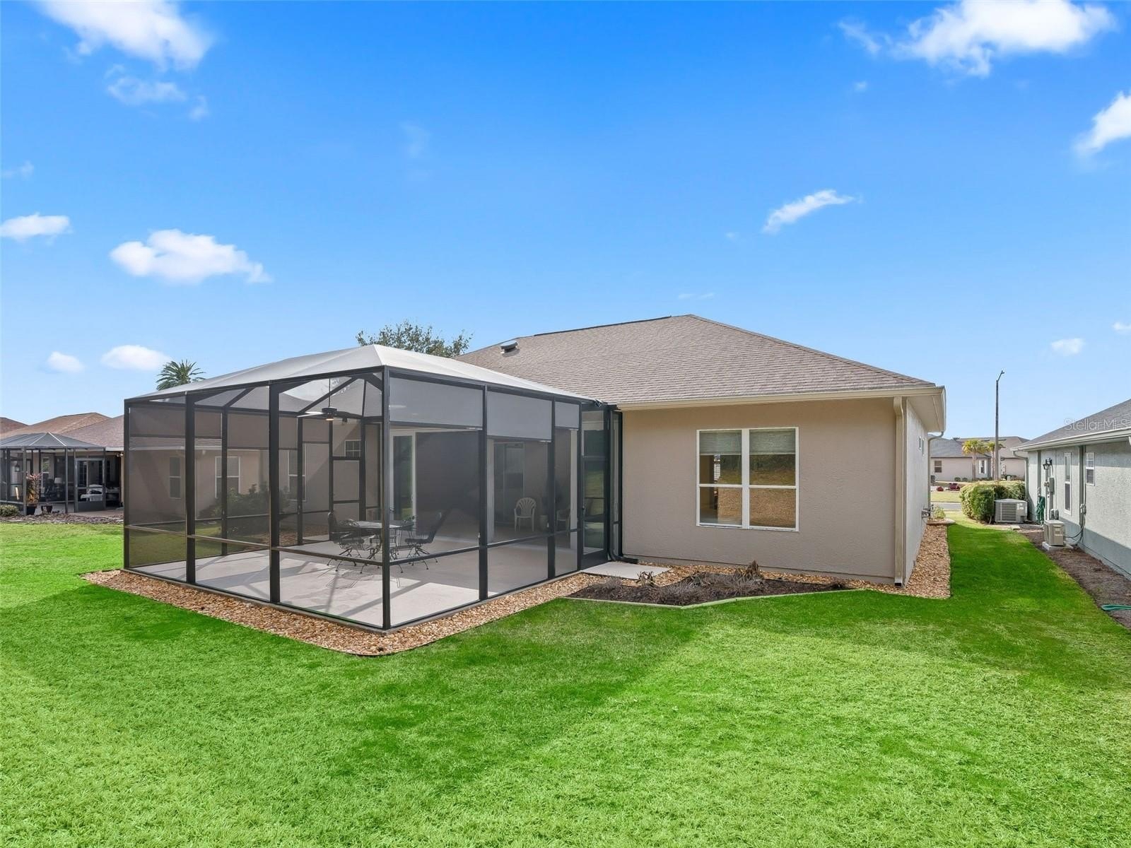 Stonecrest is a 55+ gated golf course community with all the amenities and 4 pools (one indoor), and just a Bridge Away By Golf Cart To The Villages! Exceptional 3/3 + Den Cedar model with a 2 Car + Golf Cart Garage, ROOF 2020, HVAC 2020, Soaring 10ft ceilings, Open and Split Floor Plan, and No Rear Neighbors! This home presents Tremendous Curb Appeal featuring Meticulously Maintained Professional Landscaping, Painted Concrete Driveway and Walkway, and an Elegant Front Porch! The Open Concept Floor Plan is Spacious, and Flooded with Natural Light, offering the Perfect Gathering space for family, and friends! The Split Floor Plan provides maximum Privacy for both the Owners and their Guest, with the Primary suite commanding one side of the home while the guest bedrooms and guest bathrooms are located on the opposite side of the home. The Luxurious Primary suite offers a Huge Walk In Closet, and an En Suite bathroom. The En Suite Bathroom features a Double Sink Vanity, Bidet, Tiled Walk In Shower, and a Nice Size Soaking Tub! The two additional bedrooms feature nice size built in closets. Guest bedroom 2 offers an En suite bathroom with a Tiled Walk In Shower, and good size Vanity, providing your guests with Convenience, and Privacy! Guest bathroom 3 is conveniently situated next to the additional guest bedroom, providing ample space for your guests. The Impressive Gourmet Kitchen showcases Granite countertops, Tumble Tile Backsplash, Sold Wood Cabinets with Pullouts, Stainless Appliances, a Double Pantry Closet, Generous Breakfast Bar with Upgraded Pendant Light Fixtures, and Eat in Area with Access to the Enclosed Lanai. The kitchen flows seamlessly to the Living area, which offers an Exceptional Space for Enjoying Comfortable Living, and Entertaining! Gorgeous Laminate Flooring, and an Upgraded Light Fixture Adorn the Dining area accented by Plantation shutters, and opens to the Huge 16 x 18 Living area which offers access to the 24 x 10 Lanai! Enjoy Exceptional Outdoor Living on the 23 x 20 Birdcage Enclosed Back Patio, with warm Tropical Breezes, Beautiful Sunsets, and Backyard BBQ's! There is Plenty of Room for Storage in the 28 x 21 2 Car + Golf Cart Garage! Call Cindy Now for Your Private Showing! Stonecrest is a 55+ gated golf course community with all the amenities, pools, pickleball courts, softball, 18 hole championship golf course, Broad Stripes Golf & Social Club and over 80 different clubs to join! As a private gated golf course community, you can expect a high level of privacy and security. Overall, this home offers a combination of Tremendous Outdoor Space, Luxurious Features, a Fantastic Location, and a Secure Community Setting. A WONDERFUL LIFESTYLE AWAITS YOU IN STONECREST! Plenty of privacy, with No Rear Neighbors, and Privacy landscape, which provide a lovely park like setting for your backyard BBQ's !