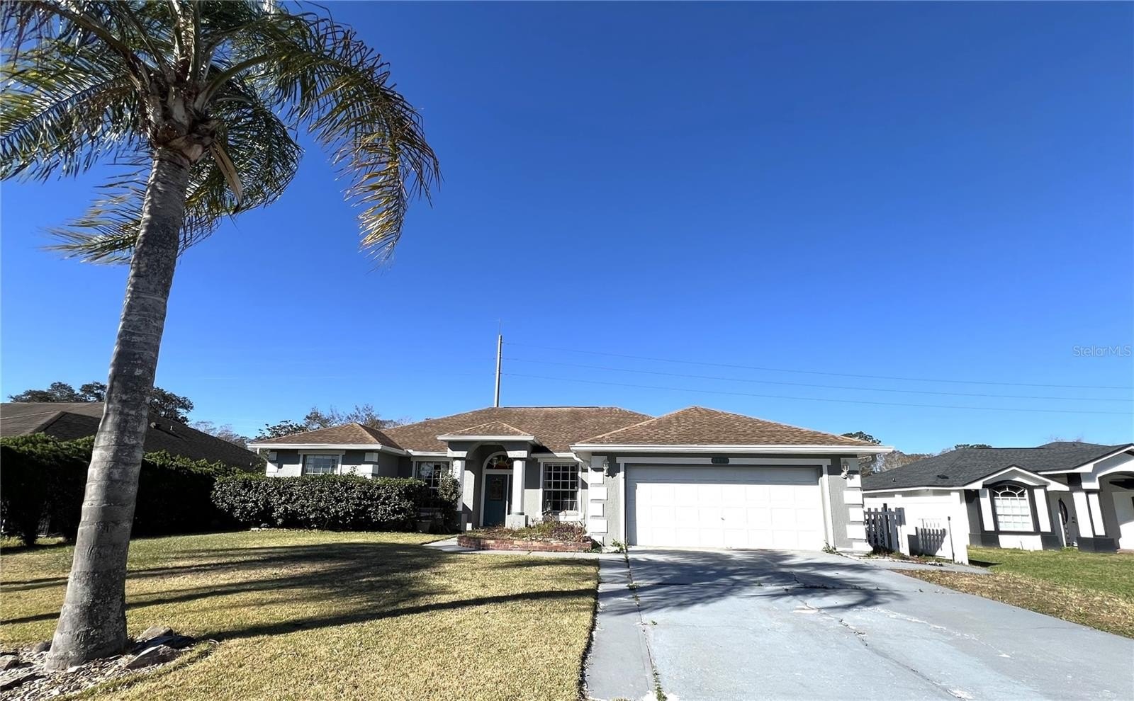 Very nice one-story 4 bedroom home with dual primary suites plus a home office. Situated on a one-third-acre lot on a cul de sac. Enter the home to see a large living room with crown molding, dining room to the right and French doors that lead to the office on your left. The kitchen features a high breakfast bar, solid surface counters, and all appliances will stay. The primary bedroom features a walk-in closet, and private bath with granite-topped vanity, jetted garden tub, and step-in glass tiled shower. This bedroom exits to the huge enclosed back porch. The second bedroom also has a full private bath. Bedrooms 3 and 4 share the 3rd full bath. Three of the bedrooms have painted concrete floors, ready to receive the floor covering of your choice. The inside laundry room has a utility sink for convenience. From the living room, go through the sliding glass doors to the enclosed porch, with view to the concrete patio, perfect for the BBQ, and the fenced back yard. There is a potting shed and a storage shed/workshop with a concrete ramp and electric power. The home is on city water and septic, to keep your water bill low. HOA is only $200 per quarter and there is no CDD here. The roof was replaced in 2018. The home is priced to sell AS-IS.