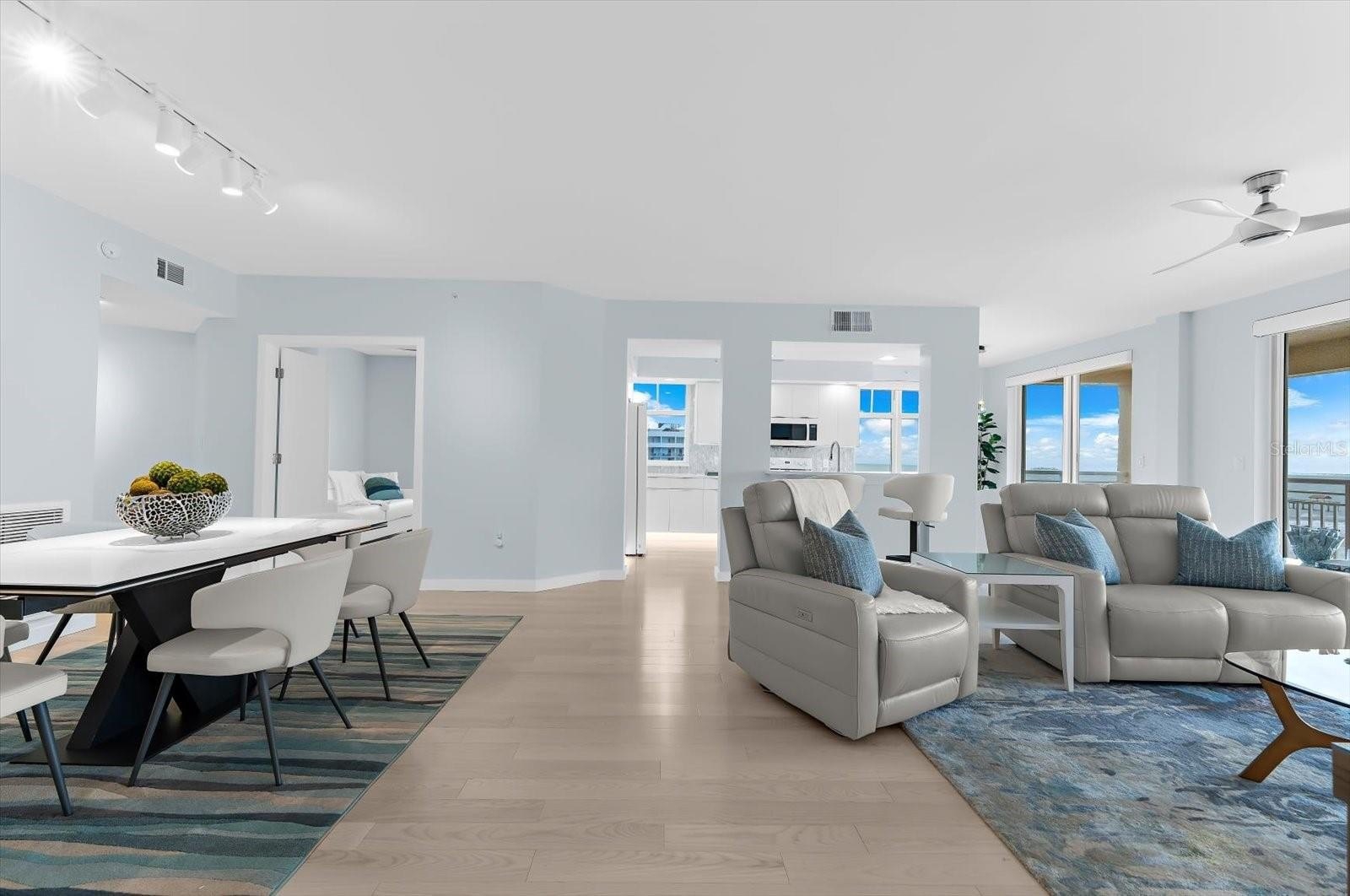 The interior offers a well-balanced three-bedroom, two and one half bath layout with generous living and dining spaces oriented toward the Gulf of America. Large windows and sliding glass doors create a seamless connection to the private balcony, providing an ideal setting for morning sunrises, evening sunsets, and year-round coastal living. The kitchen is thoughtfully designed with solid surface countertops, ample cabinetry, and a breakfast bar that opens to the main living area, allowing for both functionality and effortless entertaining.