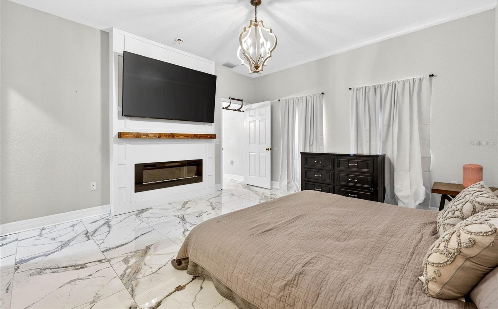 The spacious primary suite includes a walk-in closet with built-in electric fireplace and a luxurious bathroom with dual sinks, granite countertops, a walk-in shower, and a relaxing soaking bathtub. Two large guest rooms share a newly renovated bath with a walk-in shower.