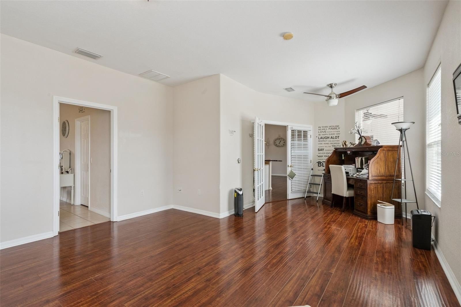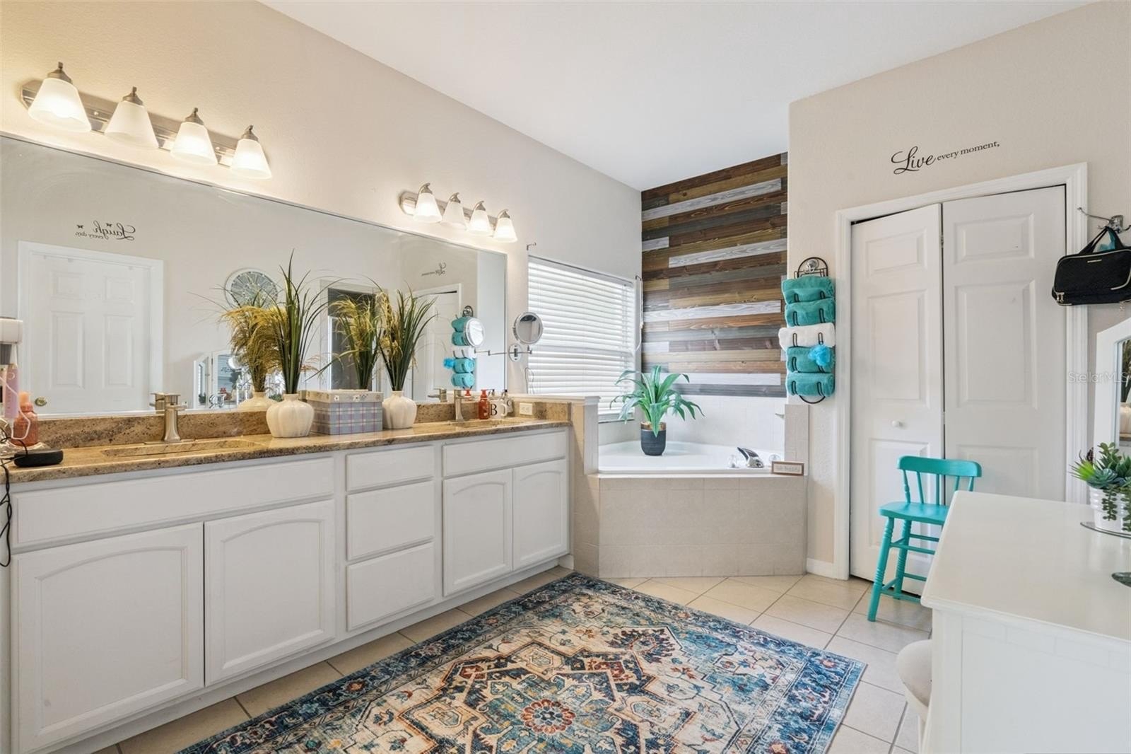 The primary bedroom suite offers a walk-in closet and a cozy sitting niche—ideal for relaxing while enjoying views of the pool. The primary bathroom is thoughtfully designed with dual sinks, a linen closet, walk-in shower, private water closet, and a luxurious garden tub.