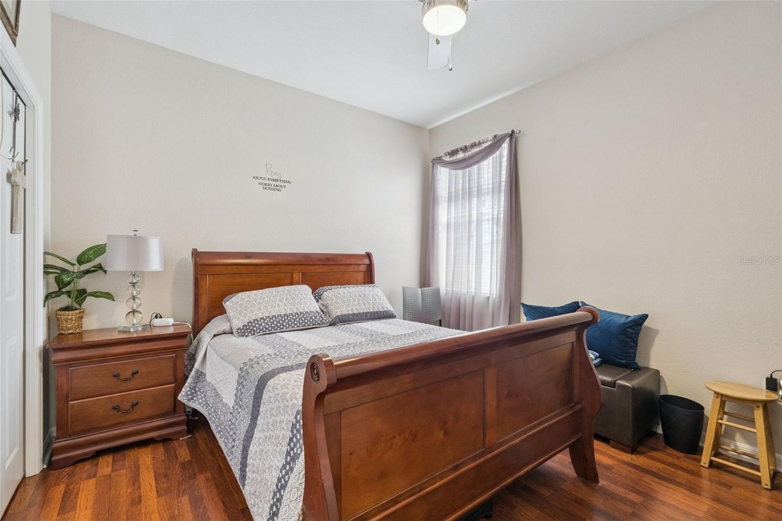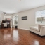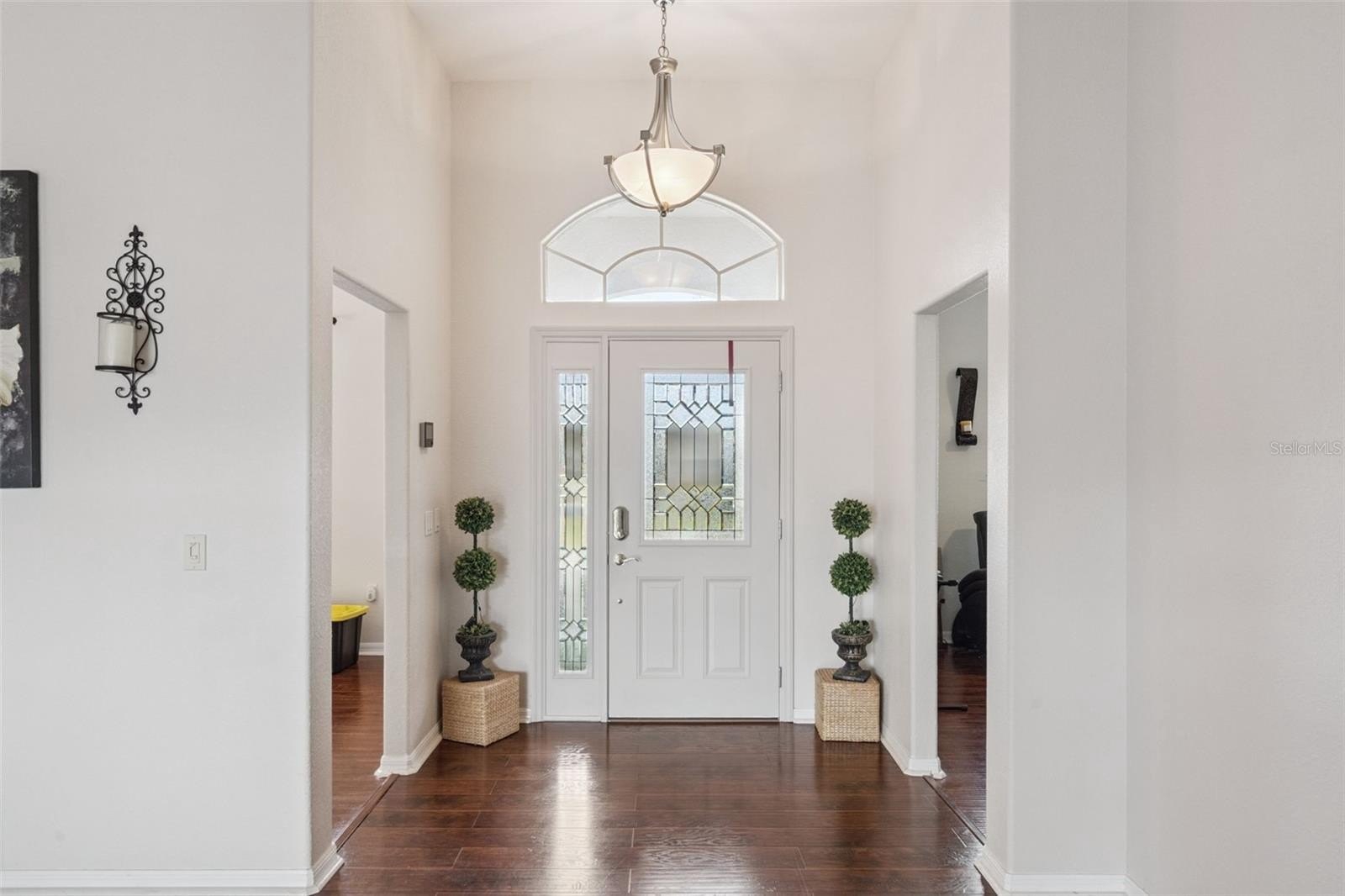 Upon arrival, you’re welcomed by a lovely covered entry accented with a leaded glass front door and arched transom window, filling the foyer with natural light. The spacious great room features hand-scraped engineered wood flooring and a large sliding glass door that seamlessly brings the outdoors in, offering views of the patio and pool area.