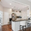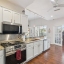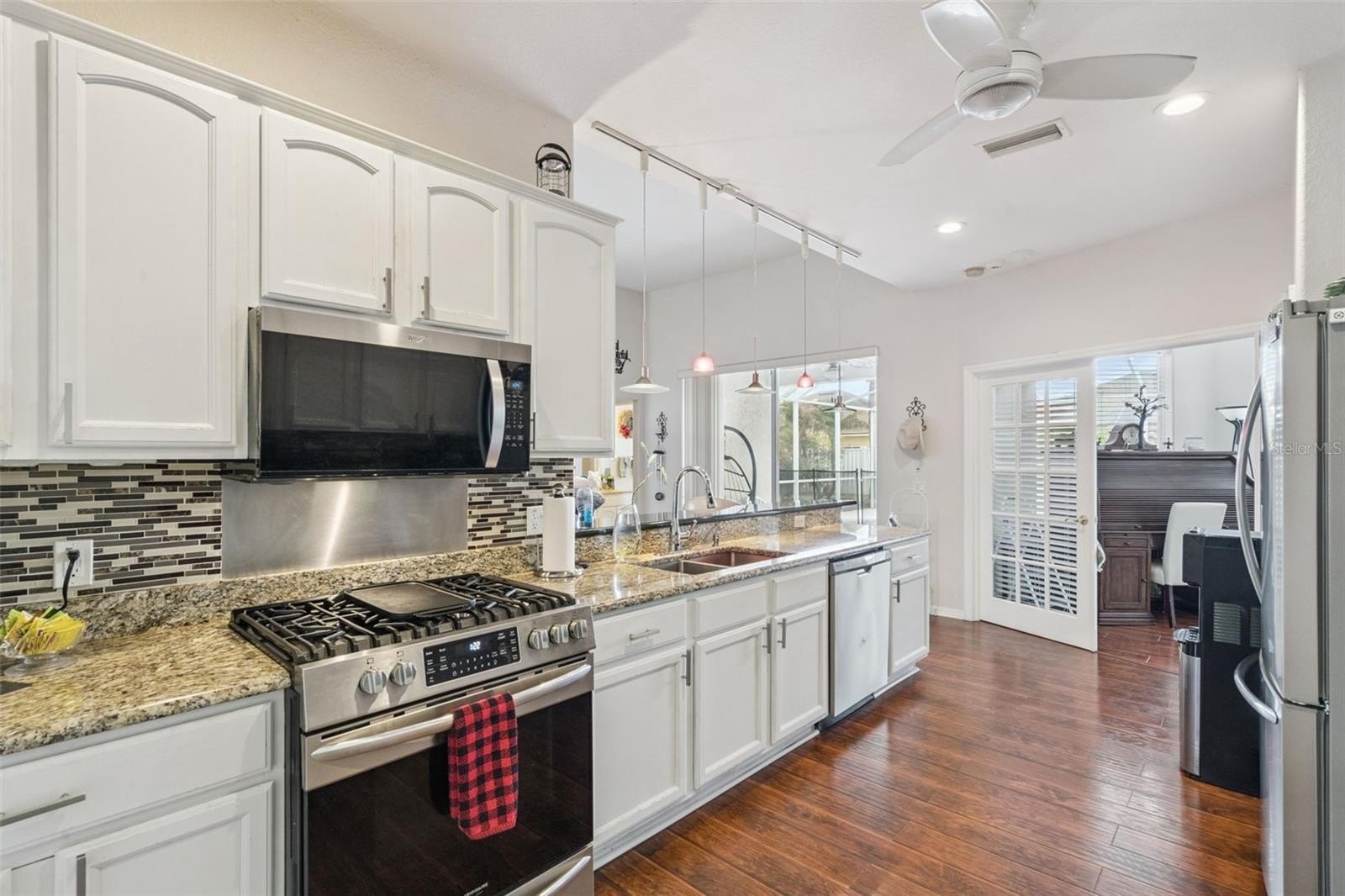 The well-appointed kitchen showcases white cabinetry with brushed nickel hardware, beautifully complemented by a glass tile backsplash. Stainless Steel Appliance Package includes a Gas Range. A granite-topped breakfast bar with pendant lighting provides additional seating and creates a natural gathering space. A formal dining room is conveniently located nearby, making entertaining effortless.