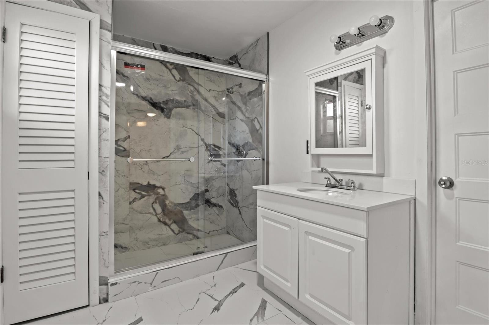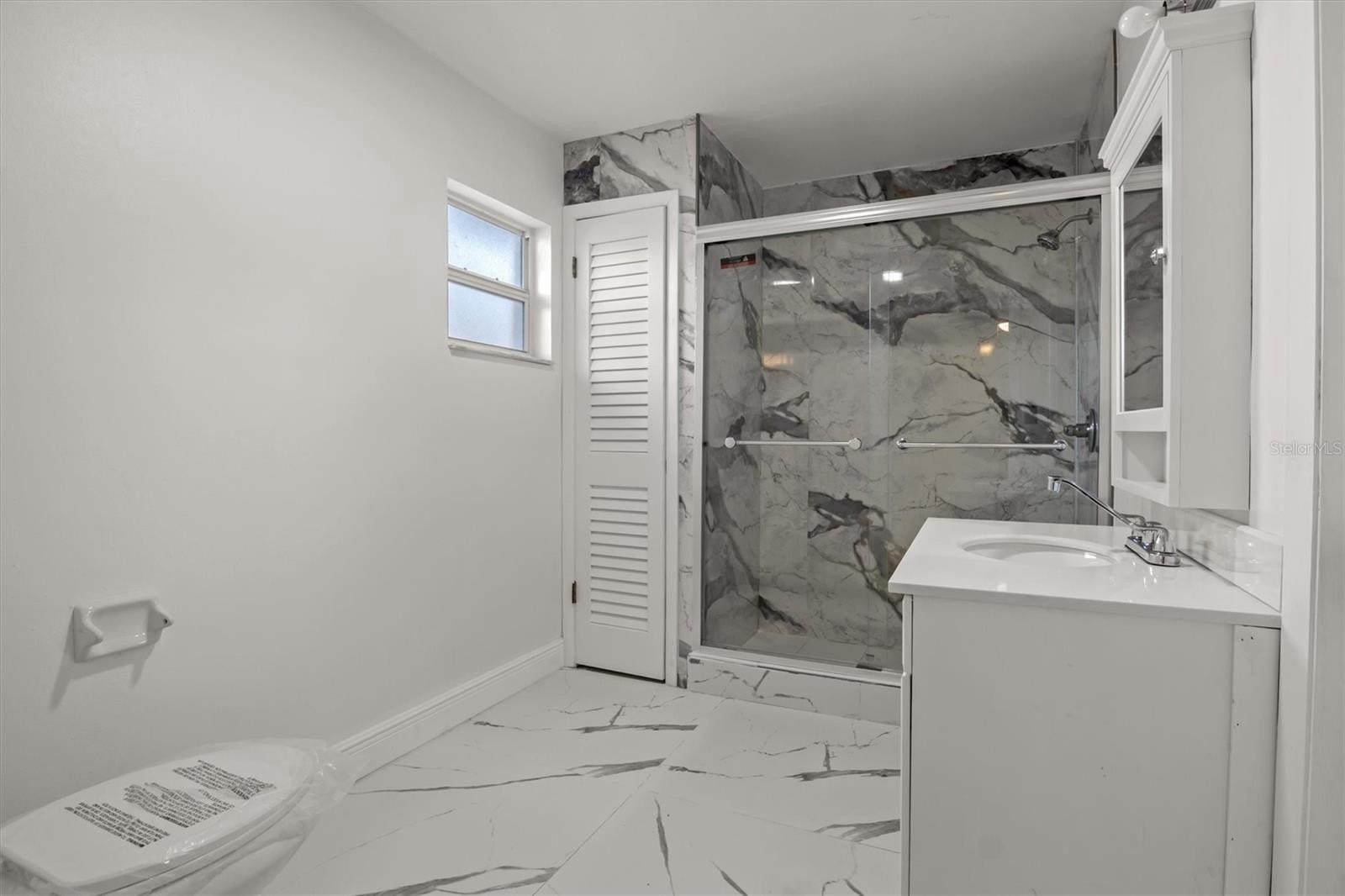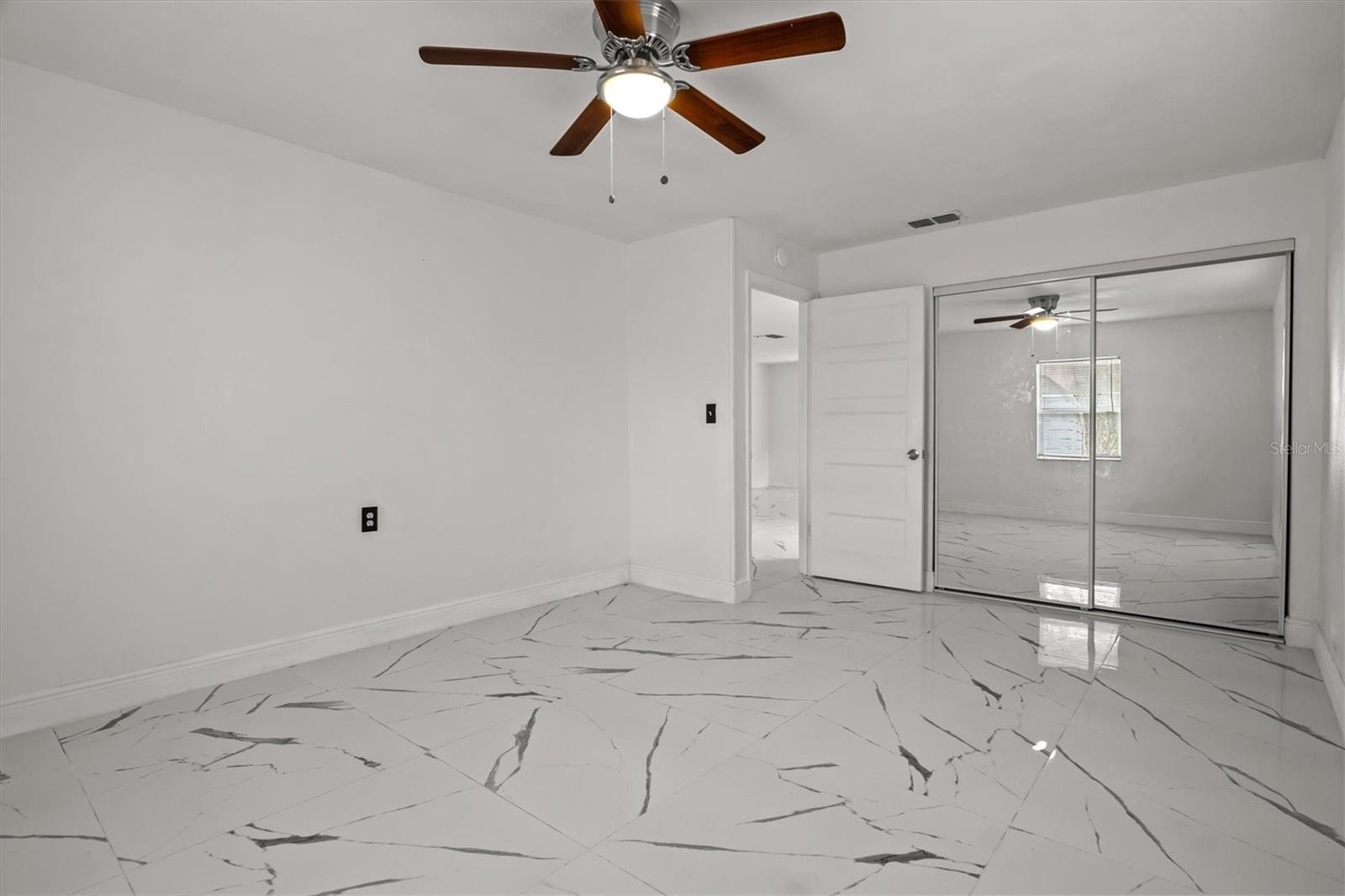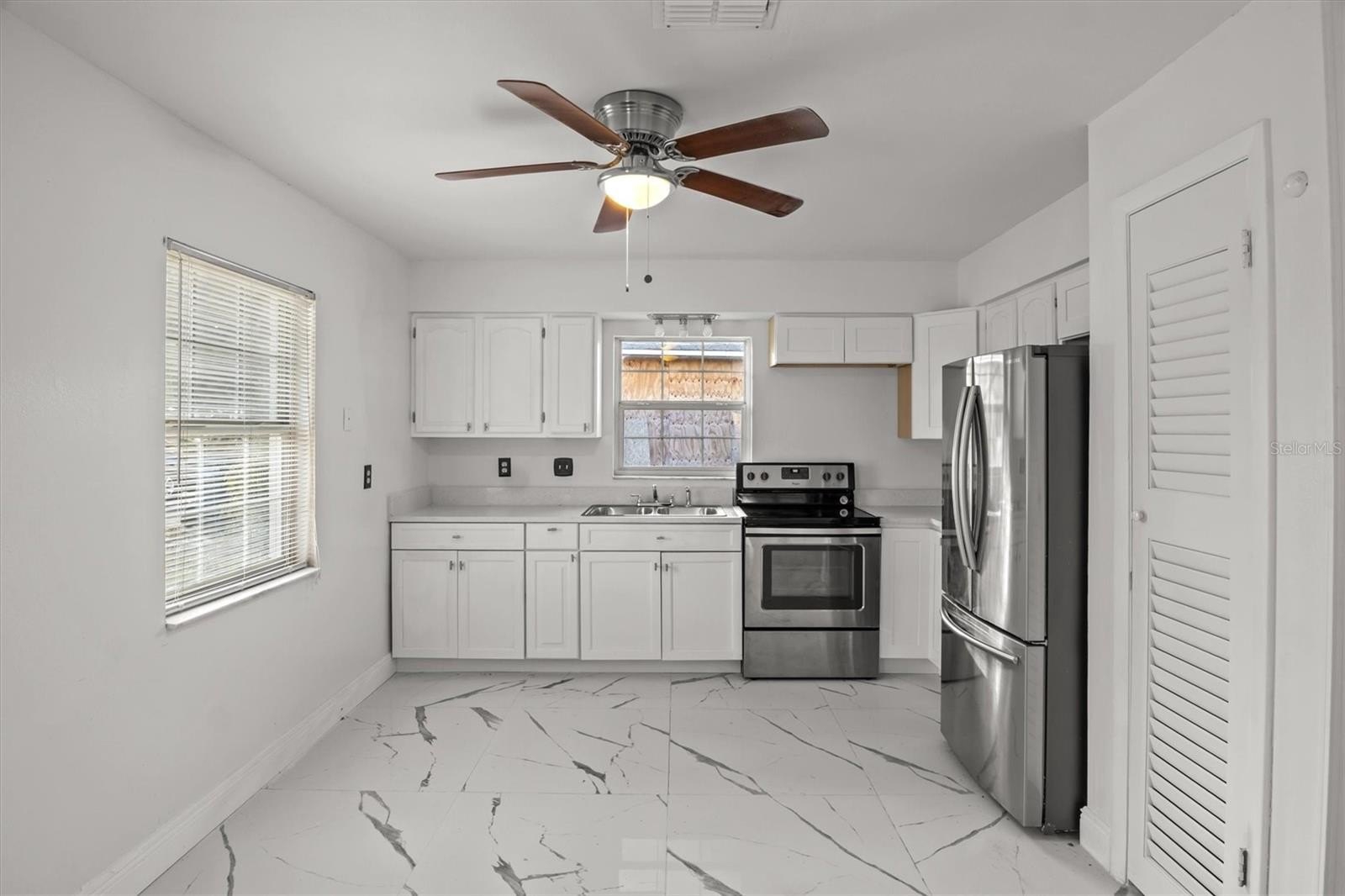 Inside, the home features a renovated interior with porcelain tile flooring, updated finishes, and an open-concept layout that flows naturally from the living area into the dining space and kitchen. The kitchen is equipped with brand-new stainless steel appliances, and recent improvements include a newer AC system, new interior doors, new ceiling fans, and new light fixtures, providing added comfort and efficiency.