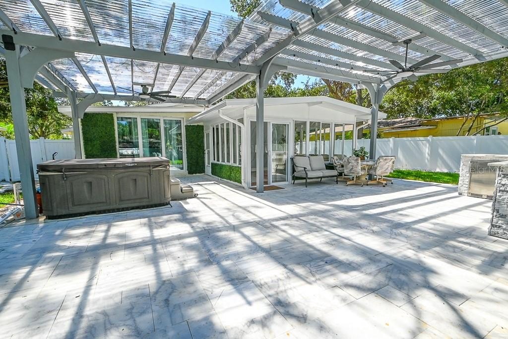 Huge backyard patio with a complete outdoor kitchen – perfect for BBQs and gatherings.