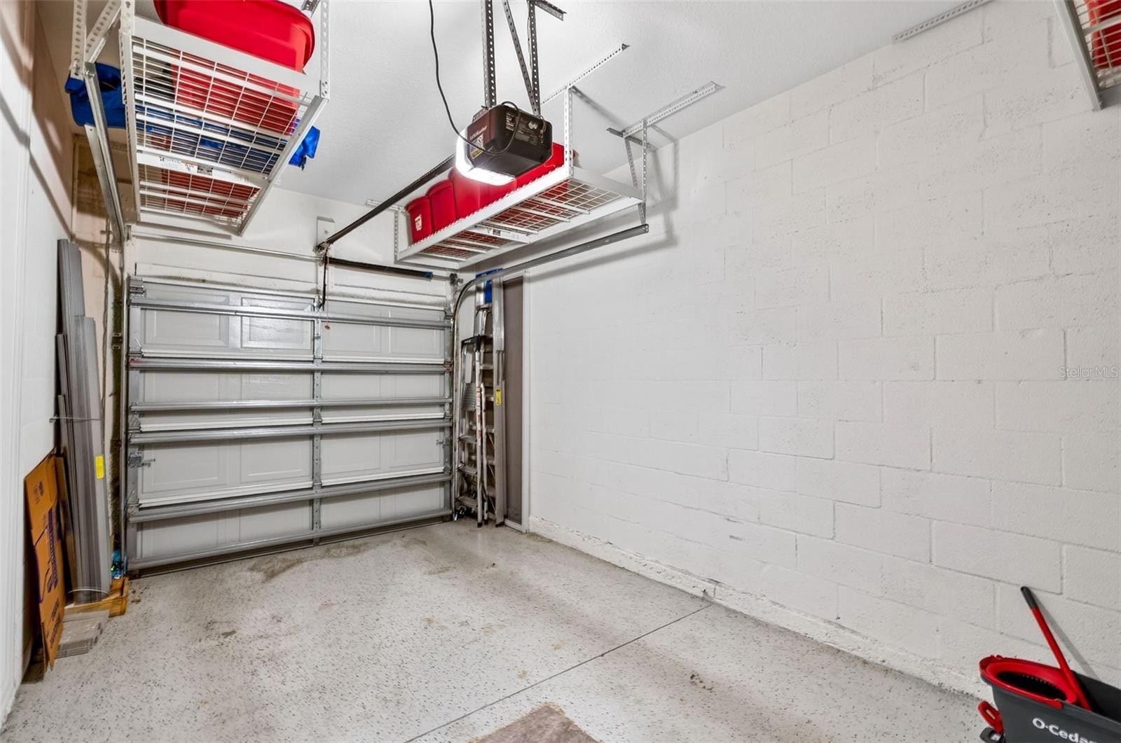 The 1-car garage includes an added bonus: a built-in overhead storage system, maximizing organization and functionality while keeping the space clean and efficient (please see attached photo).