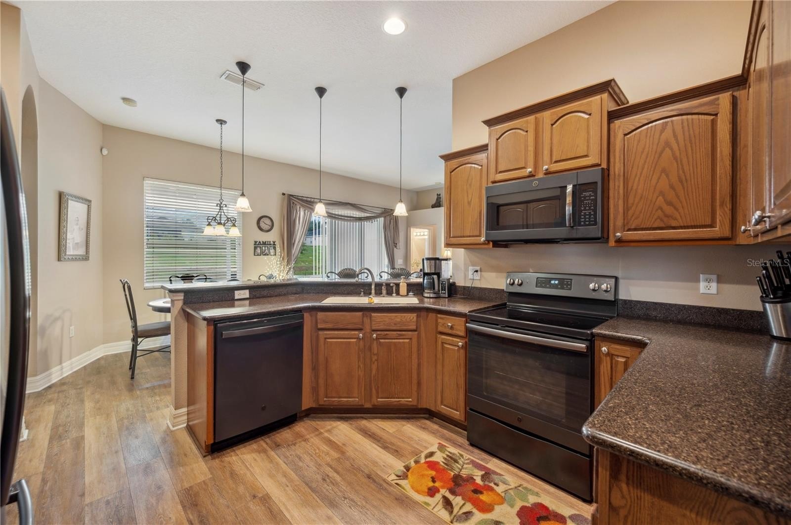Inside, enjoy 10-foot ceilings, luxury vinyl flooring, updated light fixtures, and ceiling fans throughout. The kitchen offers Corian countertops, a breakfast bar, solid wood cabinetry, and high-end GE appliances—ideal for everyday living and entertaining. The spacious primary suite is a true retreat with dual sinks, a walk-in shower, soaking tub, and his-and-her walk-in closets.