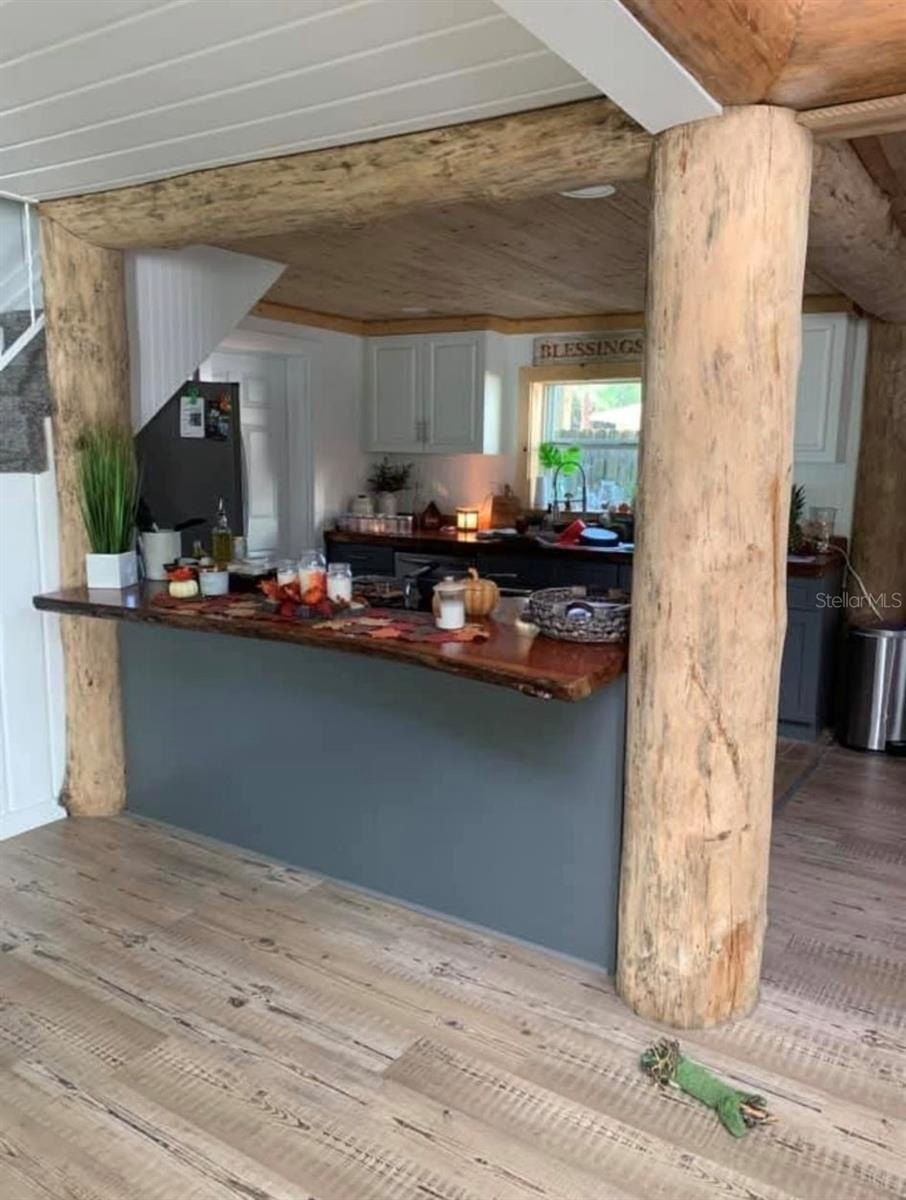 Inside, you’ll find live-edge wood countertops, natural wood trim, and an open kitchen overlooking the family and dining rooms. The kitchen features stainless steel appliances, newer cabinets, and a rustic flair originally crafted by an Amish family. The spacious family room includes a large picture windows that frame the beautiful front yard and mature oak tree.