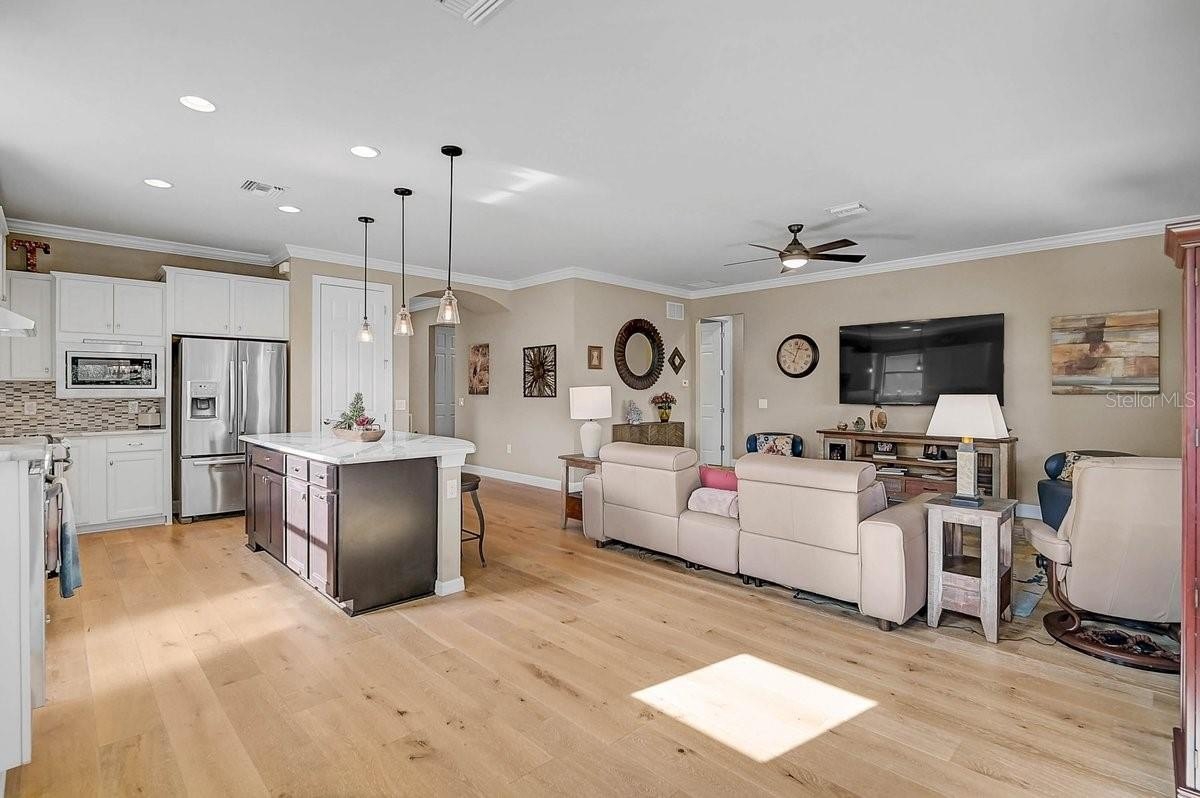 Inside, you’ll find a Split-Bedroom floor plan, Freshly Painted Owner’s Suite + Custom Designed Closet, Updated Quartz Kitchen Countertops, Engineered Hardwood Floors, + Crown Molding throughout.