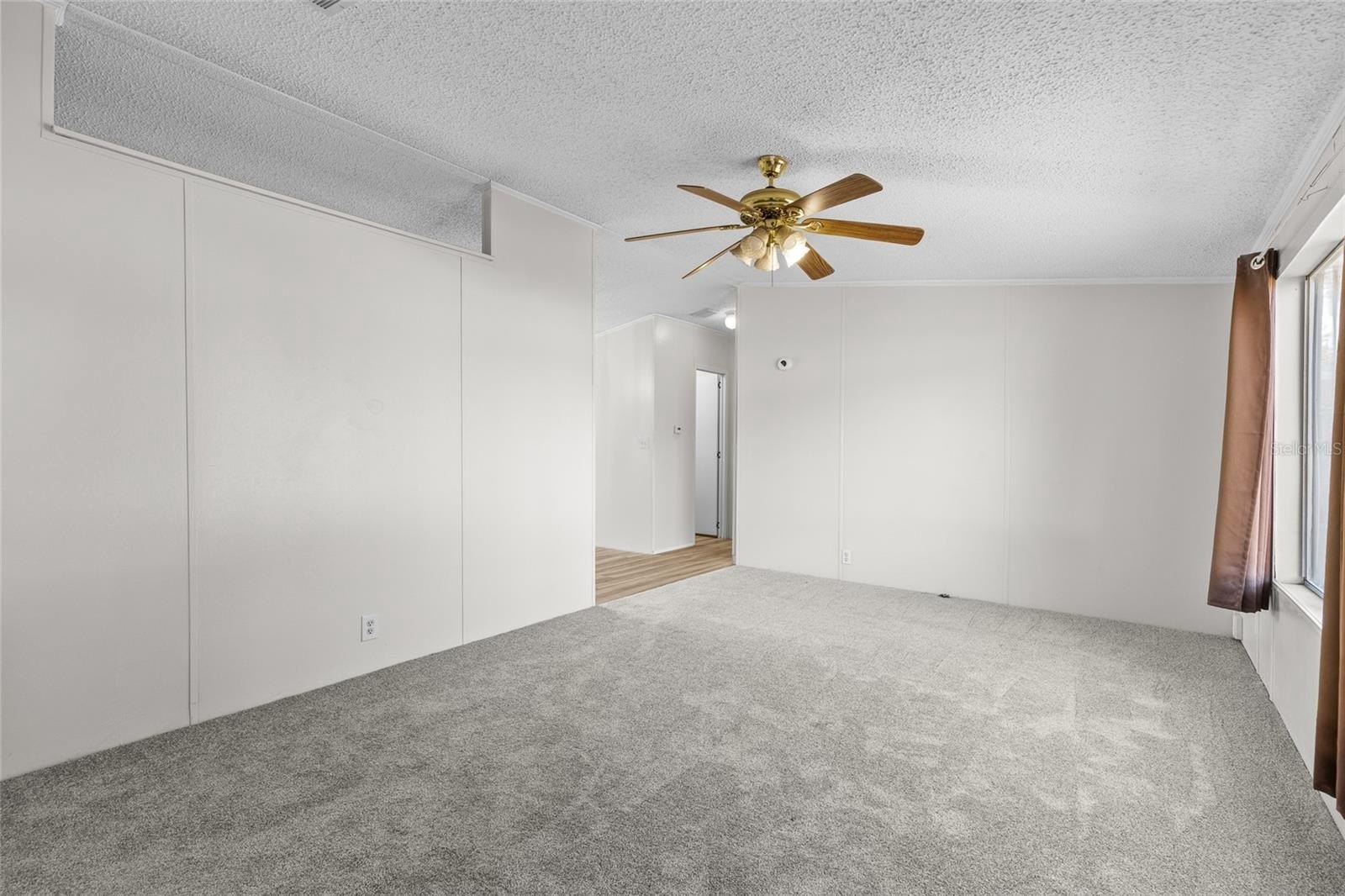 The extended driveway and covered carport provide practical parking and everyday convenience. Inside, the home has been freshly painted and features NEW laminate flooring in the main living areas, NEW carpet in the bedrooms, updated light fixtures, and NEW ceiling fans with remote controls. Natural light fills the living and dining areas, creating a bright and comfortable layout.