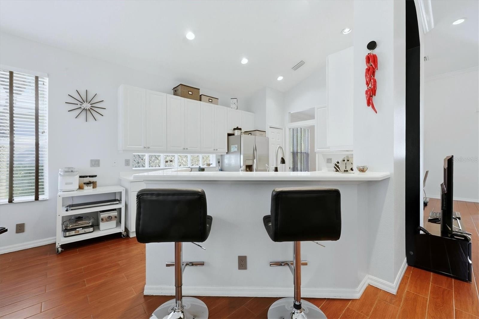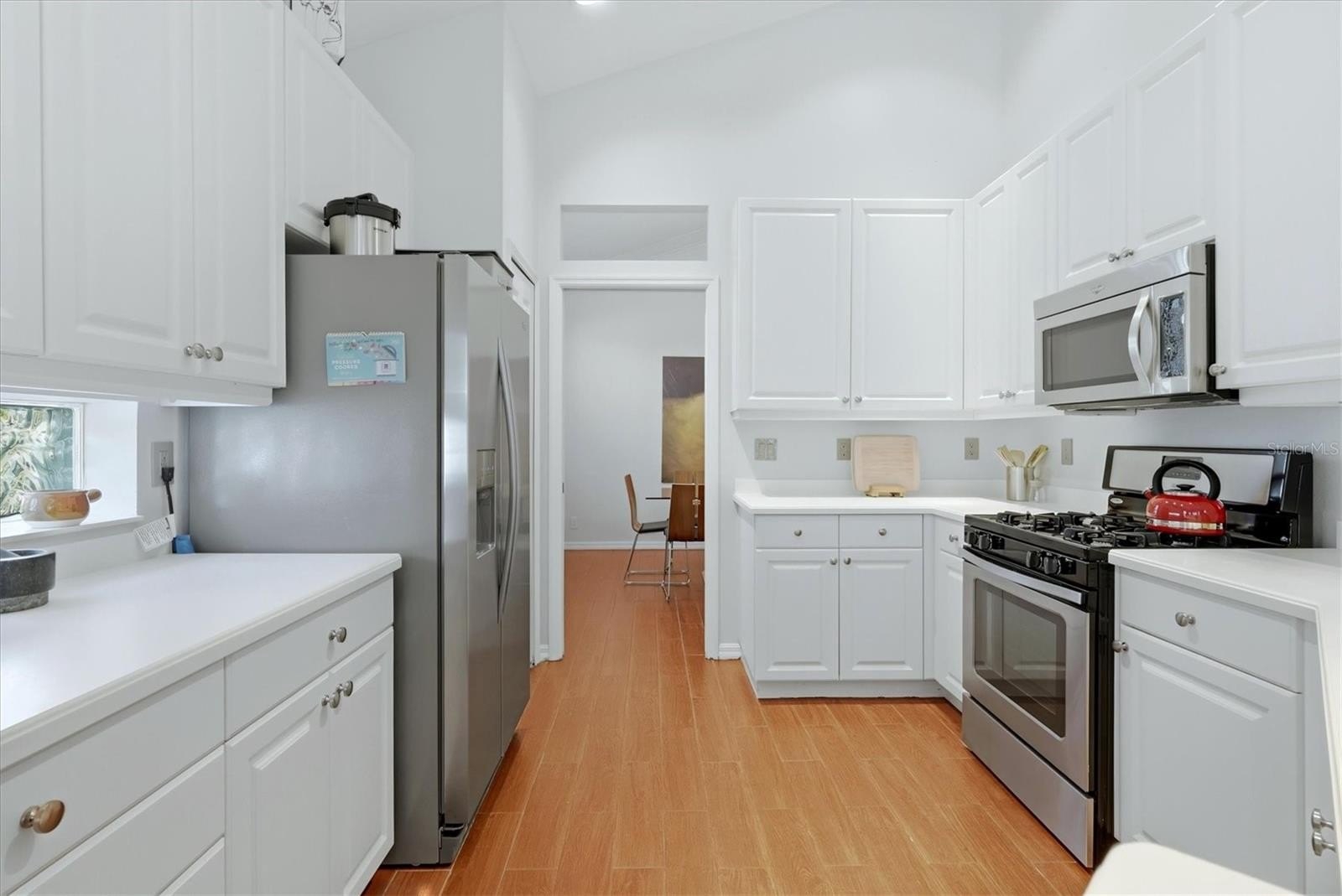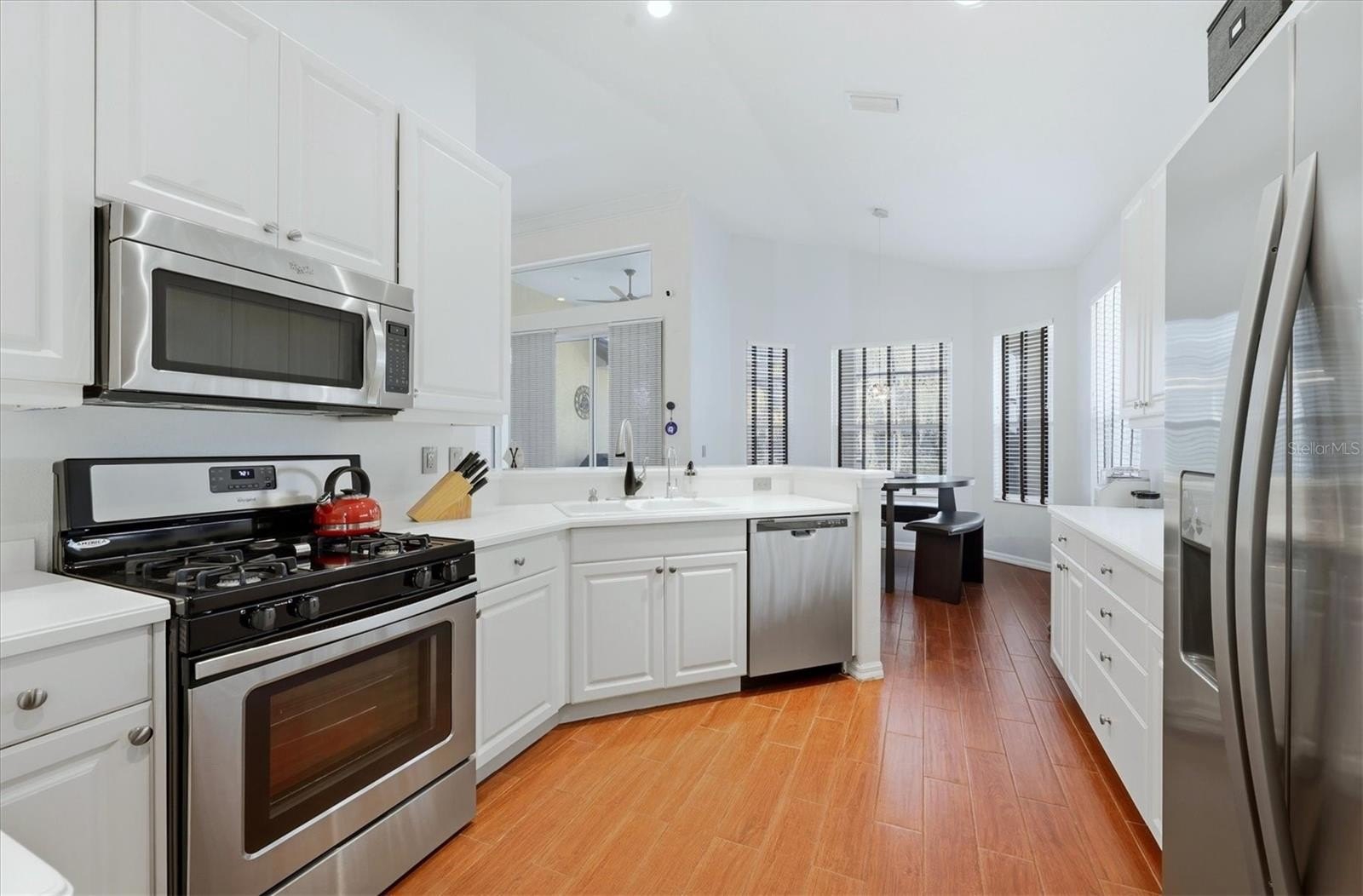 The kitchen is equipped with Corian countertops, stainless steel appliances, and a cozy breakfast nook overlooking the pool and lanai. Just off the kitchen, the connected living and dining spaces create an easy flow for hosting family and friends.