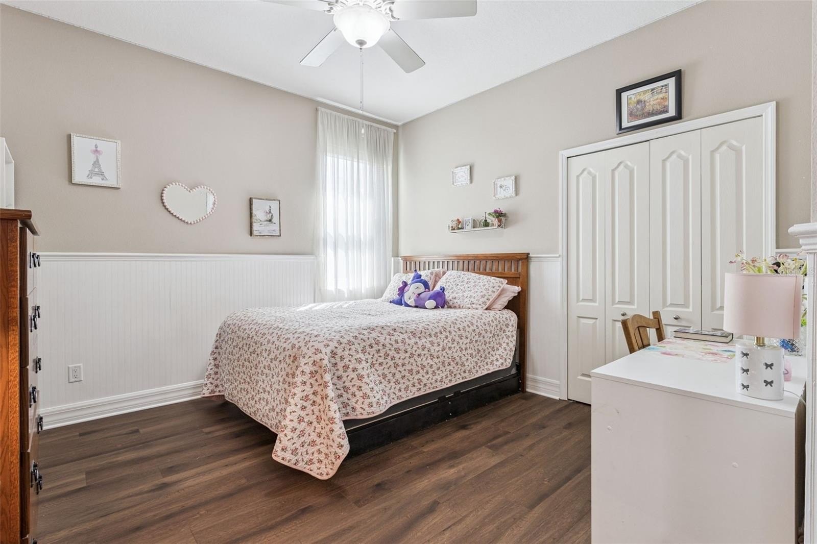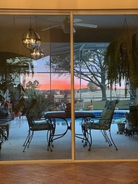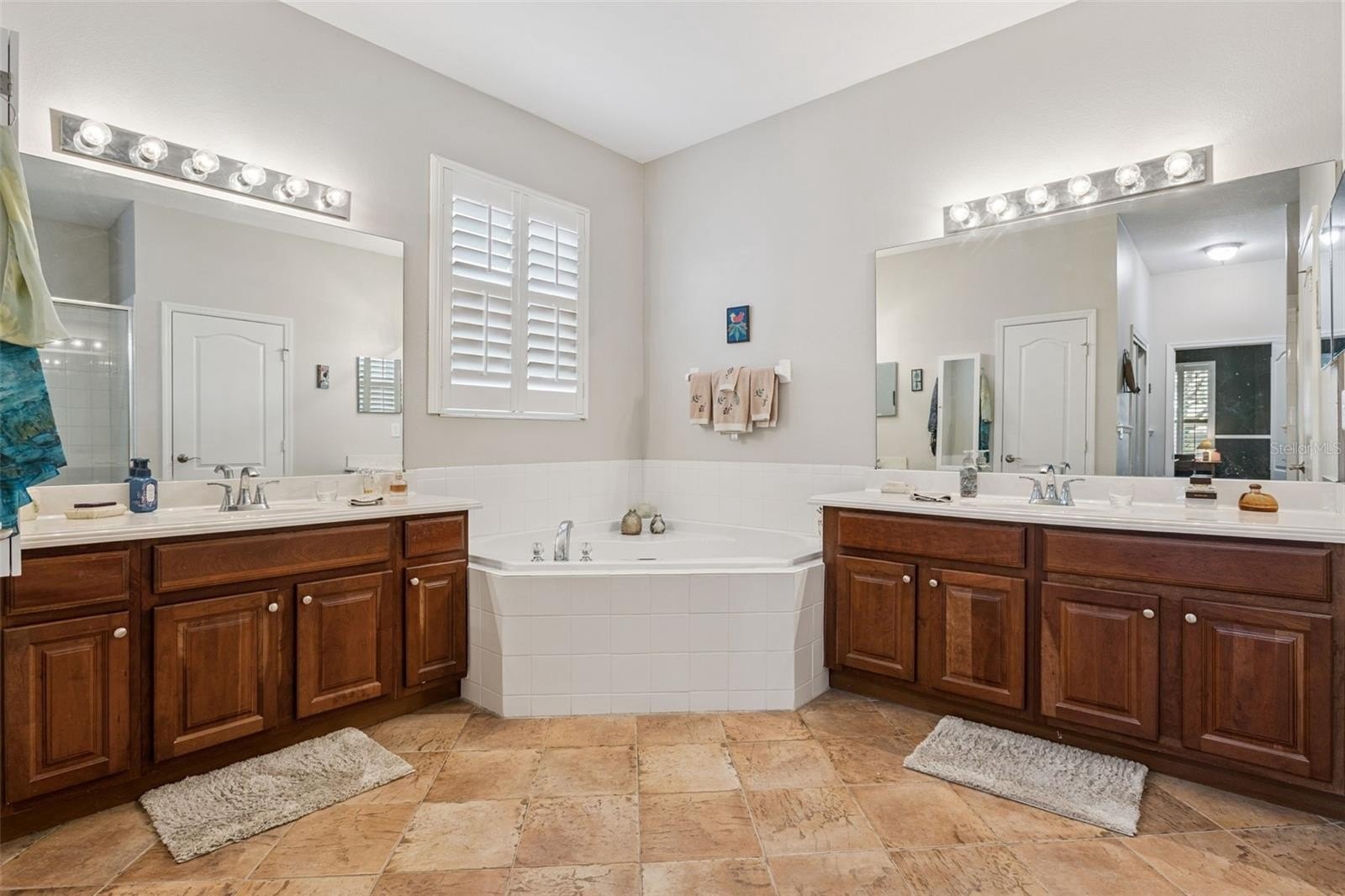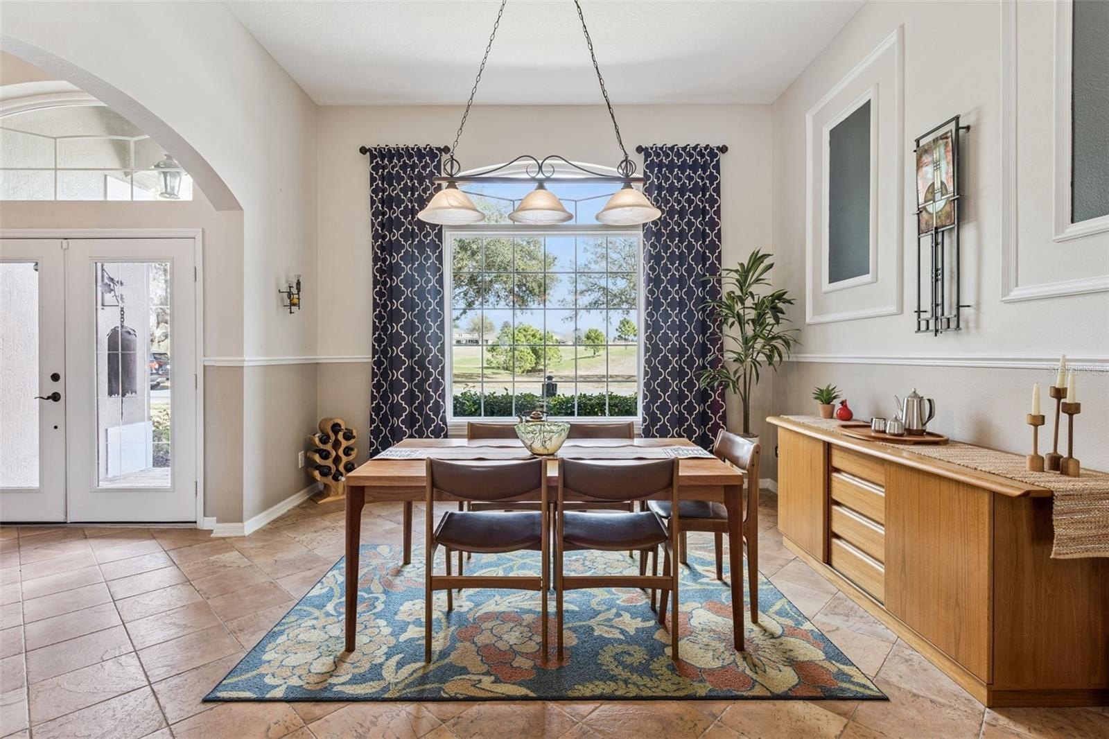 This former model home showcases exceptional quality and thoughtful design at every turn. From the moment you arrive, the paver driveway and walkway set the tone for the elegance found throughout. Double glass entry doors open into a beautifully appointed dining room with arched entryways, a private office featuring glass-paned doors, built-in cabinetry, shelving, and a custom workstation; and a refined living room highlighted by chair rail detailing and decorative millwork. The home flows seamlessly into the spacious family room and gourmet kitchen, complete with solid wood cabinetry, granite counters, a center island, stainless steel appliances, and a generous informal dining area. Ceramic tile flooring runs throughout the main living spaces, while plantation shutters accent most living areas and the primary suite.