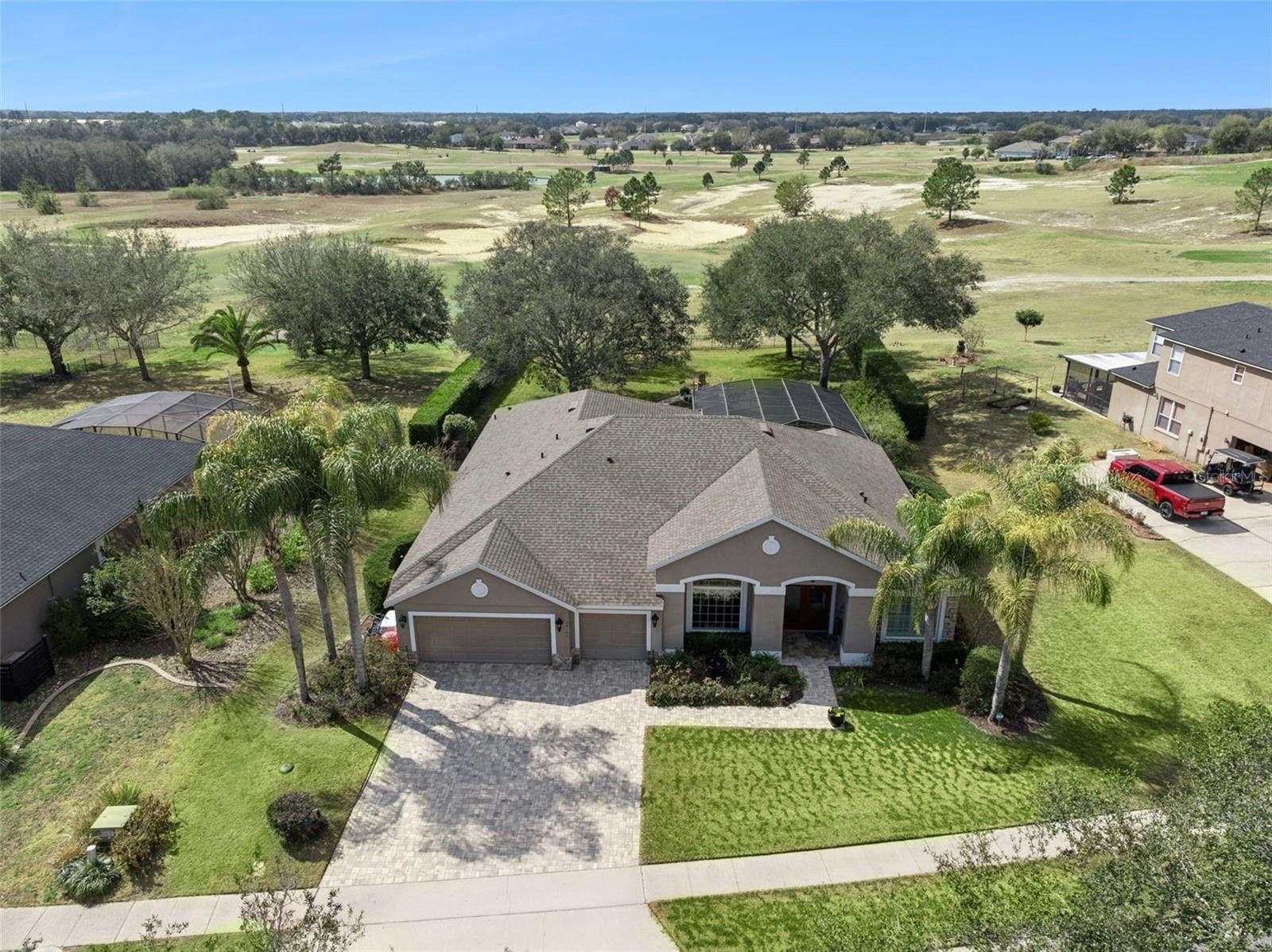 The primary bedroom offers engineered wood flooring, a walk-in closet plus an additional closet, and a luxurious en suite bath with a garden tub, glass-enclosed shower, and dual vanities. Designed for privacy, the home features two separate bedroom wings—one with two bedrooms and a full bath, and the other with a private bedroom and bath, ideal for guests. Outdoor living is just as impressive, with a screen-enclosed lanai showcasing a saltwater pool and spa, an oversized yard with two brick paver sitting areas, and sweeping golf course views with breathtaking sunrises and sunsets. Additional highlights include a three-car garage with built-in cabinetry and a dedicated A/C system, a private irrigation well, a whole house generator installed in August 2021, and a new roof installed in January 2021. Other upgrades include new windows in April 2023, new irrigation well pump in March 2022, washer and dryer in March 2021, stove June 2021, refrigerator March 2022, microwave August 2023, granite in May 2024 and new AC in February 2026. Located in a private community offering a fitness center, basketball, tennis, and a community pool—as well as golf access at Eagle Dunes Golf Club—this home offers a feeling of community where people take walks, ride bikes, play tennis, swim, golf, and enjoy the security and privacy of a guarded and gated neighborhood. Schedule your private showing today and experience it for yourself.