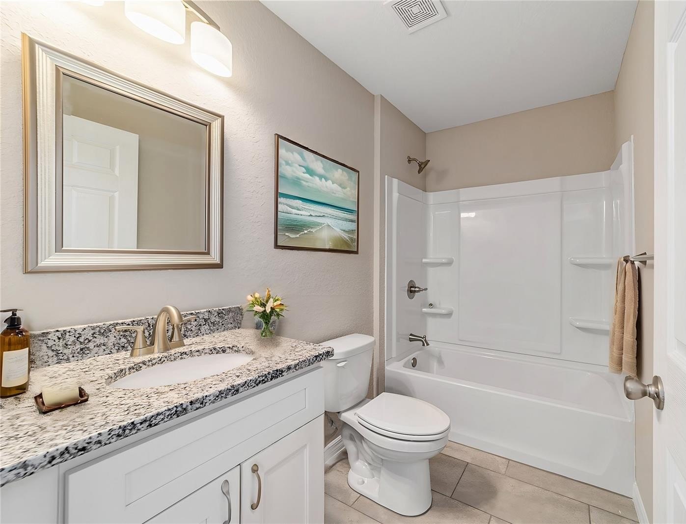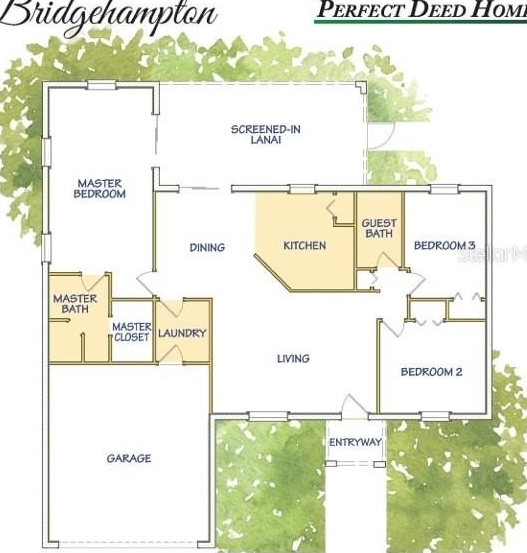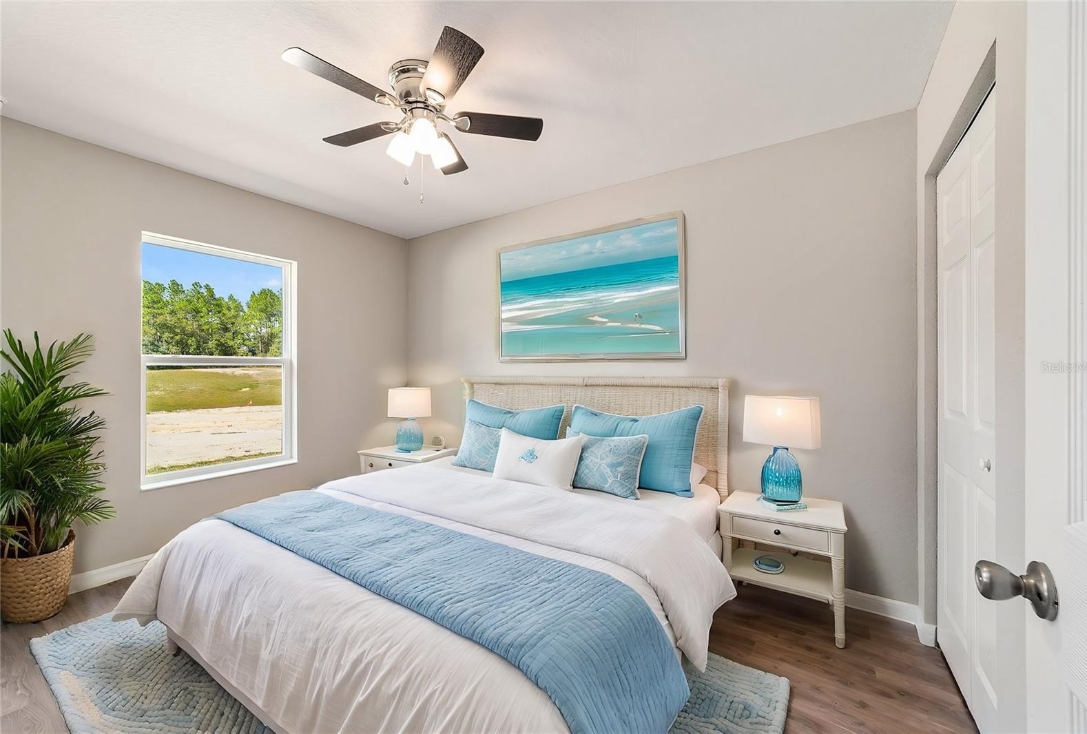 One or more photo(s) has been virtually staged. Under Construction. Buyer assistance program offering $75,000 or $100,000 in funds towards purchasing this home; limited availability. Mature backyard trees provide year-round comfort in the no-HOA community of Marion Oaks. This award-winning 3-bedroom, 2-bath concrete block home features 11-foot cathedral ceiling in the living room and kitchen, oversized master bedroom featuring tray ceiling, large walk-in closet, double vanity sinks, and French doors leading to a 12' x 24' screened-in patio with dual ceiling fans...all standard. Granite countertops and wood cabinetry are featured throughout kitchen and bathrooms, including the kitchen’s 8 ft counter that is ideal for entertaining. Full stainless appliance package, a finished two-car garage with sealed floor, and for comfort of mind, a 2-10 Home Buyer’s Warranty.
