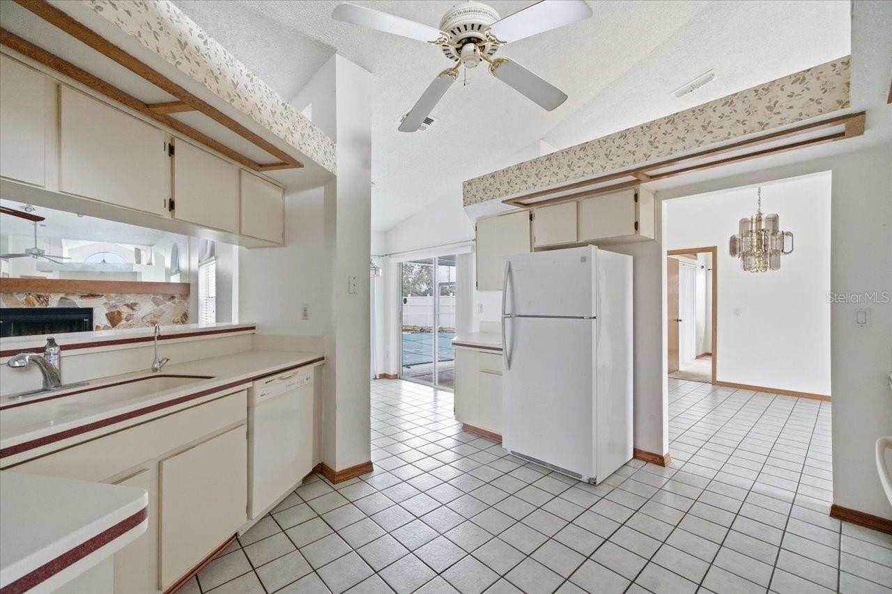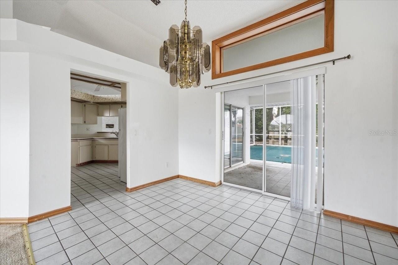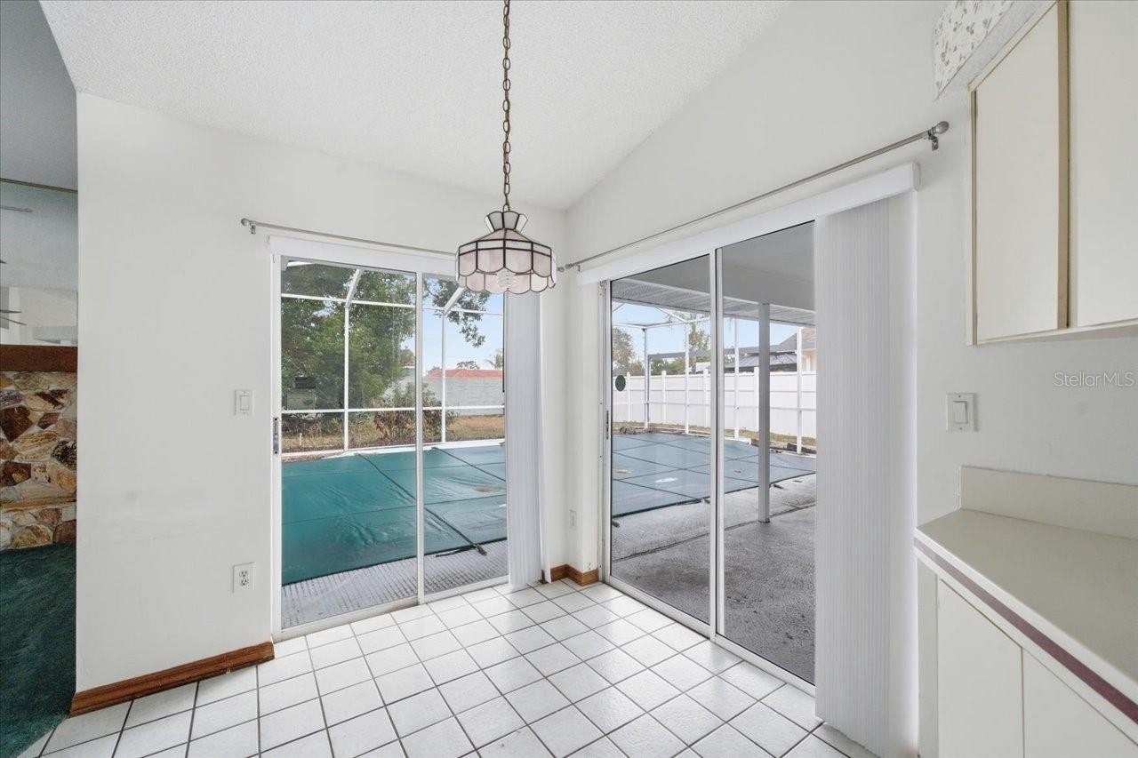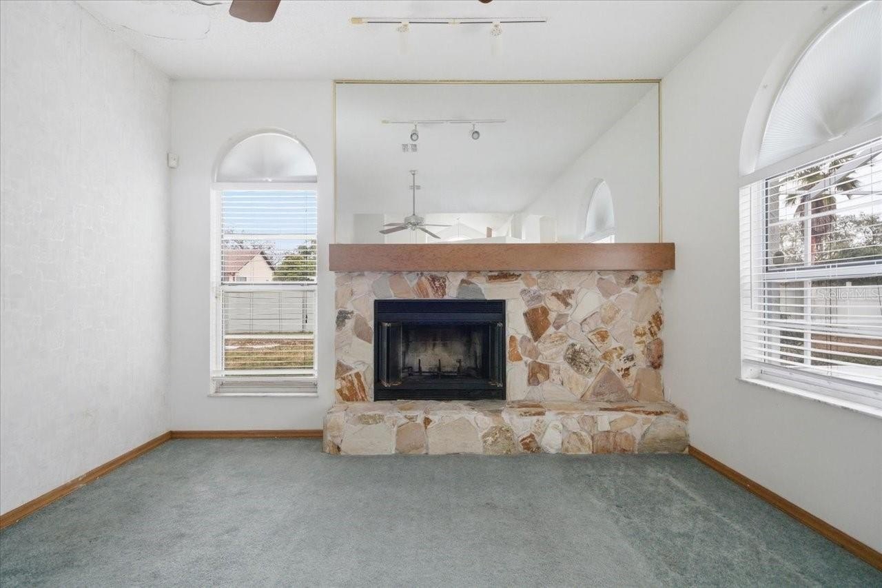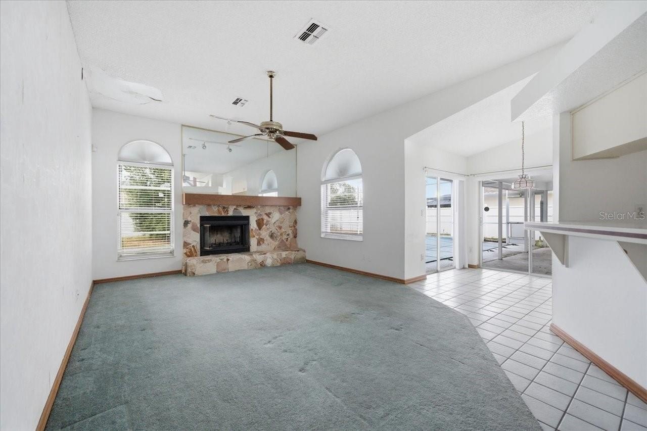 The inviting family room showcases a charming wood-burning fireplace and sliding glass doors that open to a covered lanai, seamlessly blending indoor and outdoor living. Step outside and enjoy your private pool — perfect for relaxing or hosting gatherings year-round.