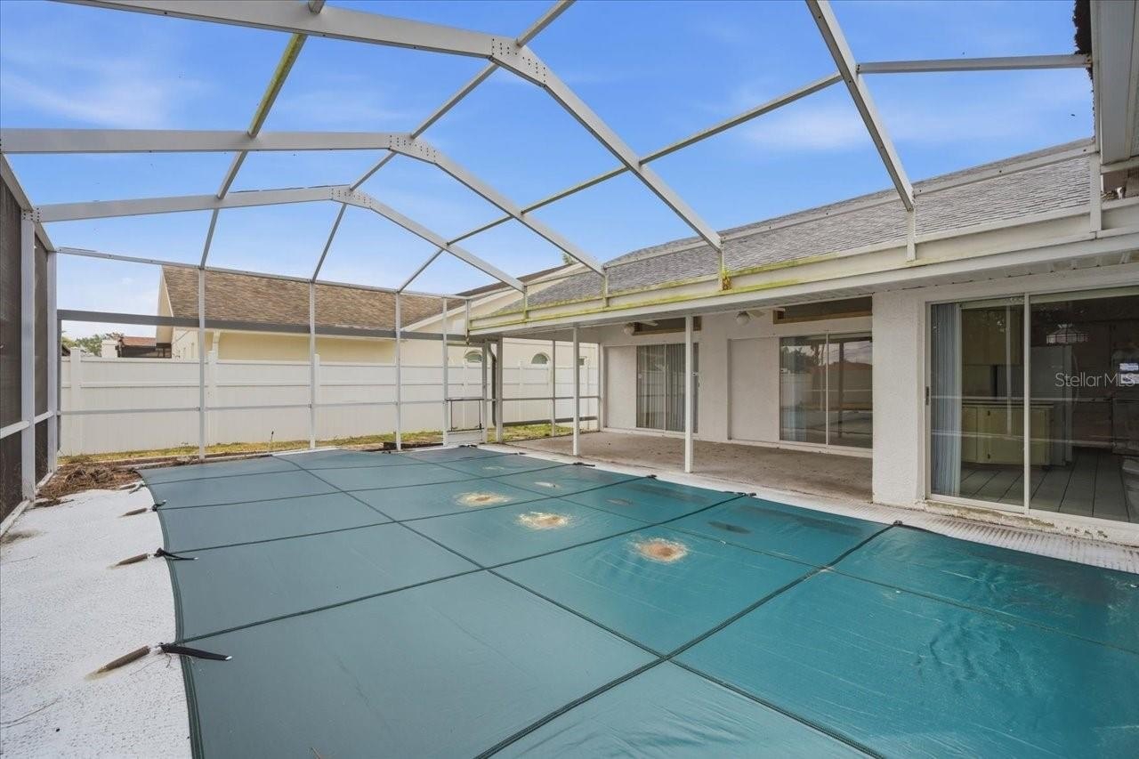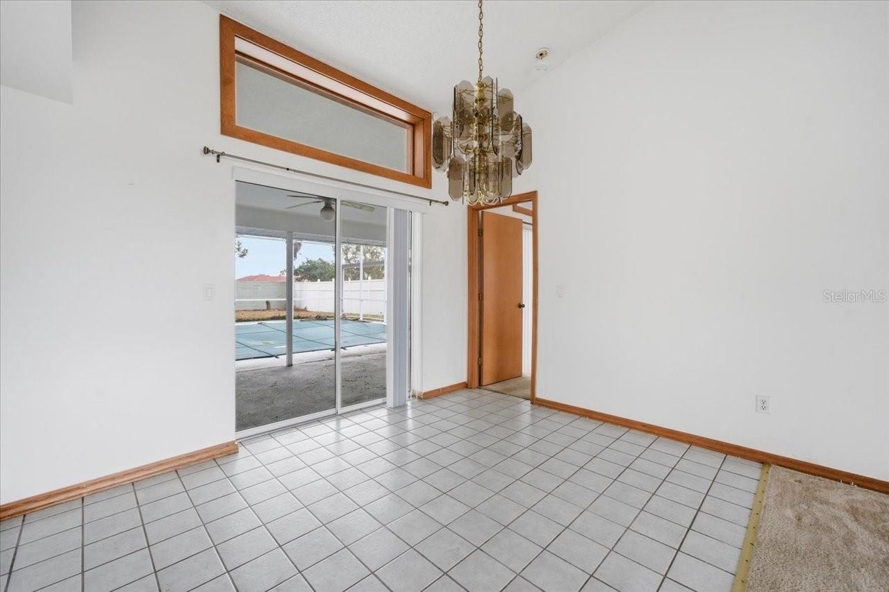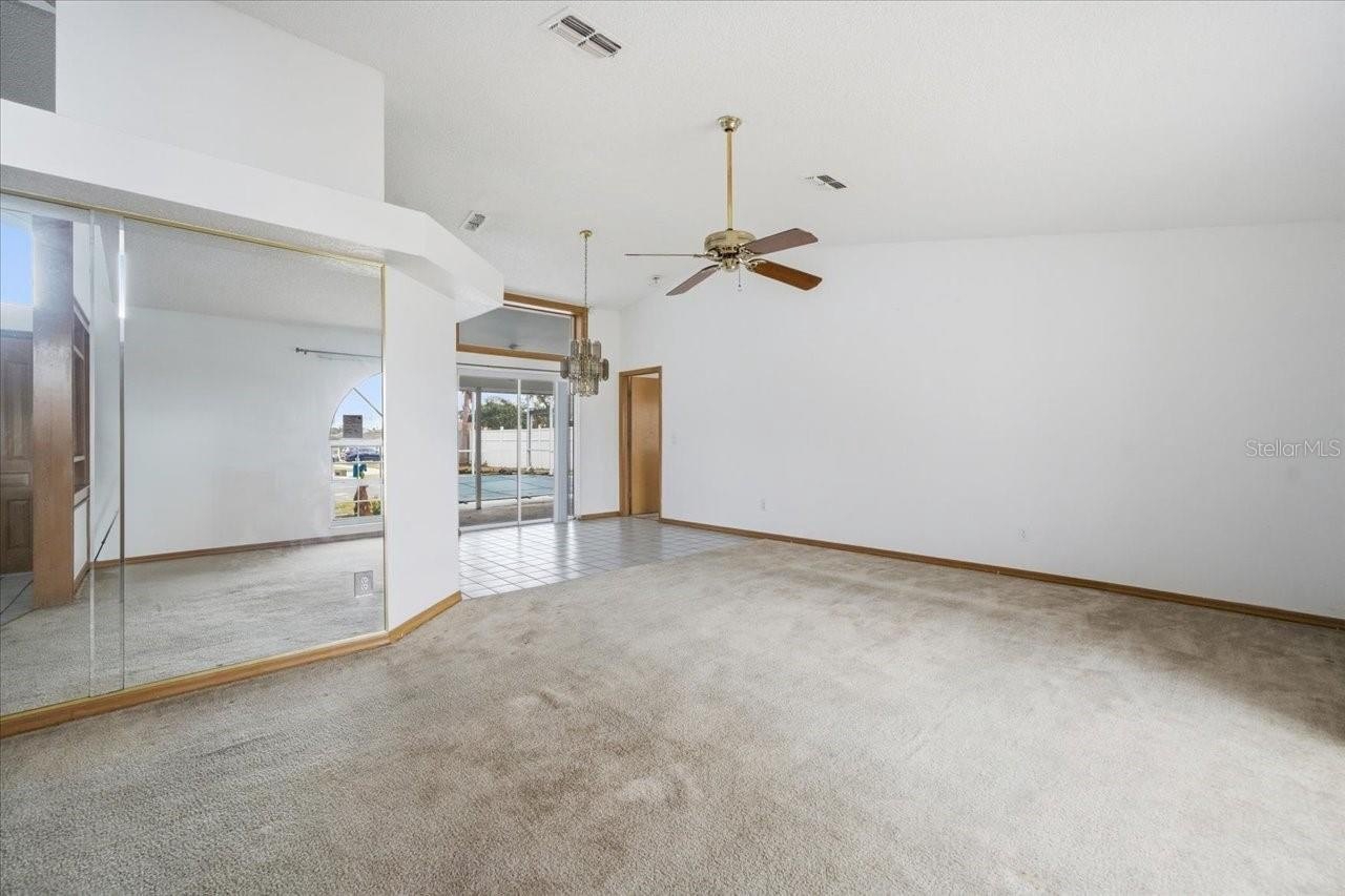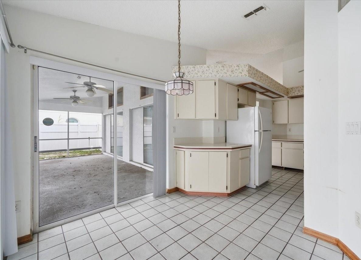 The inviting family room showcases a charming wood-burning fireplace and sliding glass doors that open to a covered lanai, seamlessly blending indoor and outdoor living. Step outside and enjoy your private pool — perfect for relaxing or hosting gatherings year-round.
