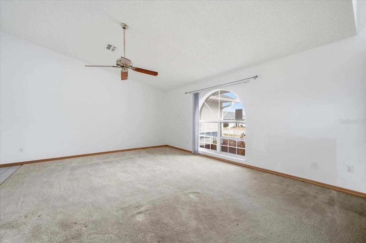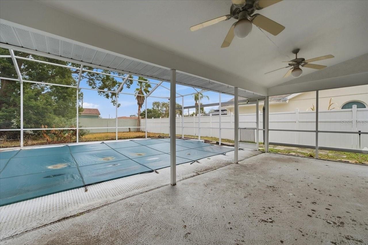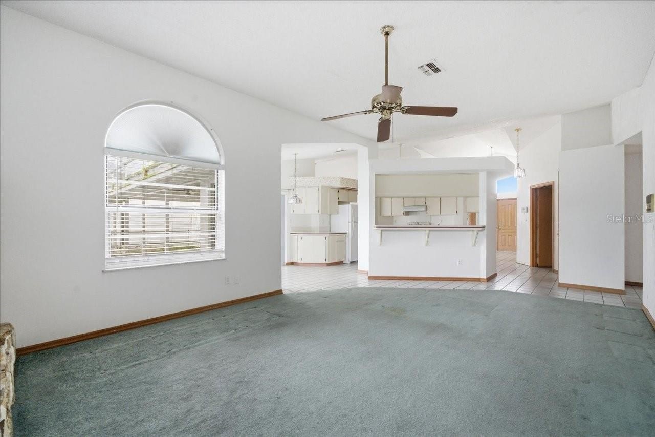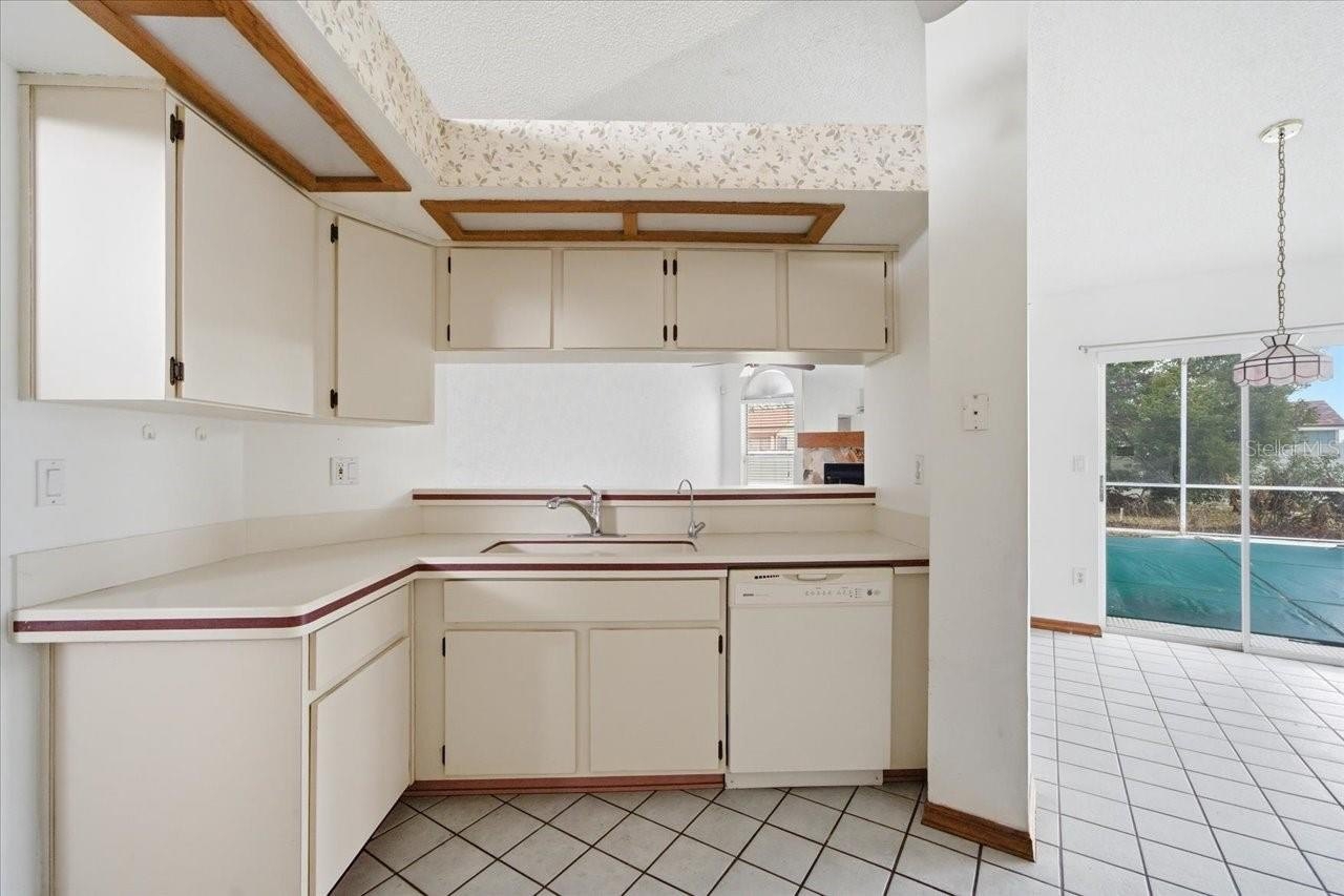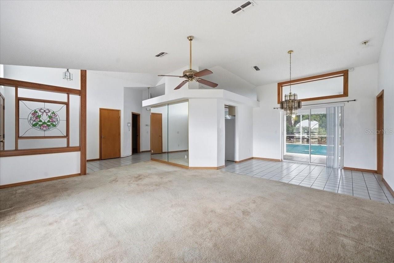 The inviting family room showcases a charming wood-burning fireplace and sliding glass doors that open to a covered lanai, seamlessly blending indoor and outdoor living. Step outside and enjoy your private pool — perfect for relaxing or hosting gatherings year-round.
