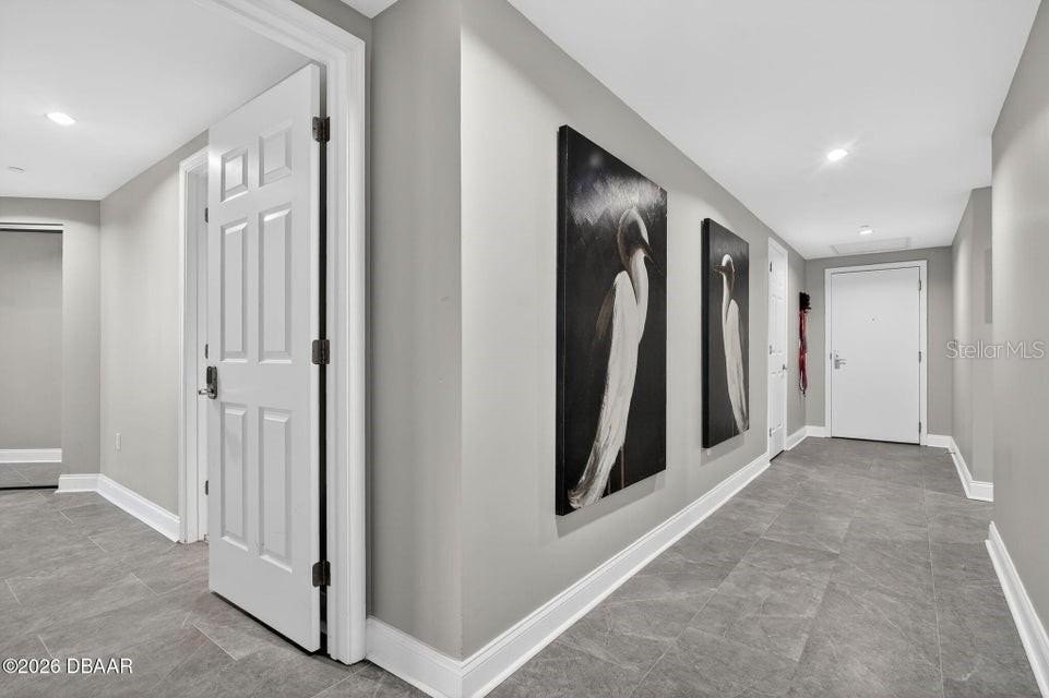 The primary suite is a true private retreat featuring stunning water views, a spa inspired bathroom with dual sinks, luxurious tile floors and countertops, a jetted soaking tub, a spacious enclosed shower, and a large custom walk-in closet. The second and third bedrooms are generously sized, each offering magnificent views of the Halifax River and Atlantic Ocean along with custom closet systems and built-in cabinetry for ample storage.
