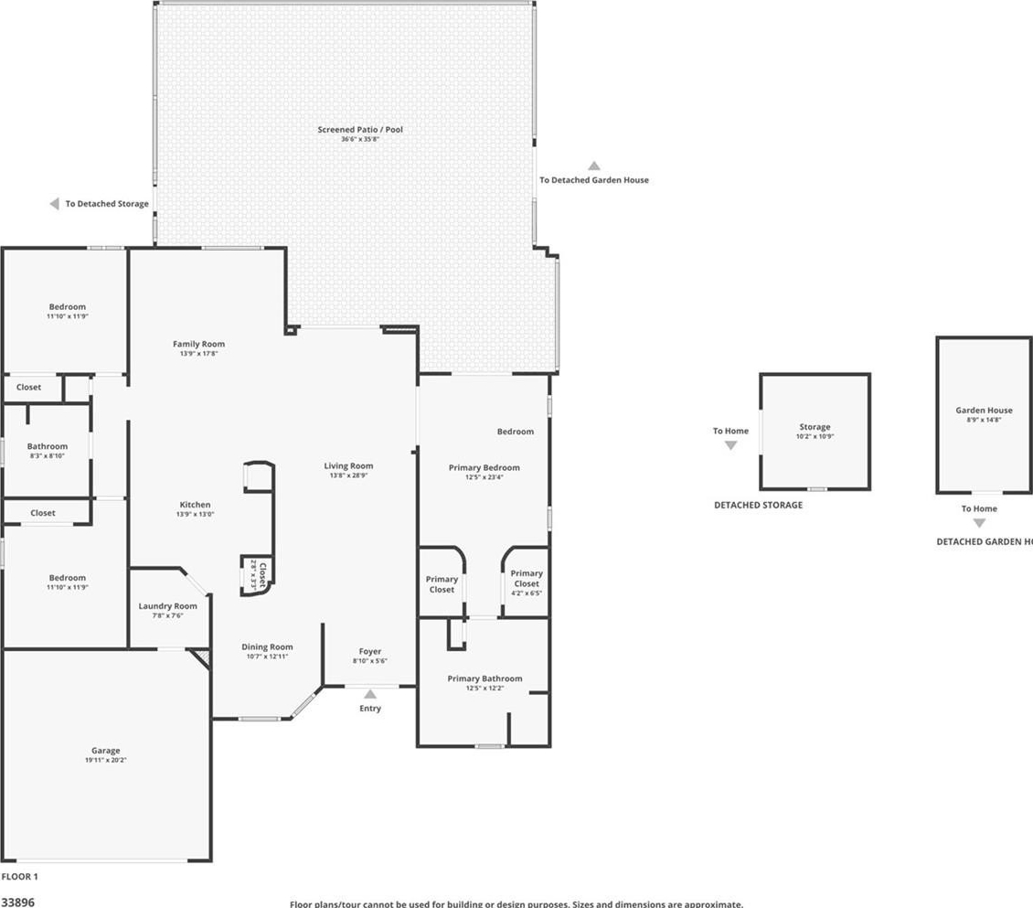 The primary suite features sliding glass doors to the lanai, walk-through closets, and a bath with