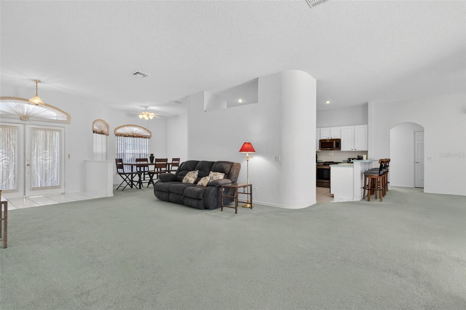 room, arched doorways, and plant shelves throughout. The kitchen offers abundant cabinet