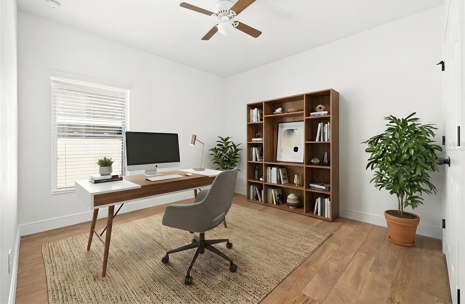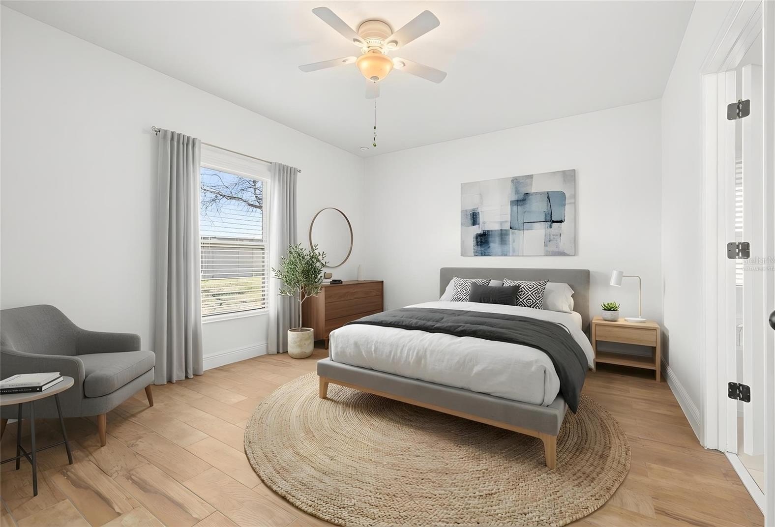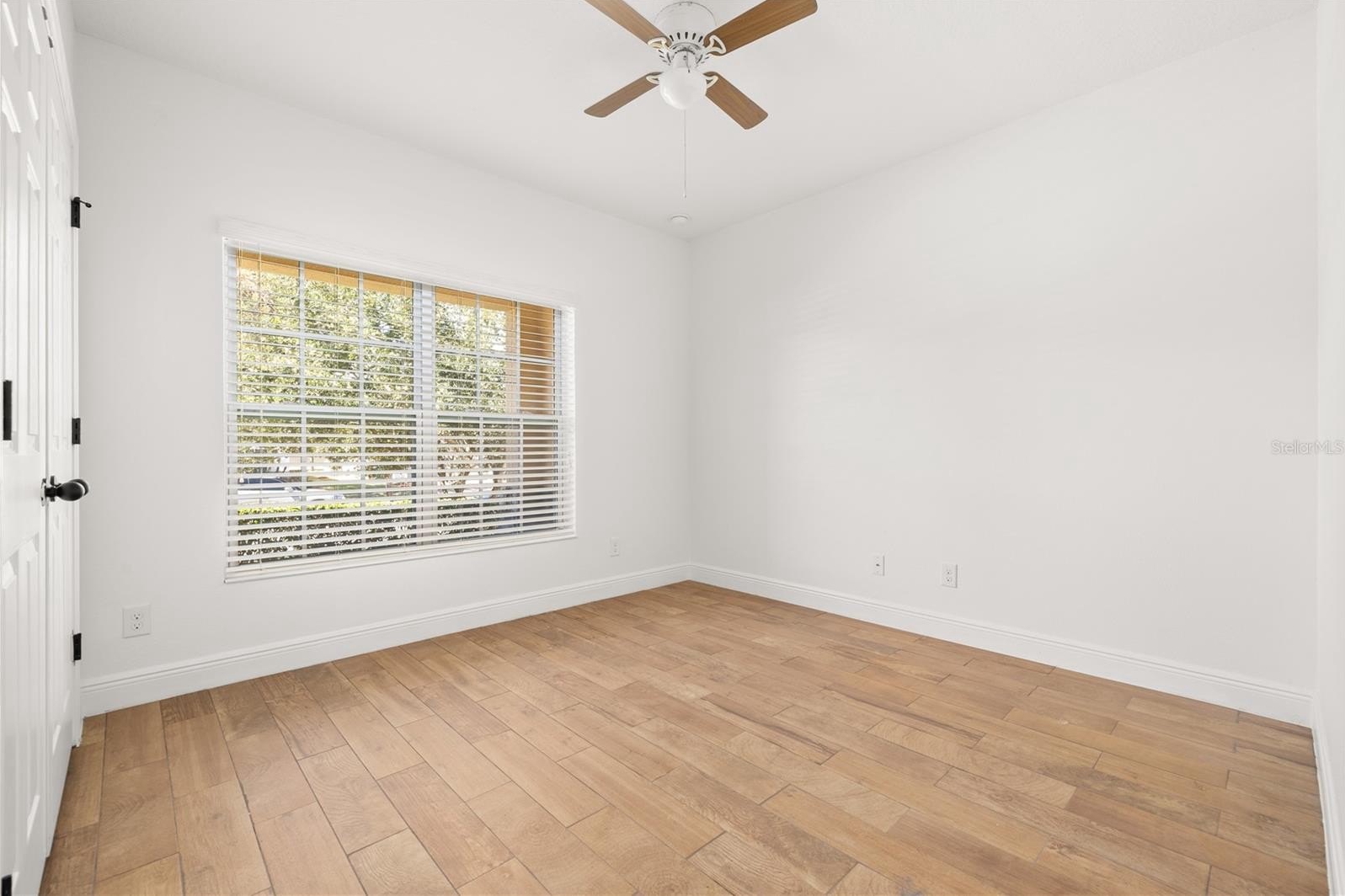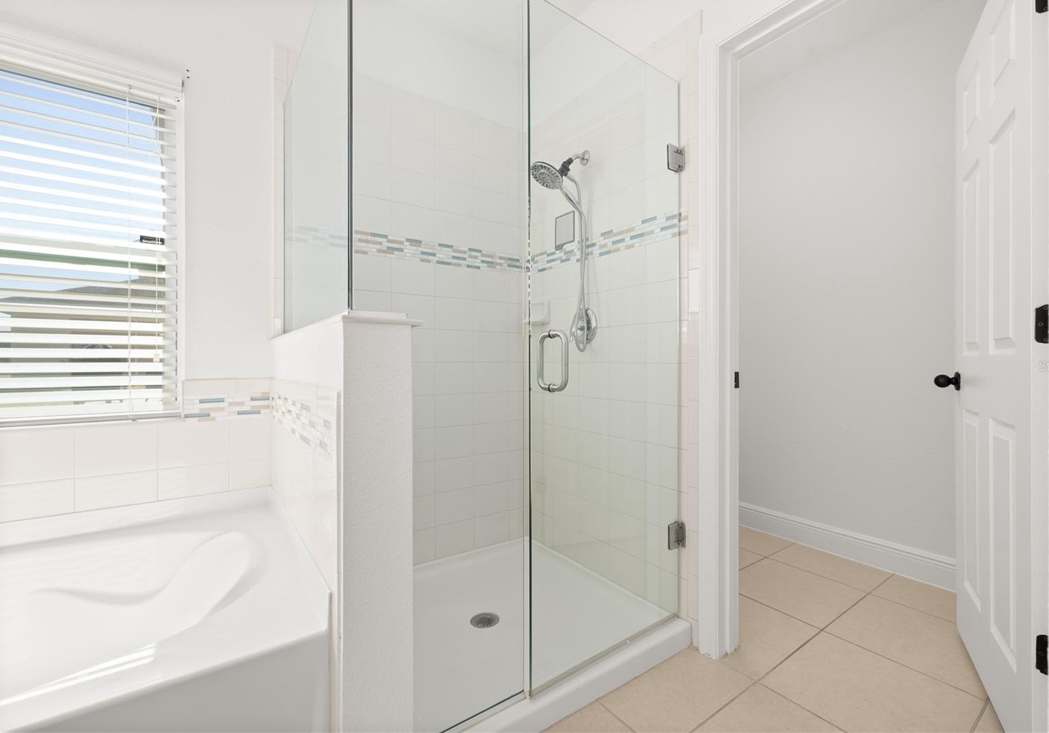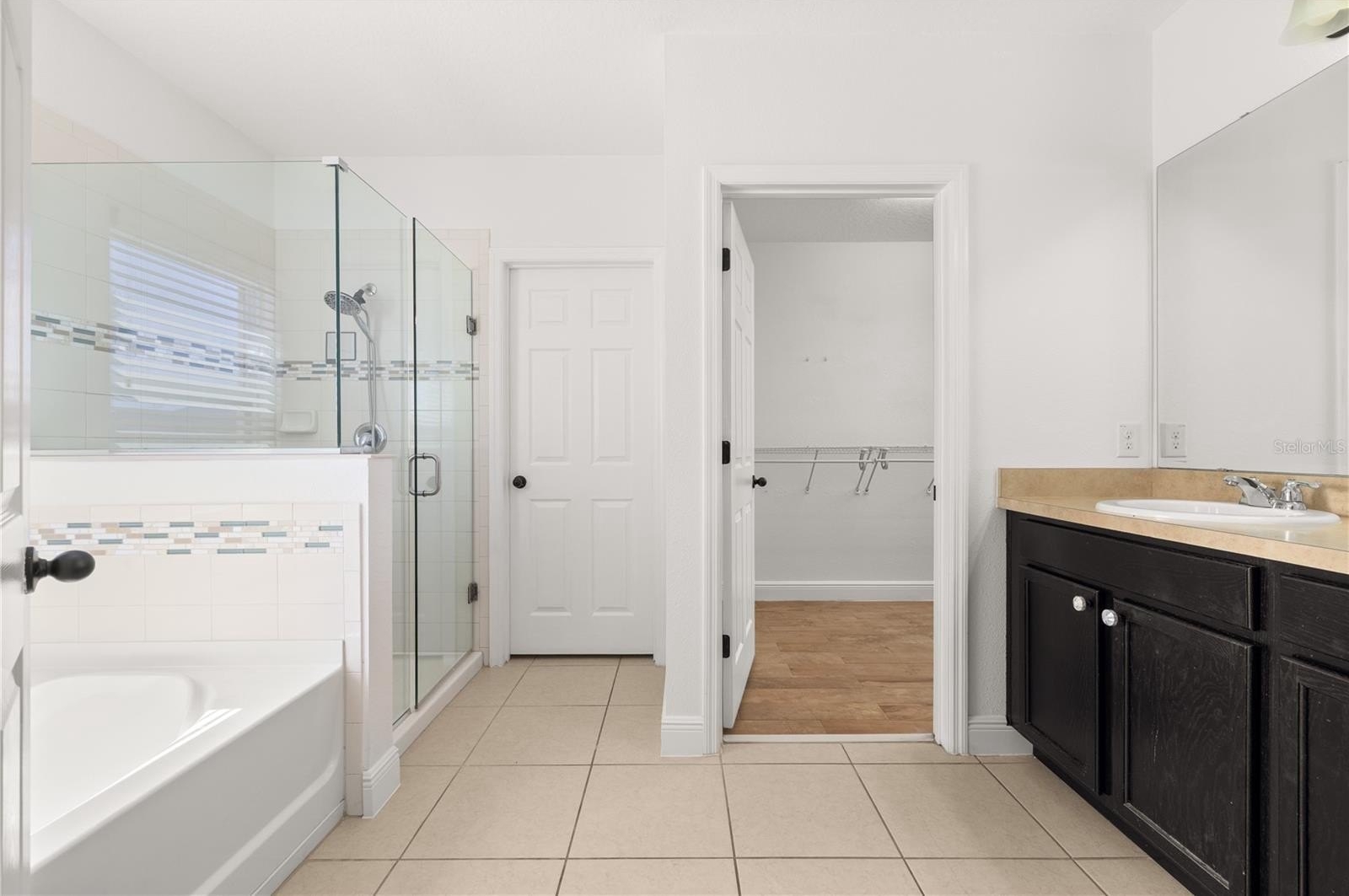 All bedrooms boast wood-look tile flooring, and the primary bedroom has a generous walk-in closet, and an ensuite bath complete with dual sinks, large vanity, private water closet, tiled shower with glass enclosure, and a relaxing garden tub with decorative tile accents. Wood-look tile flooring continues throughout the home, offering durability and a clean, modern feel.