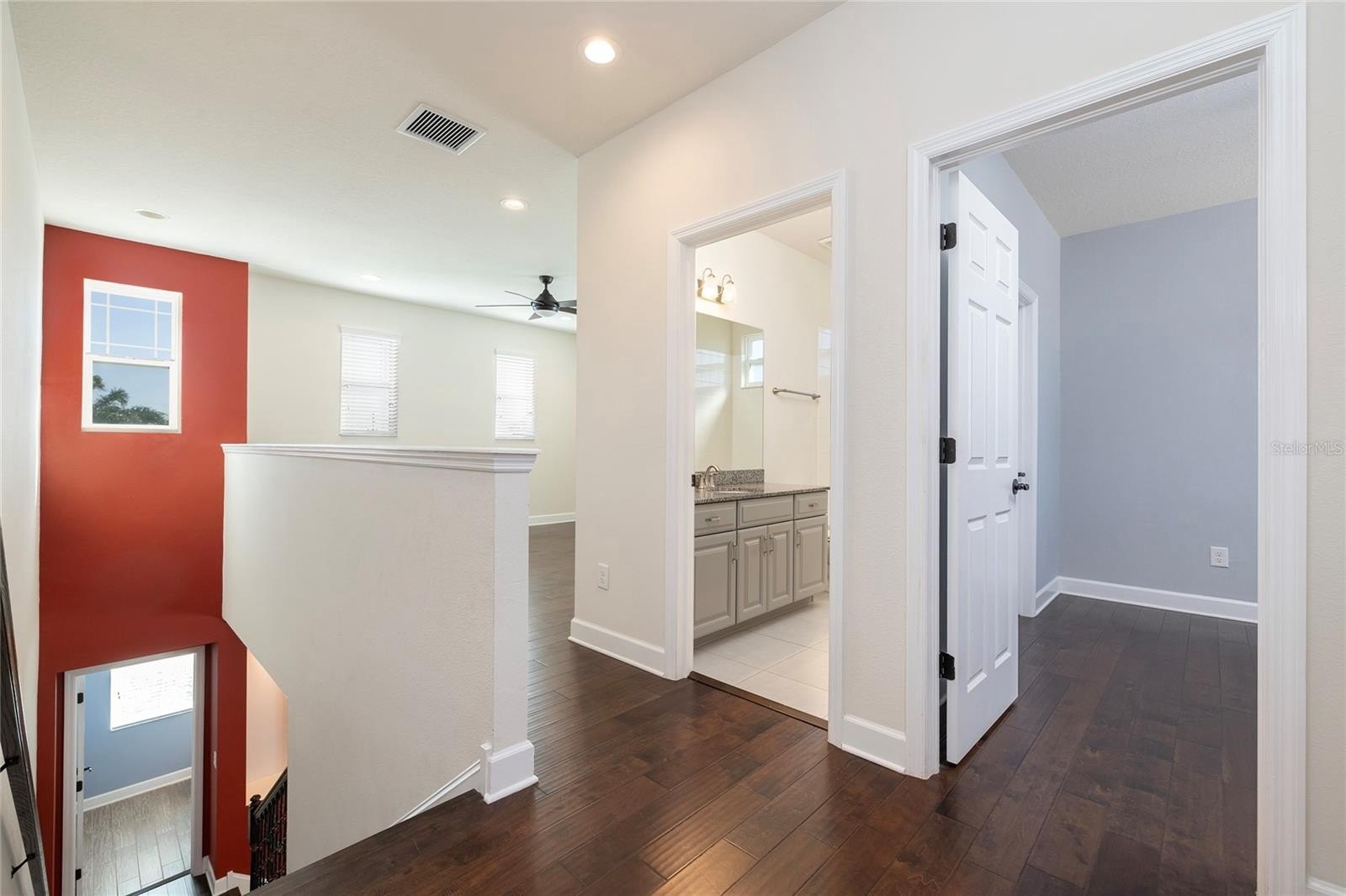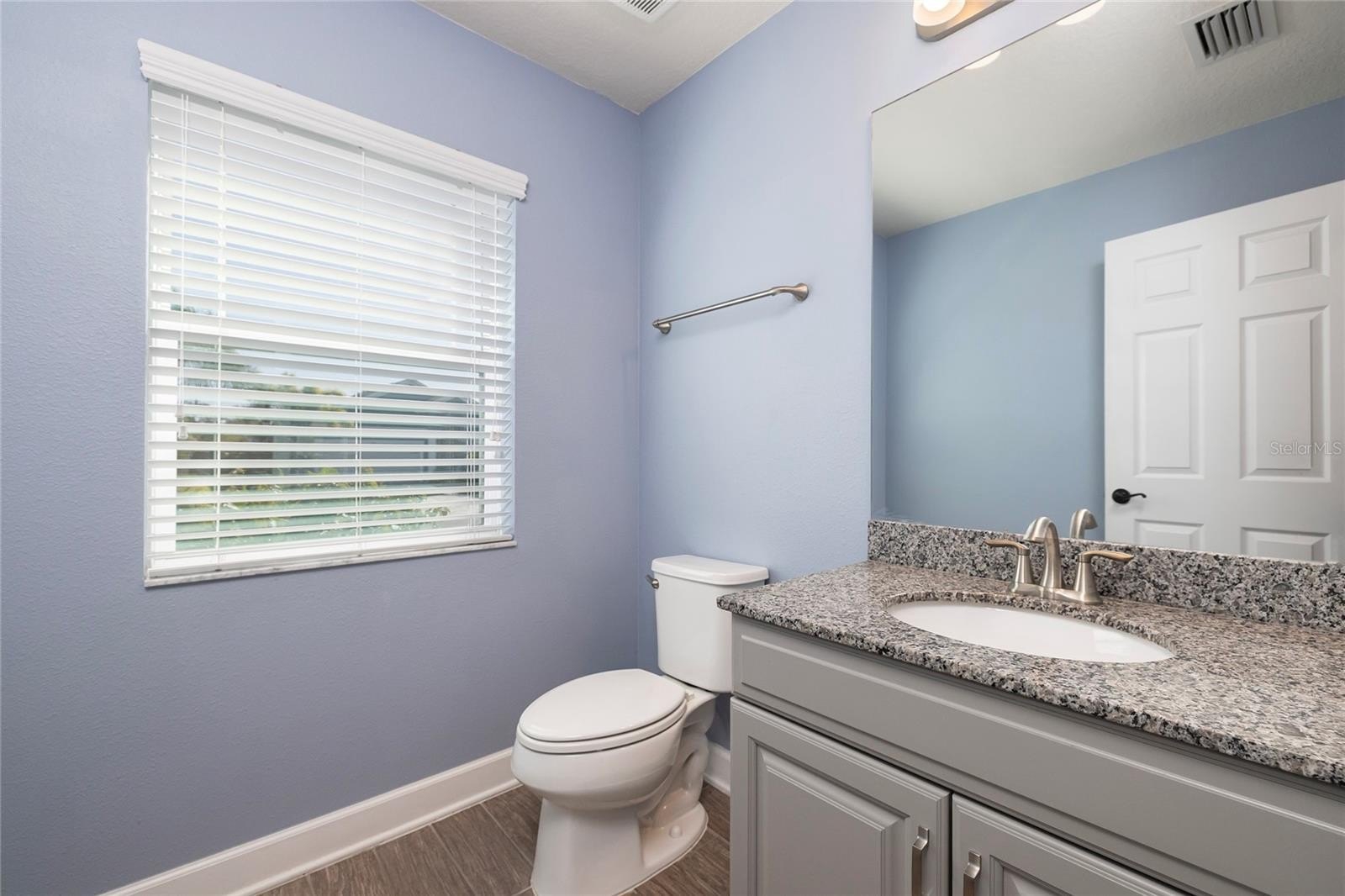 The ground-floor primary suite provides a private retreat with his-and-hers walk-in closets and a spa-inspired bathroom featuring a walk-in shower. Wood plank tile flooring flows throughout the first floor, while hardwood floors enhance the second level, creating warmth and timeless appeal.