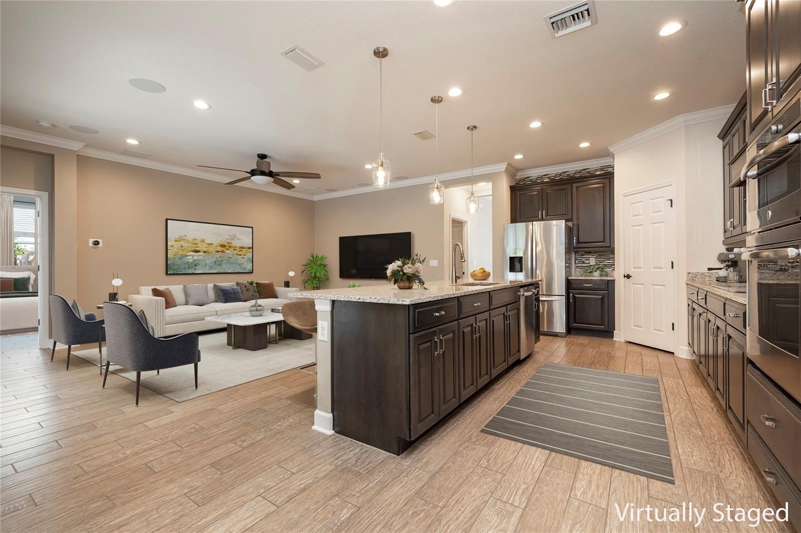 At the heart of the home is a beautifully appointed kitchen designed for both entertaining and everyday living. Highlights include stainless steel appliances, a French-style refrigerator, double ovens, glass-top induction range, granite countertops, espresso glass cabinetry, soft-close hinges and drawers, and an enormous center island with breakfast bar. Storage abounds with multiple walk-in closets throughout the home.