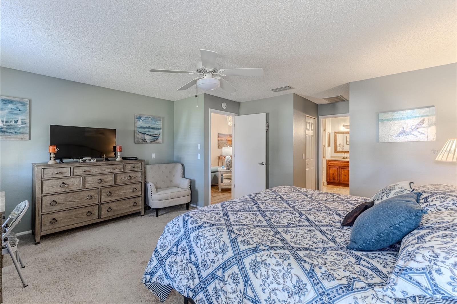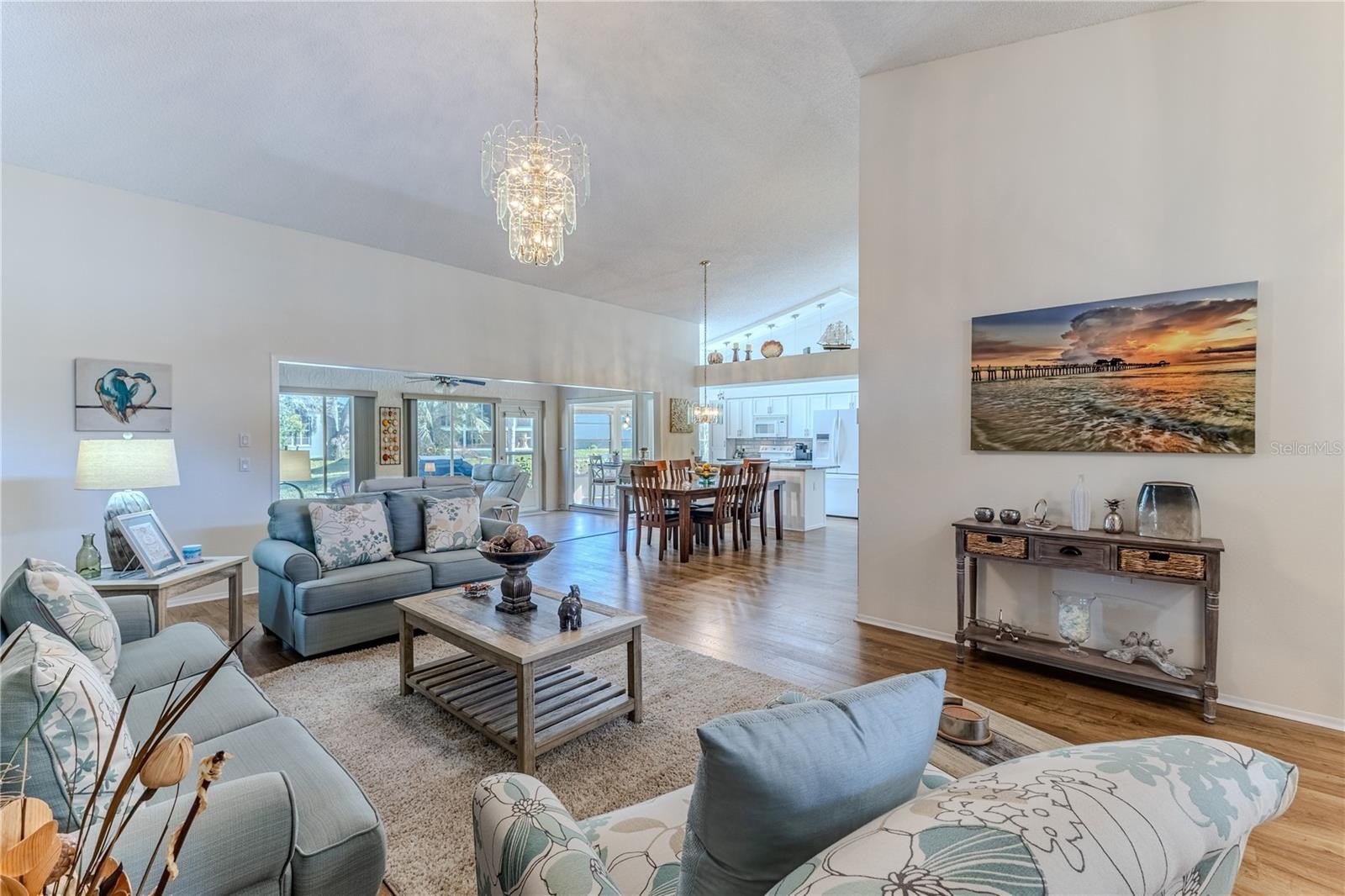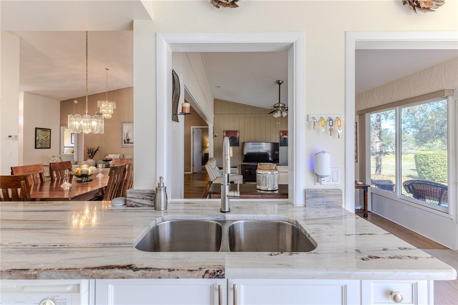 Desirable end-unit villa offering 2 bedrooms, 2 bathrooms, and a spacious 2-car garage is furnished and includes the golf cart. The vaulted ceilings in the living and dining room combination create an open, airy feel, complemented by elegant chandeliers and wood-look laminate flooring throughout the main living areas. The beautifully updated kitchen features white cabinetry, granite countertops, designer pendant lighting, closet pantry plus an additional storage pantry, and a bright eat-in area overlooking the retention area and golf course. The extended family room offers additional living space and includes a ceiling fan for comfort. Step outside to enjoy peaceful golf course views from your private rear patio, complete with a concrete pad ideal for grilling and outdoor furnishings. The guest suite is thoughtfully positioned at the front of the home and can be closed off with a pocket door for privacy. It features an updated full bathroom with a stylish vanity, tile flooring, and a tub/shower combination. The guest bedroom includes an oversized walk-in closet offering exceptional storage space. The primary bedroom overlooks the serene backyard and includes two large walk-in closets and a ceiling fan. The primary bath features a spacious walk-in shower with dual showerheads, dual sink vanity, linen closet, wood cabinetry, and beautiful tile flooring. Additional highlights include an interior laundry room with utility sink, washer and dryer included, and shelving for storage. The garage offers built-in shelving, a workbench, pull-down attic access, and a convenient side service door for easy entry. Roof 2020. HVAC 2017. A note for the animal lovers - this village is a no-dog zone. Maintenance covers exterior painting, irrigation, lawnmowing, front hedge trimming, lawn fertilization, cable tv, internet, village pool -- simplifying ownership and freeing up your time. Timber Pines is an award-winning, guard-gated, 55+ community, where residents enjoy three 18-hole golf courses, a 9-hole pitch & putt, 12pickleball courts, tennis, two community pools, a country club restaurant and bar, fitness center, performing arts, billiards, and over 100social clubs and activities. The villa offers a peaceful, beautiful view and an easy-care lifestyle.