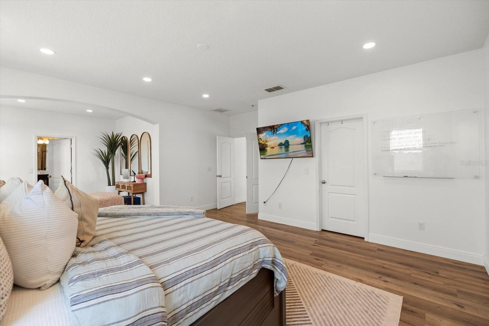 Inside, the architecture is clean and intentional, with wide-plank flooring, expansive natural light, and an open layout designed for seamless entertaining. At the center of the home is a true six-figure custom kitchen renovation featuring slim white oak solid wood cabinetry, concealed pantry integration, Taj Mahal quartzite countertops, a dramatic waterfall-edge island, built-in wall ovens, and curated designer finishes.