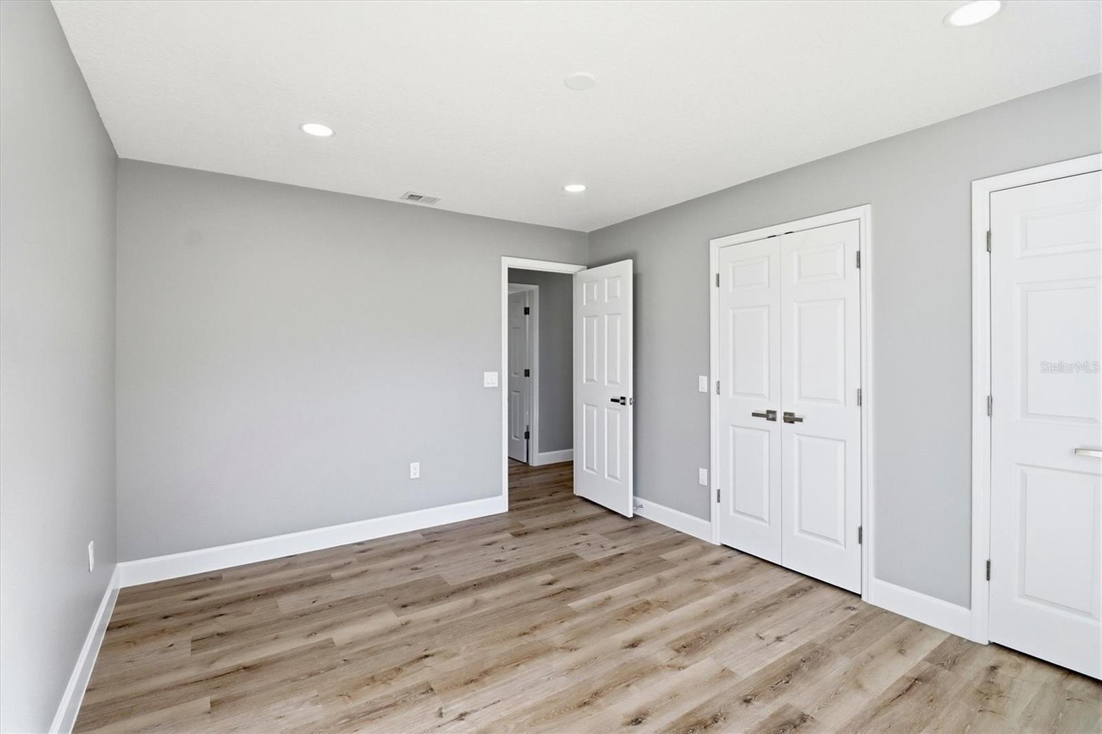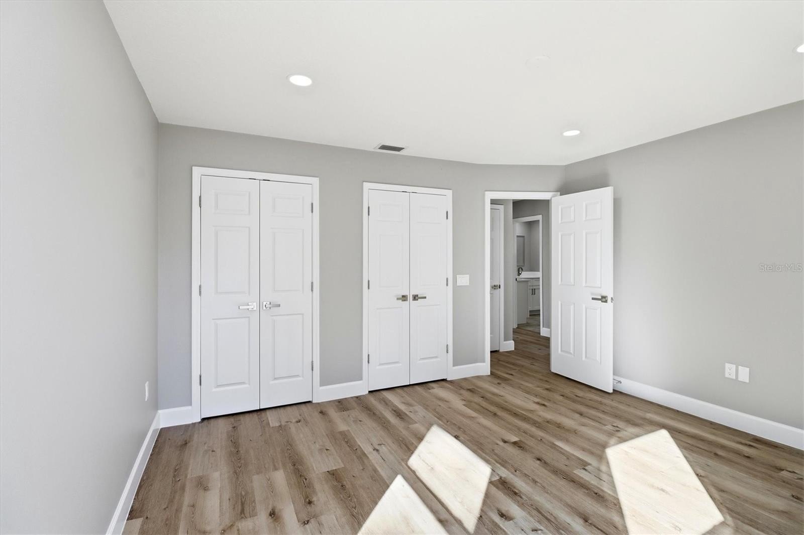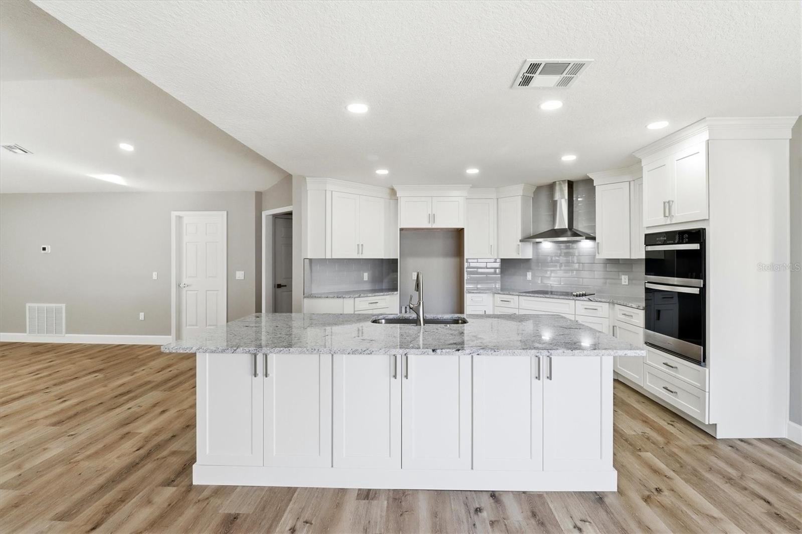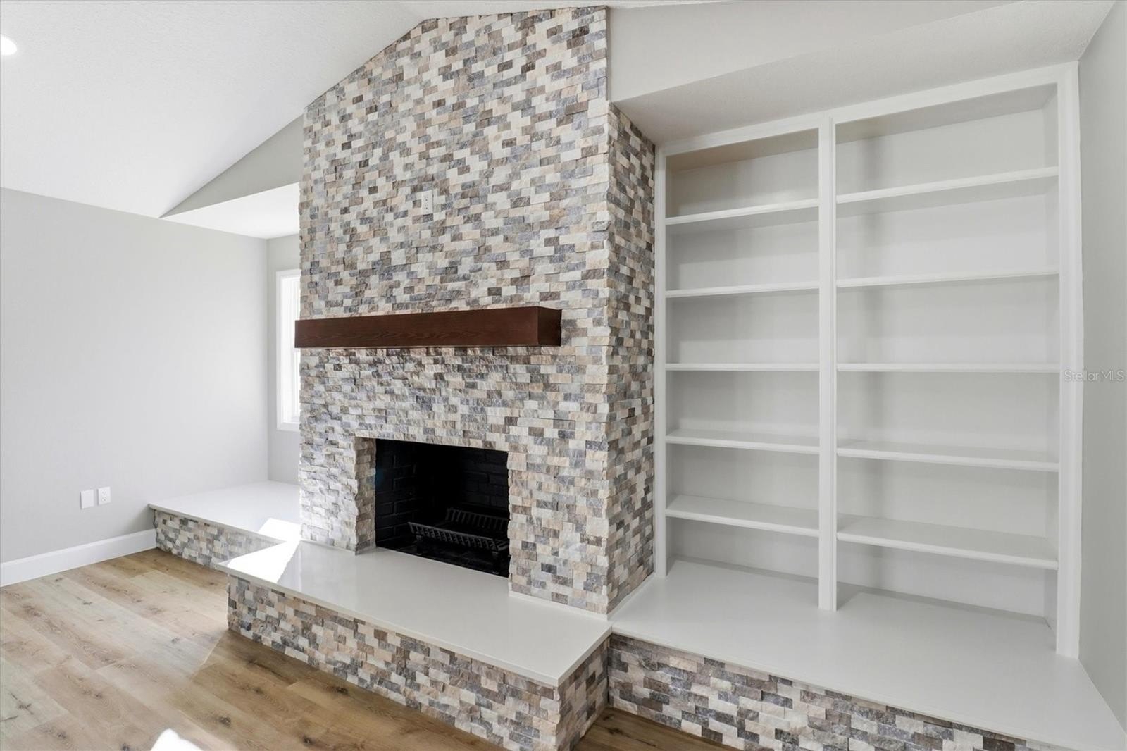 The kitchen showcases granite countertops, custom cabinetry, and built-in shelving, flowing seamlessly into open living and dining spaces. Bathrooms feature quartz countertops and modern fixtures, while every bedroom is spacious and bright. Custom shelving throughout adds storage and functionality.