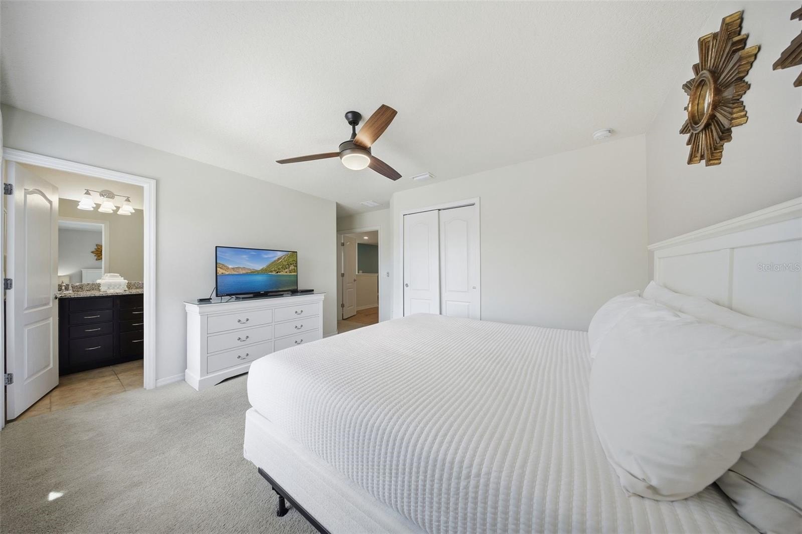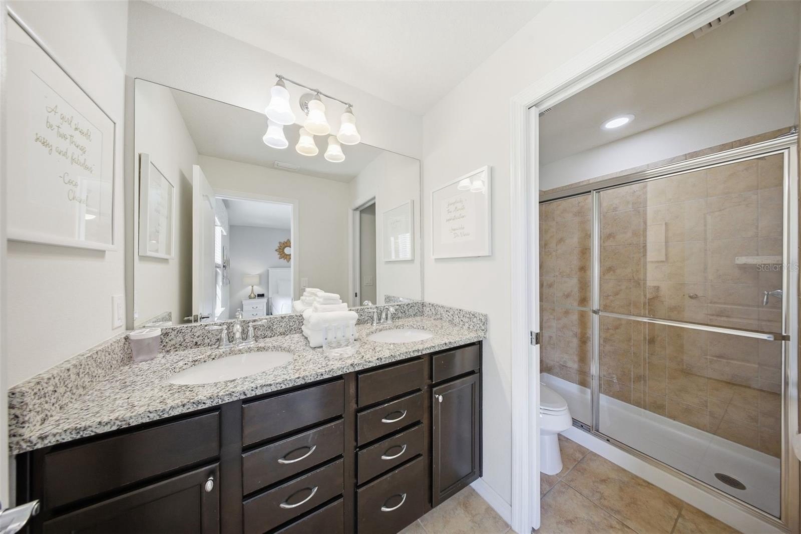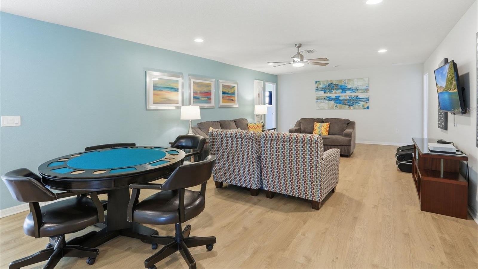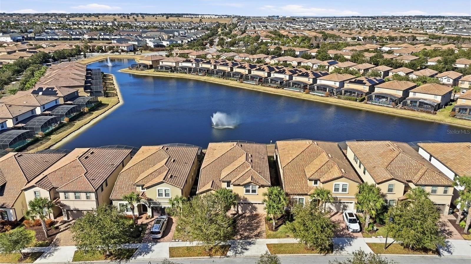 Inside, the expansive open-concept design creates a seamless flow between the kitchen, dining, and main living areas — ideal for entertaining large groups. The oversized upstairs loft provides an additional gathering space perfect for movie nights, gaming, or relaxing after long days at the parks. Constructed in 2017, this residence embodies the Florida resort lifestyle. Step outside to your private heated pool and spa, perfectly positioned to capture sweeping lake views — one of the most sought-after settings within the community. Whether hosting guests or enjoying a quiet sunset, the outdoor space delivers both privacy and a true vacation atmosphere.