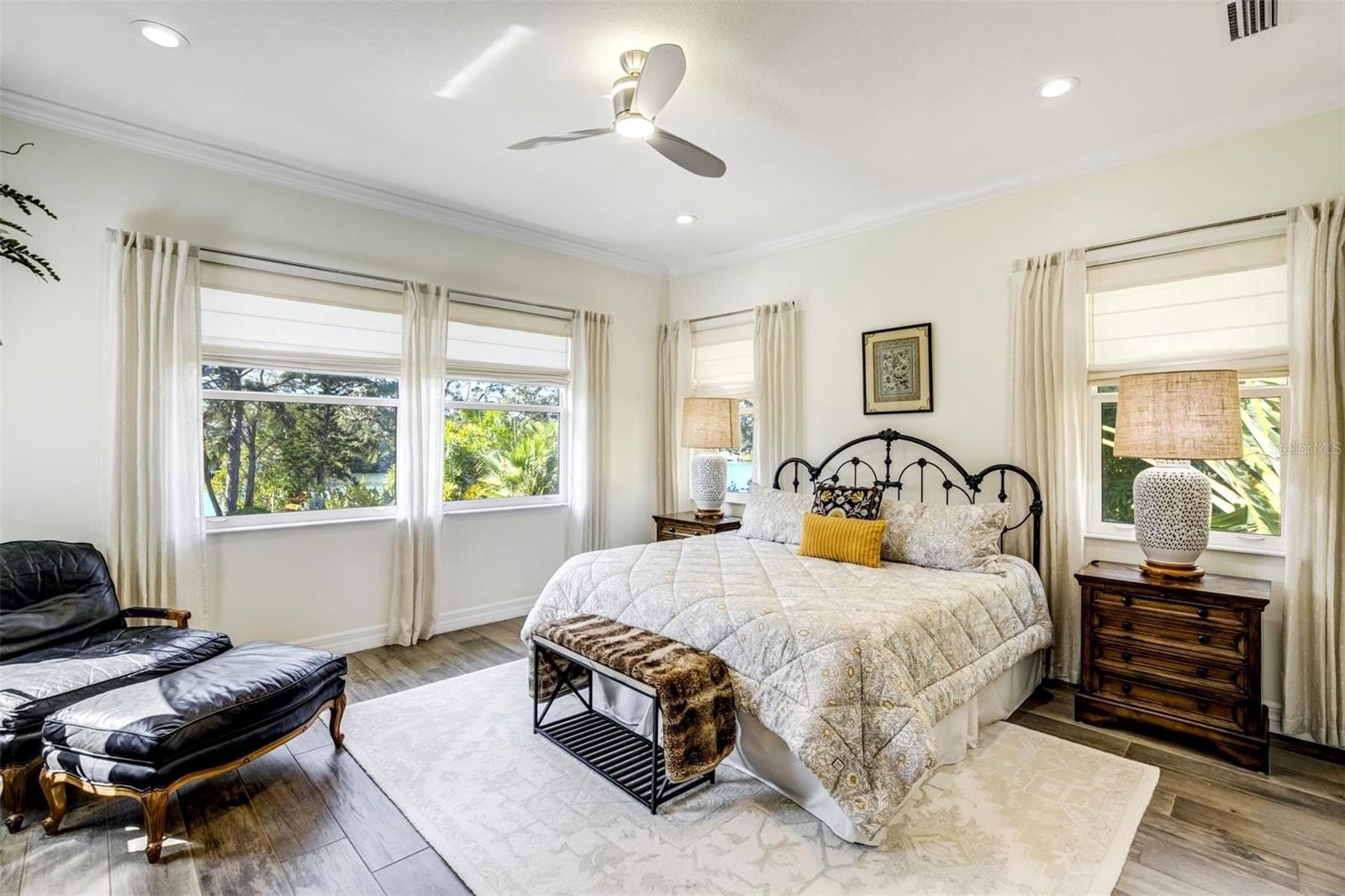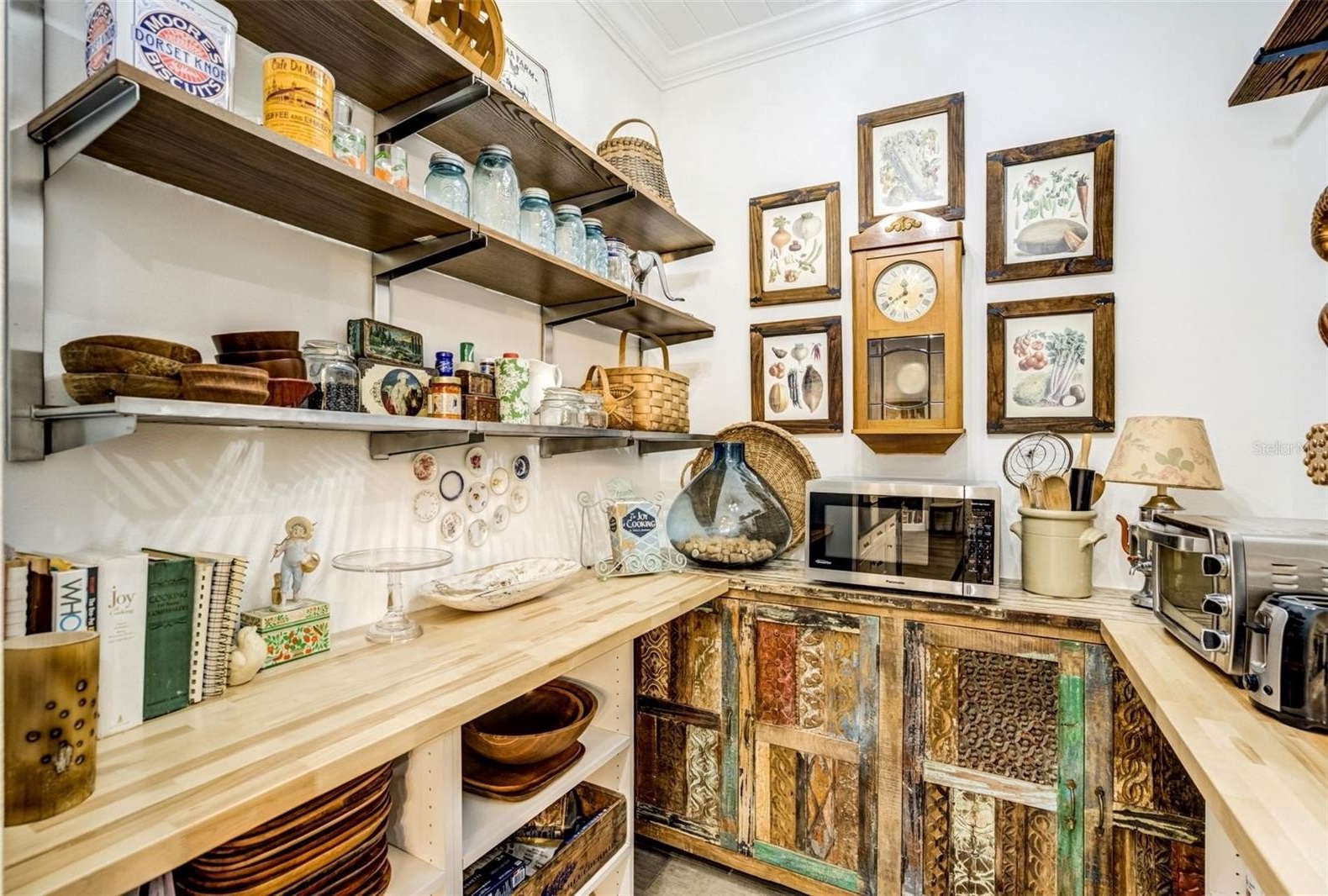 The chef’s kitchen is anchored by a 36-inch, 6-burner Wolf gas range and showcases premium finishes including timeless shaker style cabinets and stone counters. An oversized butler’s pantry provides exceptional storage and additional prep space, keeping everything organized and within reach. Modern efficiencies include solar panels, whole house generator, a durable metal roof, PGT hurricane rated impact windows and sliders, a instant tankless water heater and whole house reverse osmosis water filtration and softener—combining sustainability with everyday comfort.