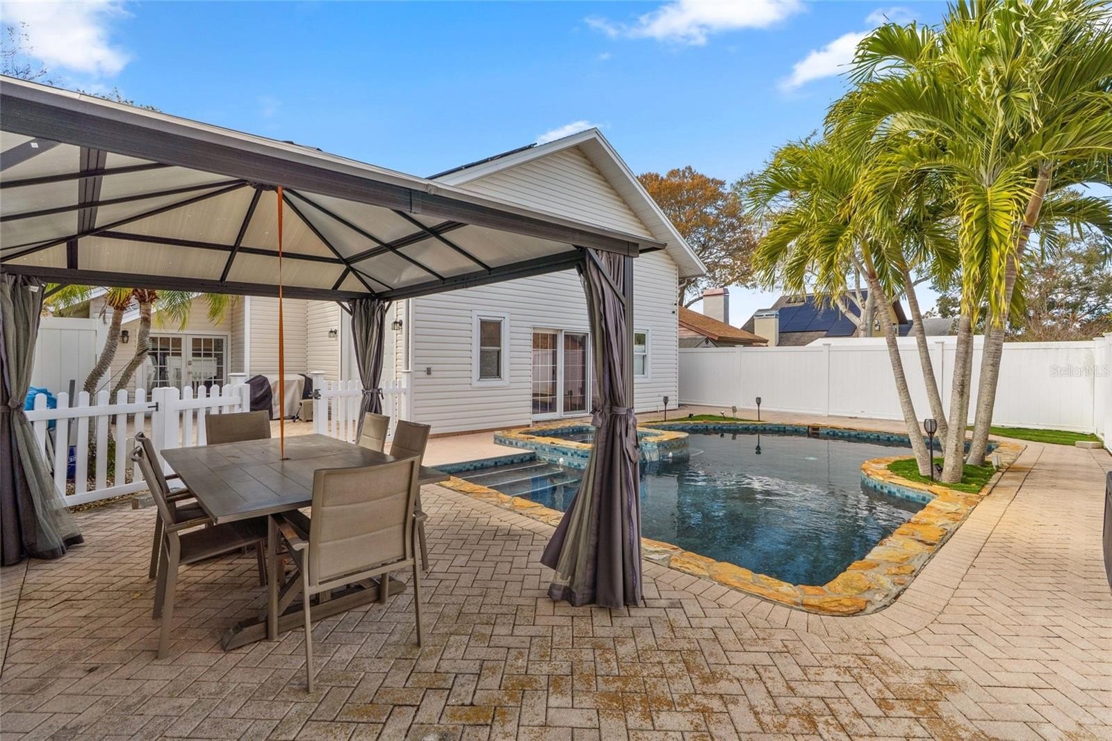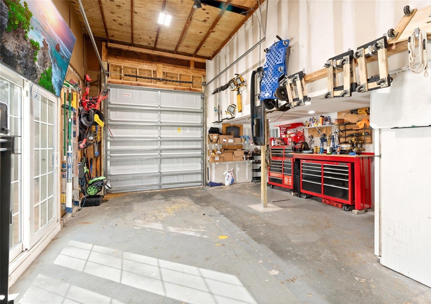 Engineered for Horsepower and Designed for Happy Hour, a corner-lot gem with two separate driveways and unmatched garage capacity. Three full garage bays with elevated clearance for the tall recreational toys, and an additional workshop. This property is a dream for collectors, hobbyists or anyone needing serious space. The dual driveway creates privacy convenience and exceptional curb appeal. Inside soaring ceilings and expansive windows flood the home with natural light, open concept living space with architectural drama. A fireplace anchors the main living area creating warmth and elegance. This flexible floor plan offers a first-floor primary suite with private on-suite, dual shower heads and walk-in closets (his and hers). A fourth bedroom with its own private lounge area ideal for guests or multi-generational living, a possible home office or a private retreat. Step outside to your tropical backyard Oasis featuring a sparkling pool, relaxing spa, dedicated barbecue/entertainment area and a fully fenced yard for privacy. The new roof paired with solar panels delivers impressive energy efficiency, offering long term savings and sustainable living. This is more than a home, it's a lifestyle property designed for entertaining, expansion, creativity and comfort whether you're hosting a poolside gathering, working on projects in your workshop or enjoying quiet evenings by the fireplace this home adapts to your life.