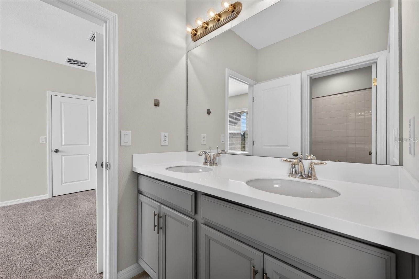 A welcoming foyer leads into formal living and dining spaces filled with natural light from large windows. The kitchen is designed with modern gray cabinetry, a generous center island with additional storage, a deep double-basin sink, and bar seating for three. The adjoining dinette overlooks the lake, providing a relaxing setting for everyday meals. The open-concept family room flows seamlessly to the covered lanai, offering great indoor-outdoor living and space ready for your personal design touches.