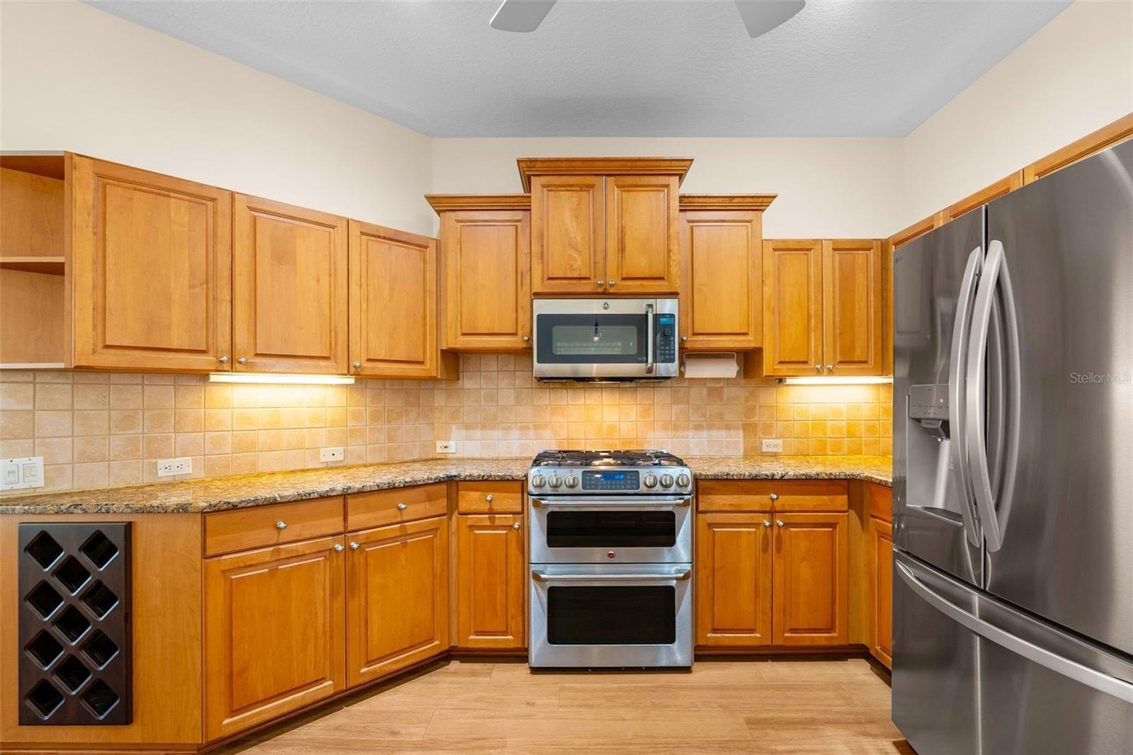 staggered cabinetry, gas range, double ovens, tile backsplash, pendant lighting, and thoughtfully