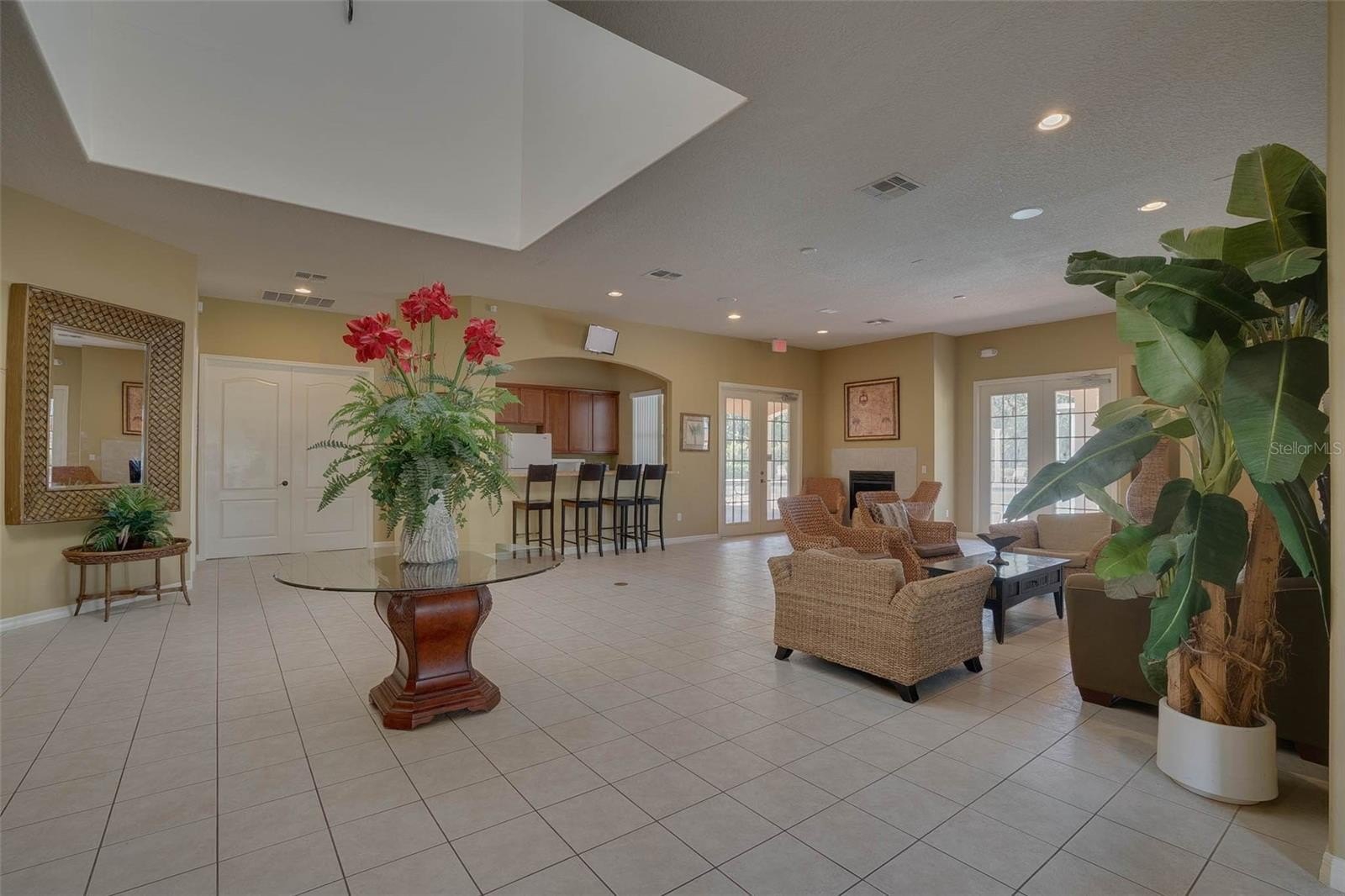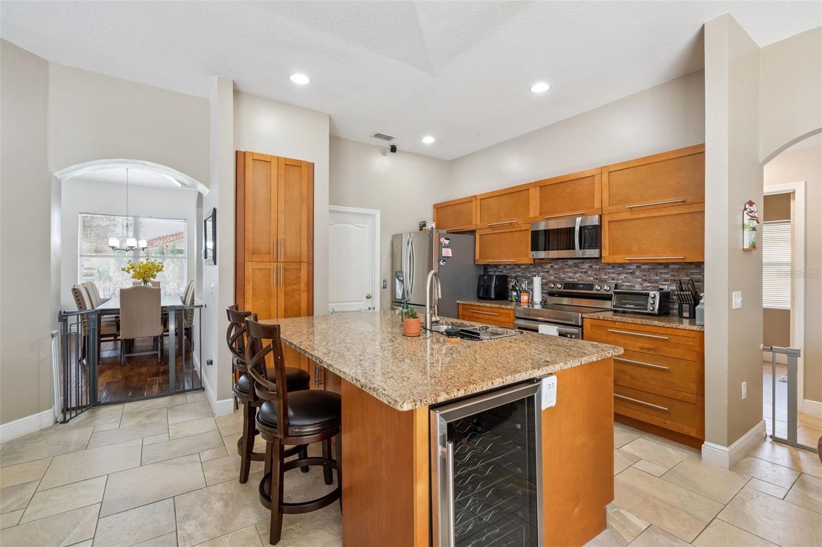 The kitchen is thoughtfully designed with a large island, breakfast bar, and stainless steel appliances, including a range with double oven and a wine fridge. A sliding glass door leads to the large lanai, seamlessly blending indoor and outdoor living—perfect for entertaining or relaxing evenings at home. While the entrance welcomes you with an open layout, the split-bedroom floor plan ensures privacy for the primary suite.