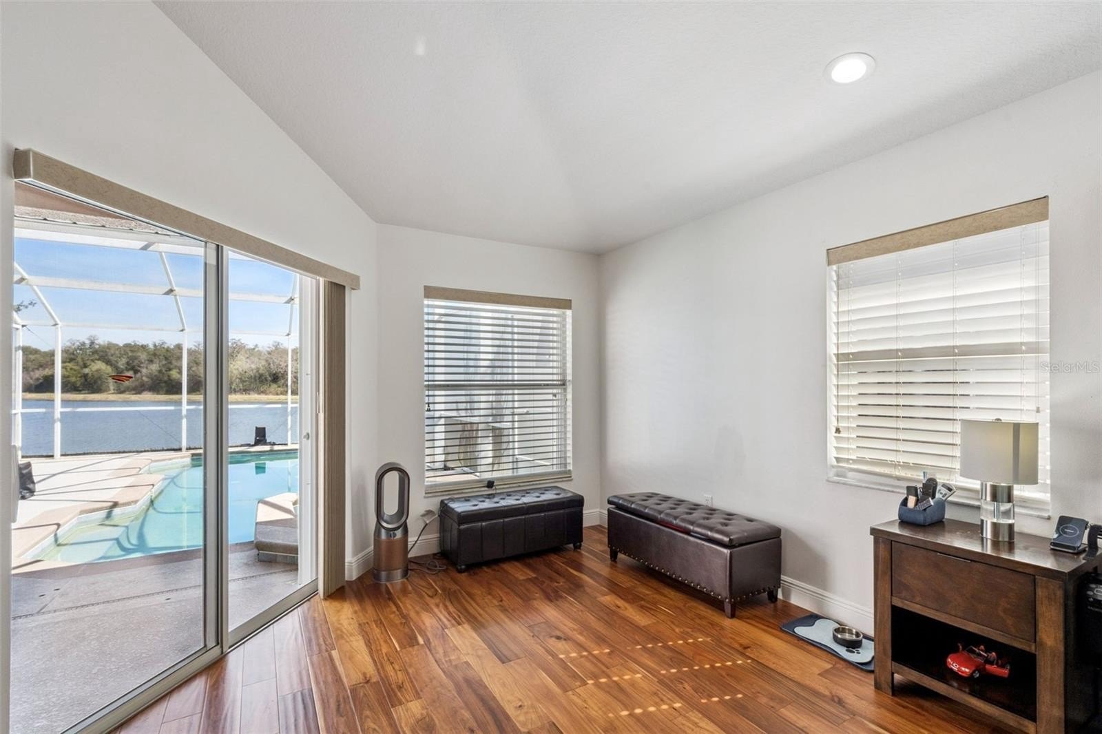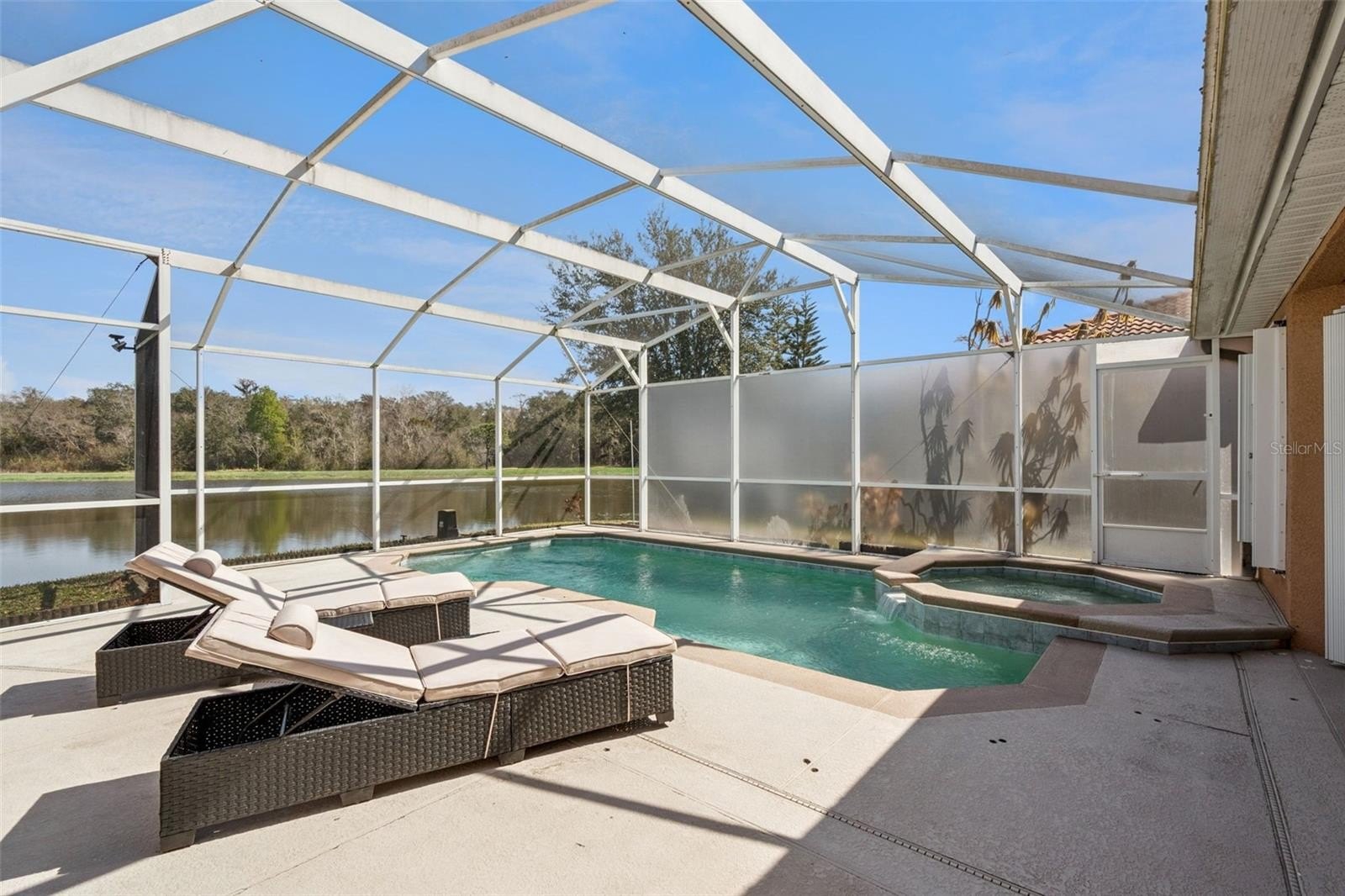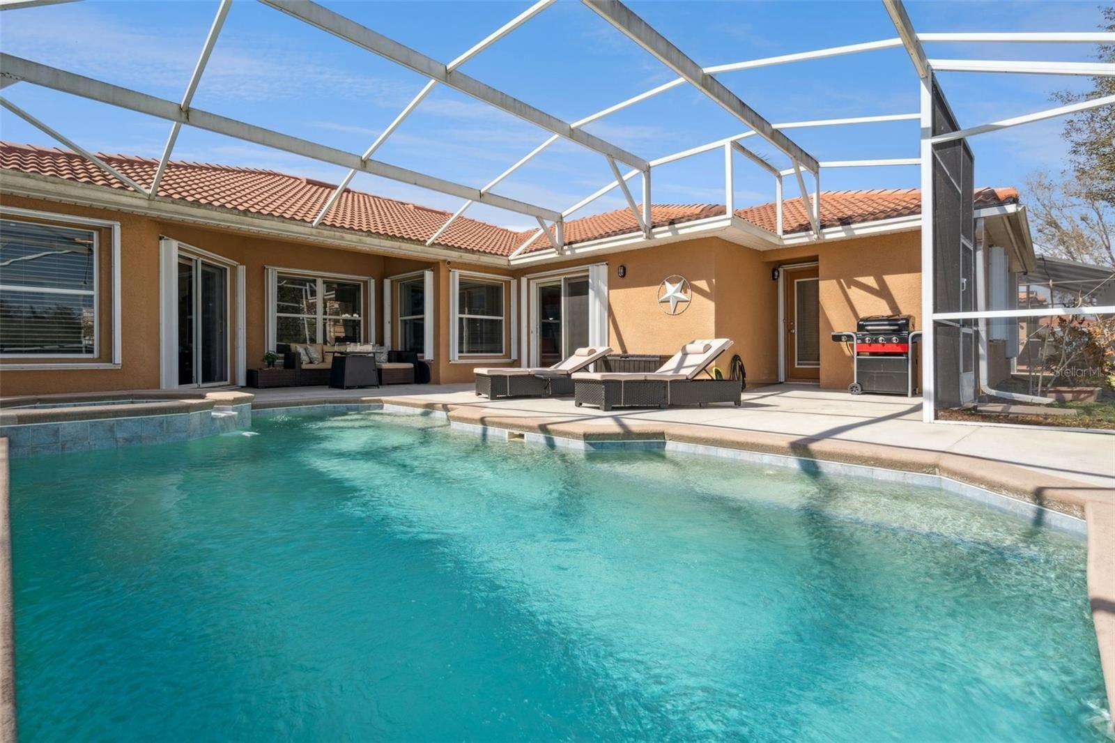Welcome to this gorgeous one-story home featuring a double door entrance and open floor plan. This well-maintained property captures serene water views from multiple rooms, along with a spacious screened-in lanai overlooking a private pool and beautifully landscaped patio.