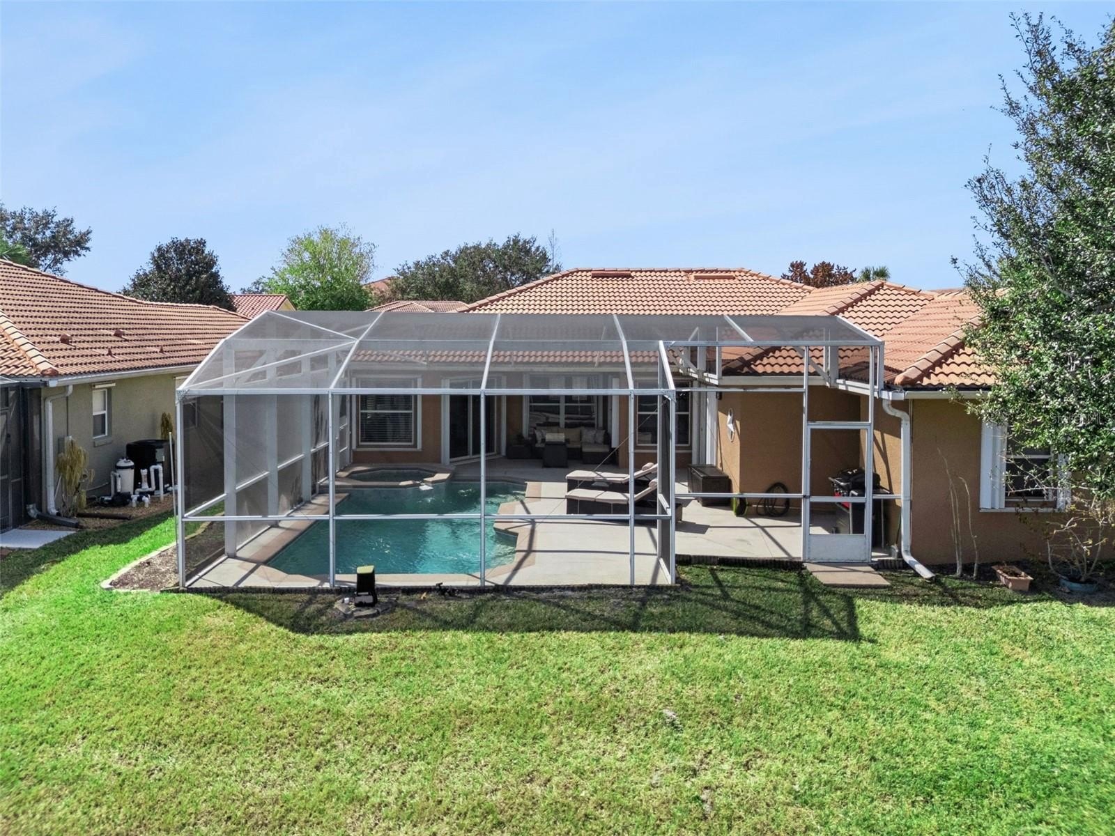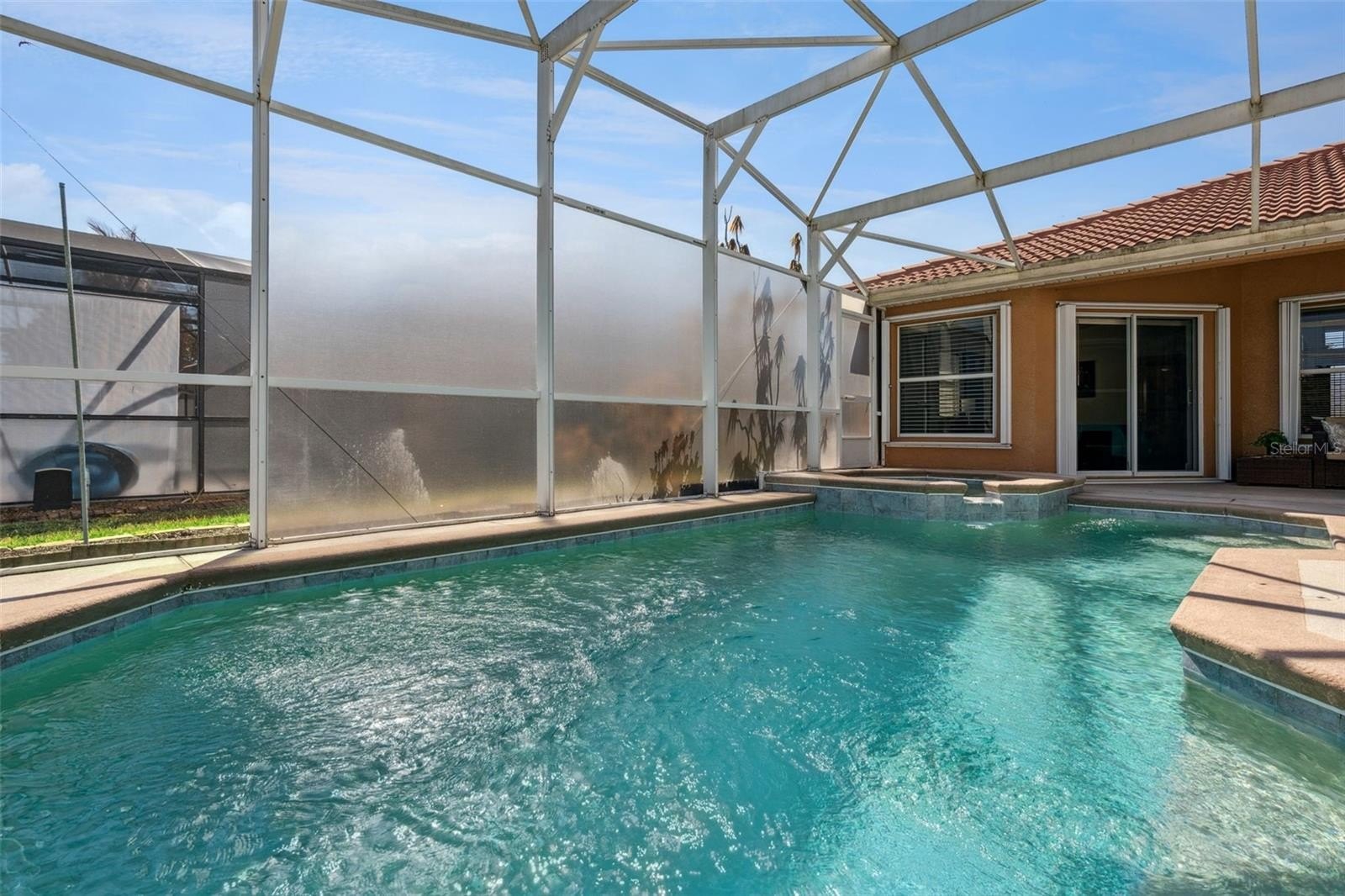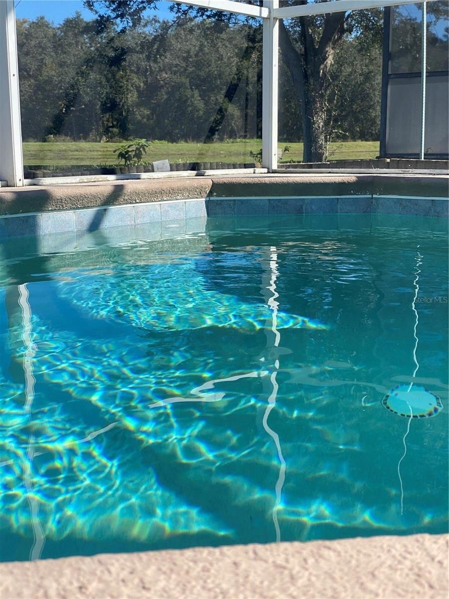 Additional features include hurricane shutters, gutters, tile roof, and a 2-car garage with opener and storage closet. The A/C unit was REPLACED in August 2022, and the water heater is approx. the same age. The pool enclosure includes some shaded vinyl-like screen panels for added privacy.