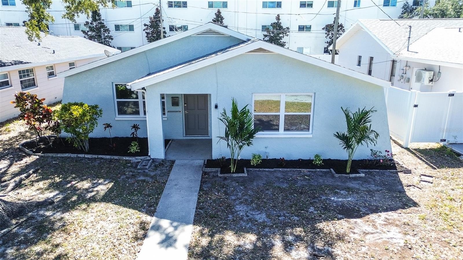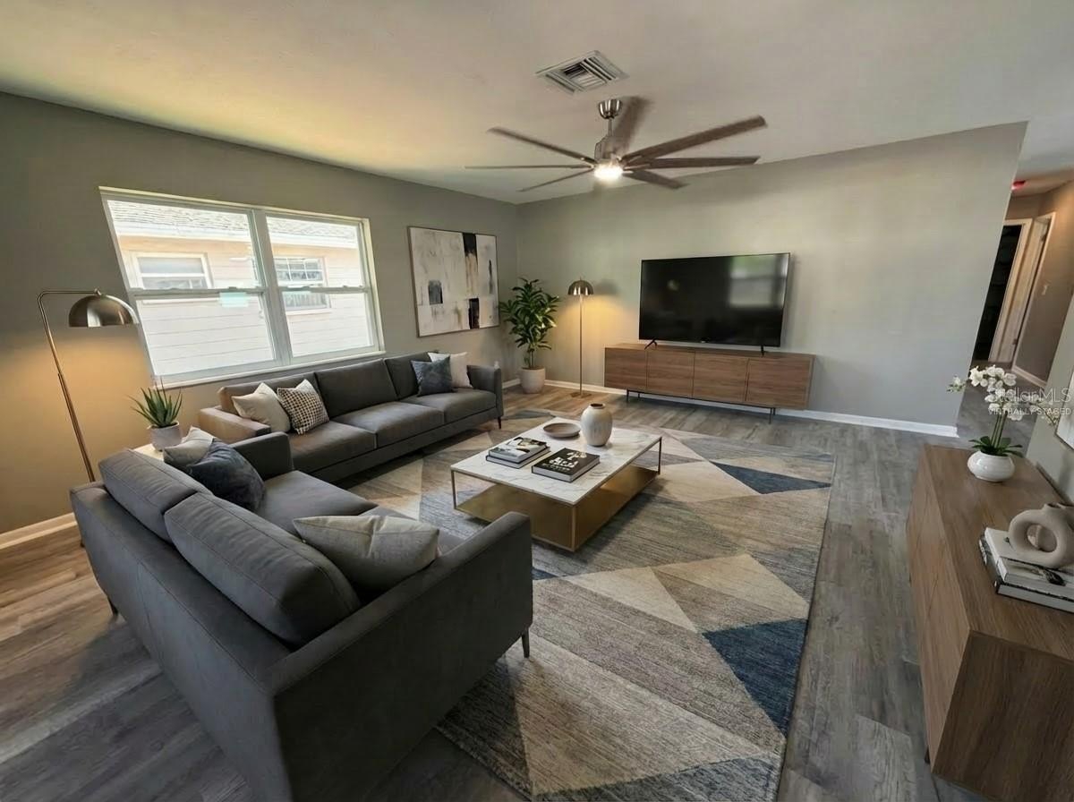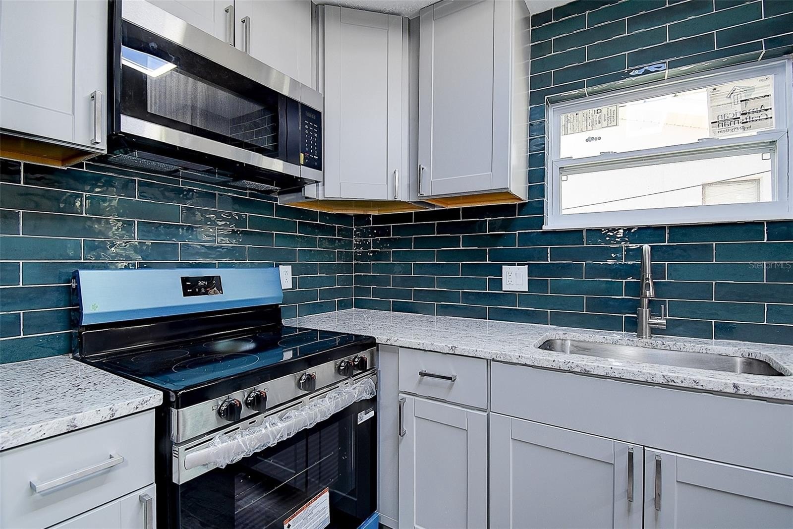Welcome home to this beautifully renovated 3 bedroom, 2 bathroom block construction residence that has been completely updated from top to bottom! This move-in ready home features a brand new roof, fresh paint inside and out, and all new impact-rated white vinyl windows for maximum energy efficiency and peace of mind. Step inside to discover an open and inviting floorplan with luxury vinyl plank flooring flowing throughout the entire home. The stunning designer kitchen is the true centerpiece, boasting light grey shaker cabinets, stainless steel appliances, a large island with granite countertops, and a custom blue subway tile backsplash that adds the perfect pop of color and style. Both bathrooms have been fully updated with new subway tile showers, modern vanities, and designer lighting fixtures. Ceiling fans are installed in every room for added comfort.
