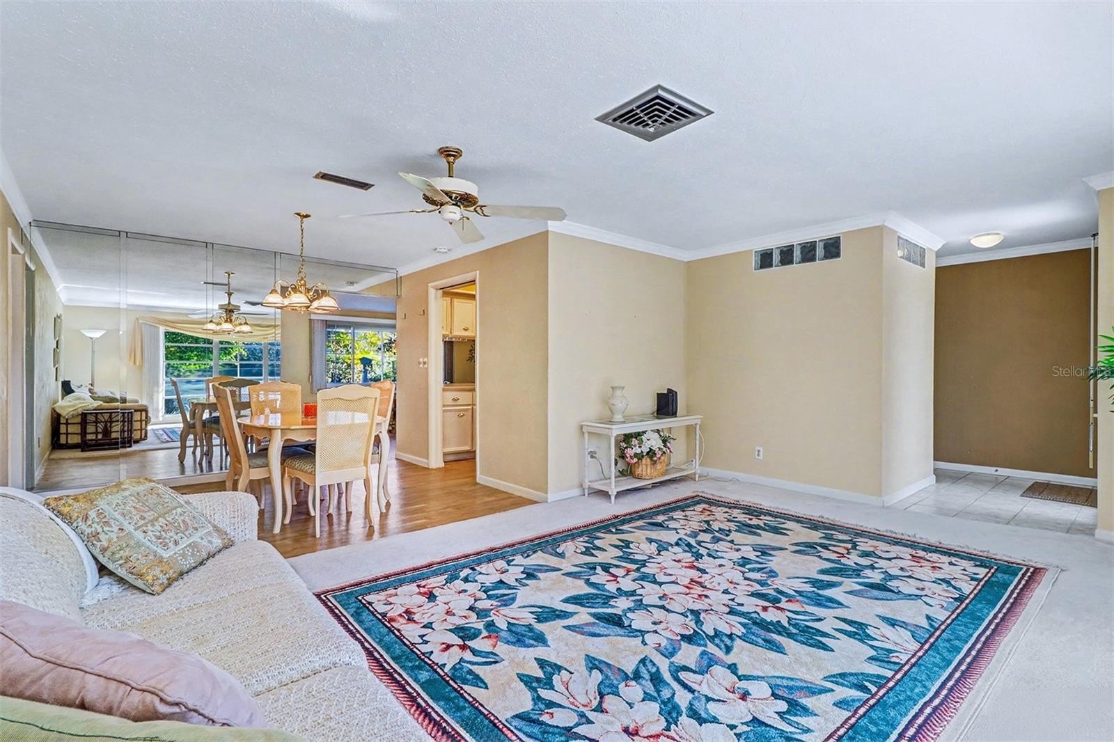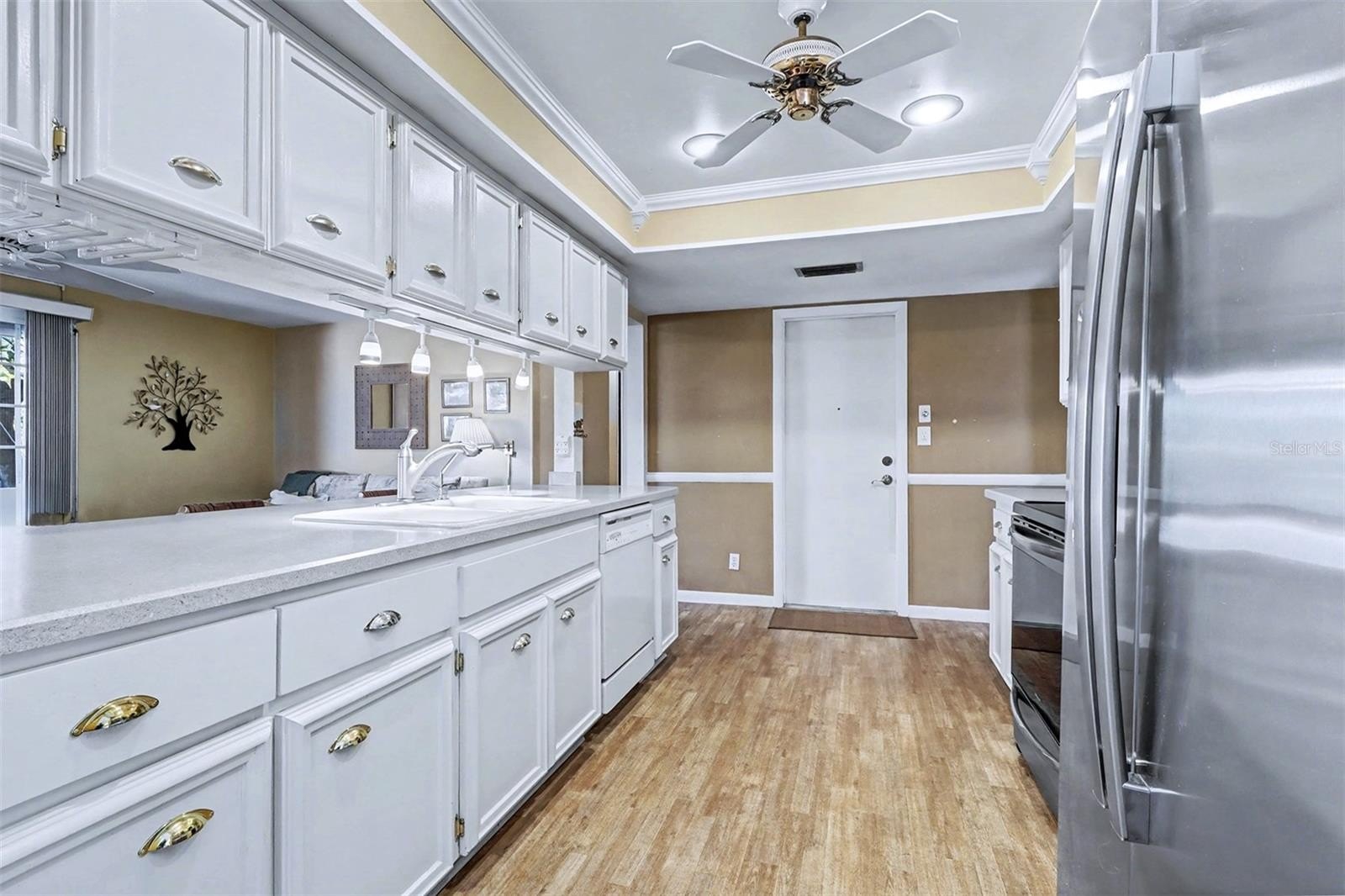 The large, updated kitchen features updated countertops, stainless steel appliances, modern lighting, and a breakfast bar. Conveniently located at the center of the home, the kitchen seamlessly flows into the family room, keeping you connected to the action at all times.