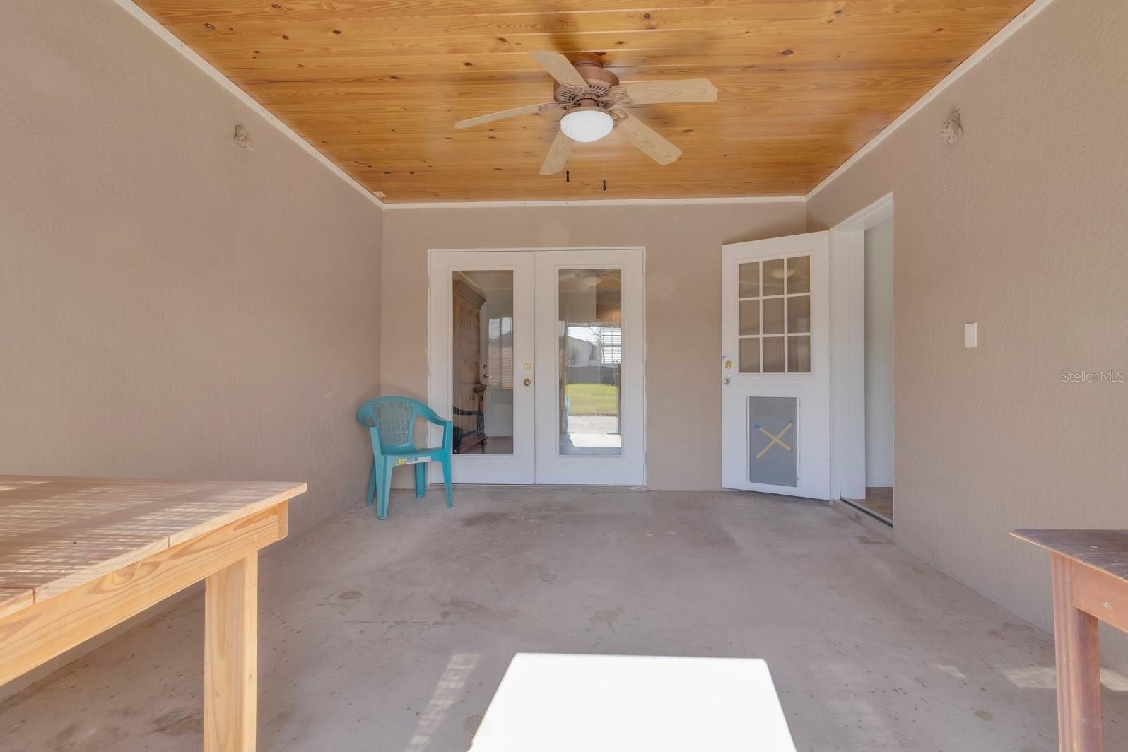 Enjoy relaxing on the covered patio with a wood-accent ceiling, ideal for gatherings or quiet evenings at home.