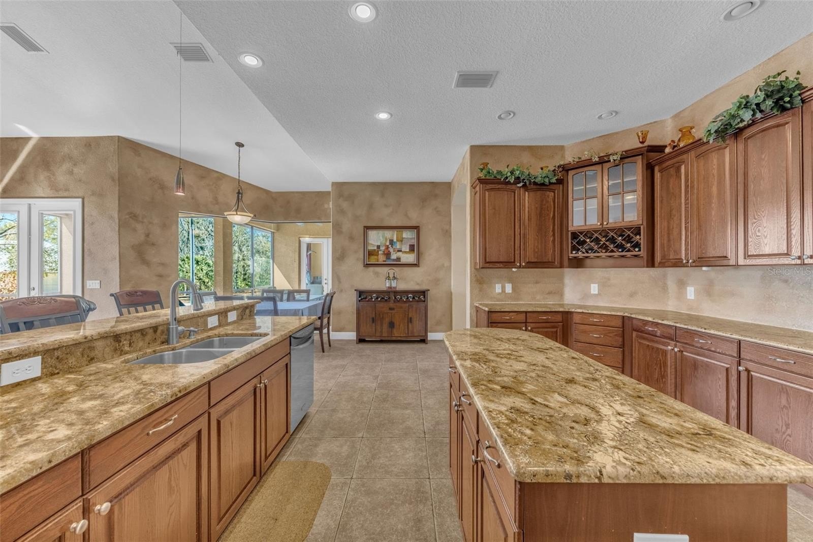 The gourmet kitchen is designed for both everyday living and entertaining, featuring rich walnut-stained oak cabinetry with decorative glass accents and a built-in wine rack, granite countertops, stainless steel appliances, and a center island that anchors the space beautifully.