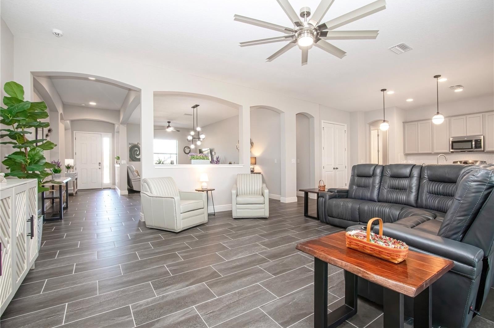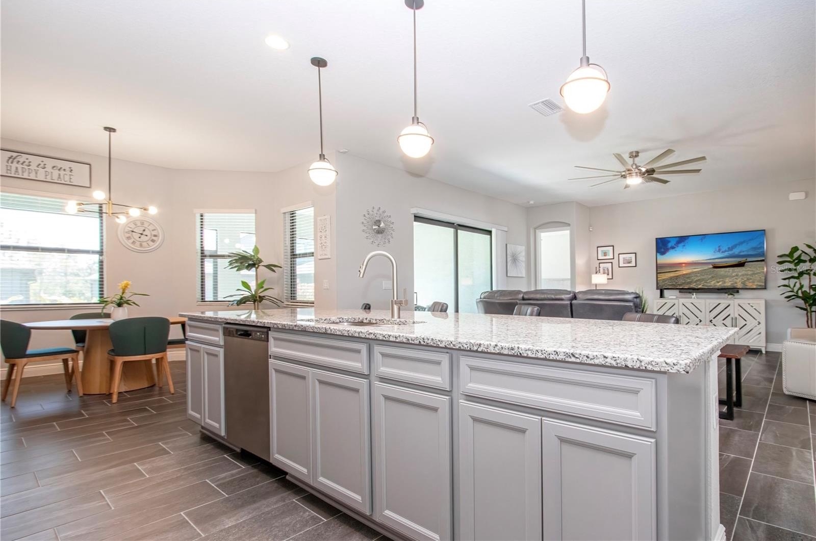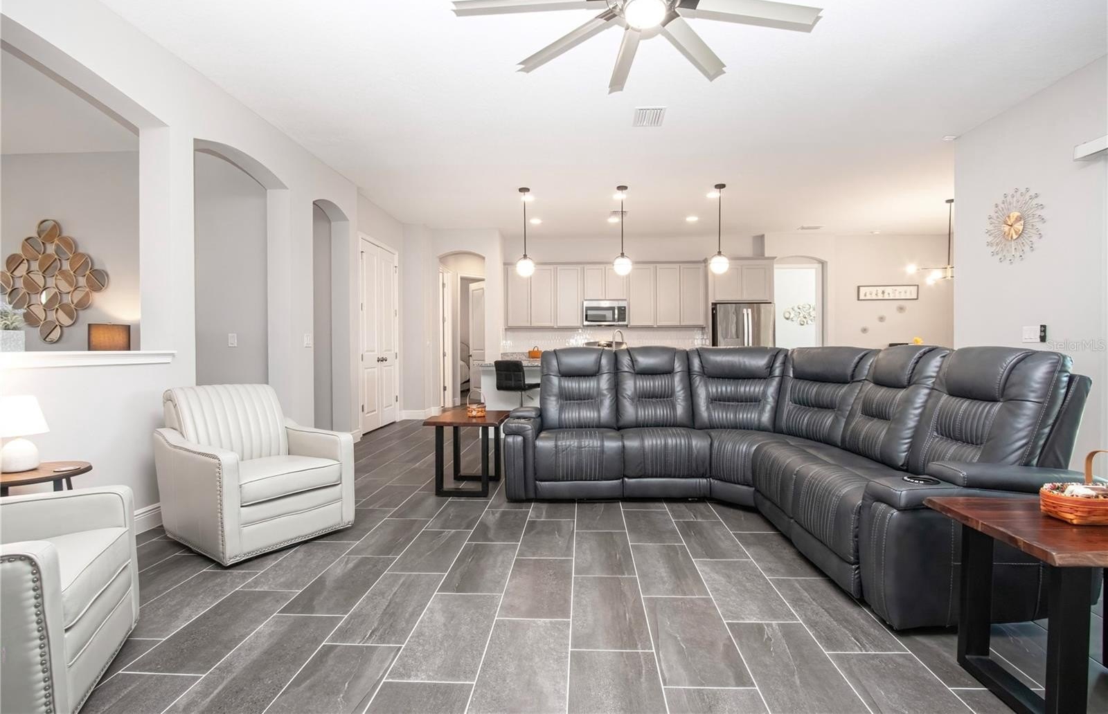 The kitchen serves as the true centerpiece of the home, featuring granite countertops, a designer backsplash, GE appliances, natural gas cooking, and an oversized island that anchors the living space and is perfectly suited for gatherings. Designer light fixtures and ceiling fans further elevate the overall aesthetic.