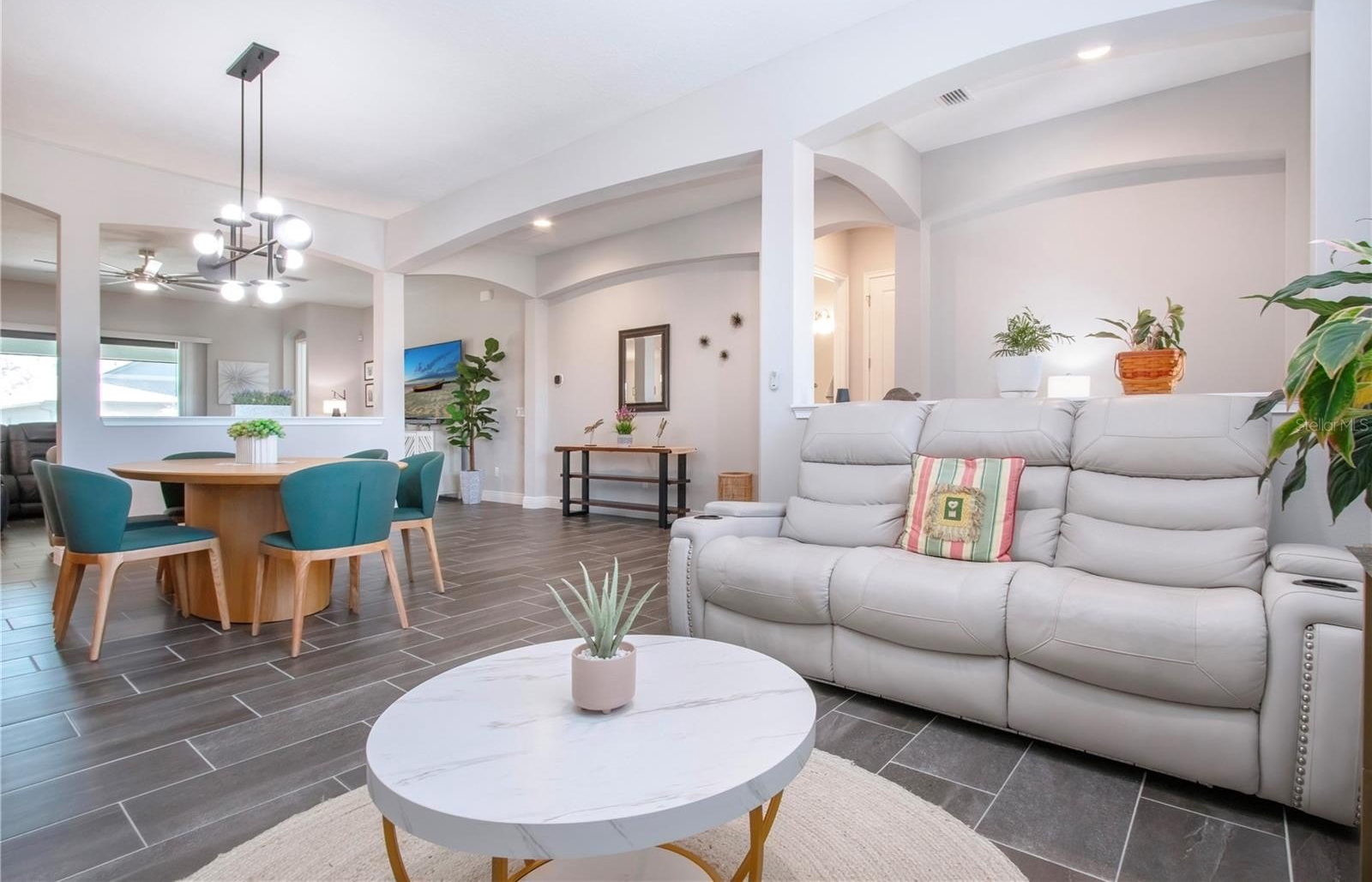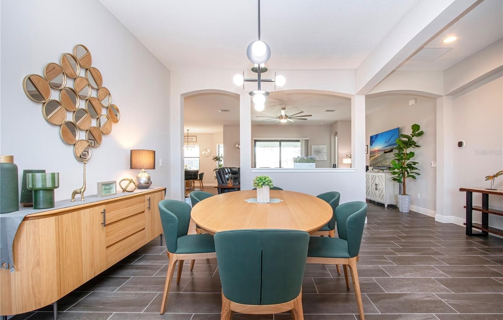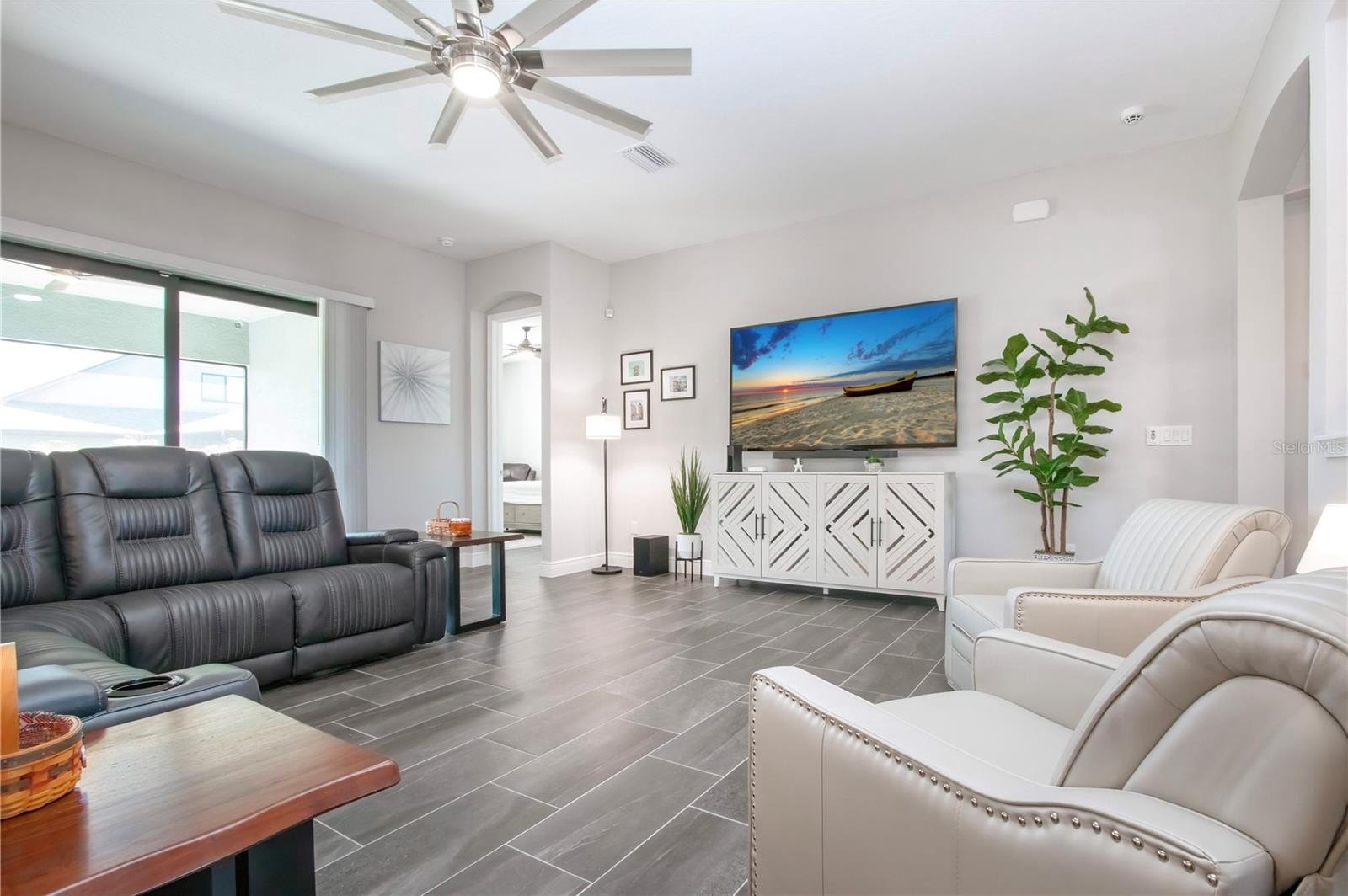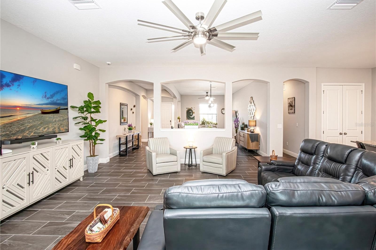 The kitchen serves as the true centerpiece of the home, featuring granite countertops, a designer backsplash, GE appliances, natural gas cooking, and an oversized island that anchors the living space and is perfectly suited for gatherings. Designer light fixtures and ceiling fans further elevate the overall aesthetic.