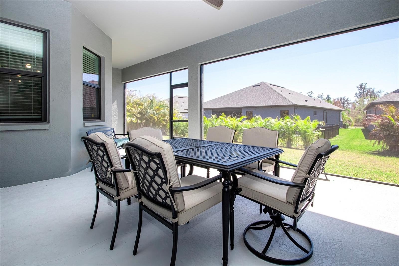 Additional features of the home include impact-resistant windows and doors, a security system with front door keypad entry, and garage ceiling storage racks that provide valuable extra storage. The large screened lanai, positioned to take advantage of the southern rear exposure, overlooks a backyard that offers ample space for a future pool, giving buyers the opportunity to design an outdoor retreat that fits their personal vision and lifestyle.