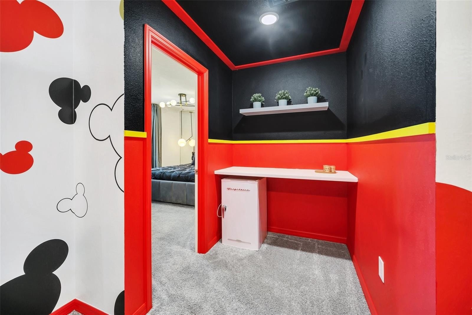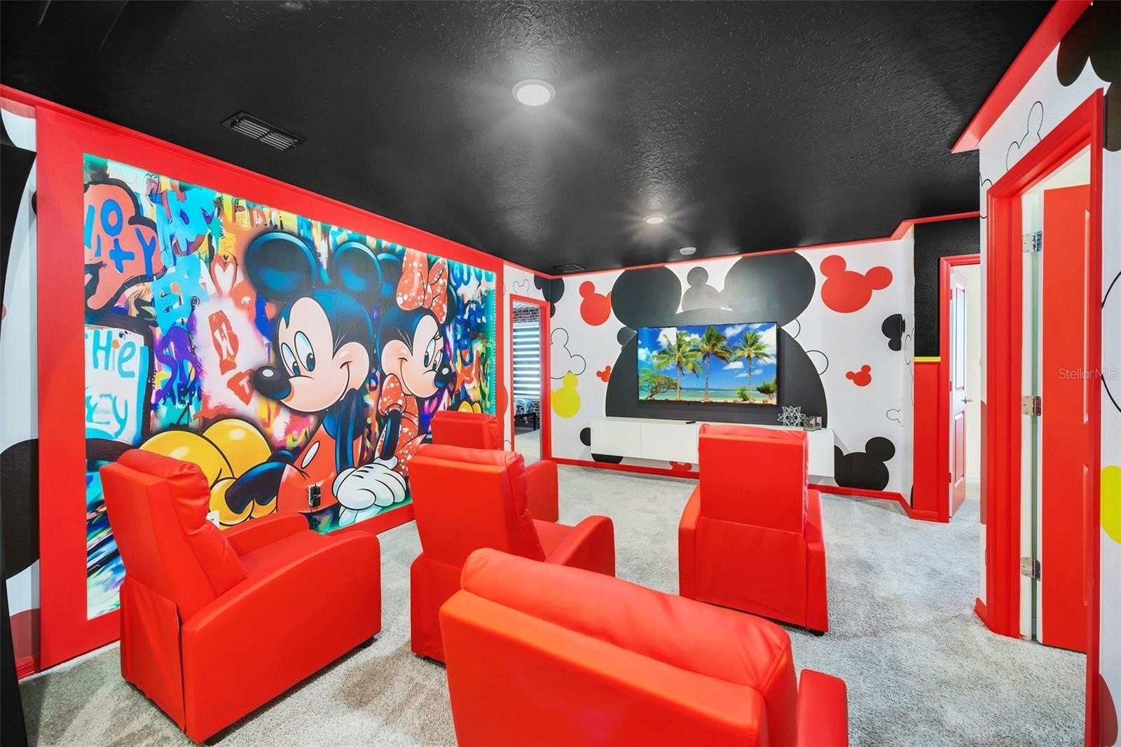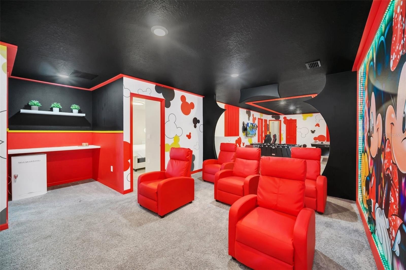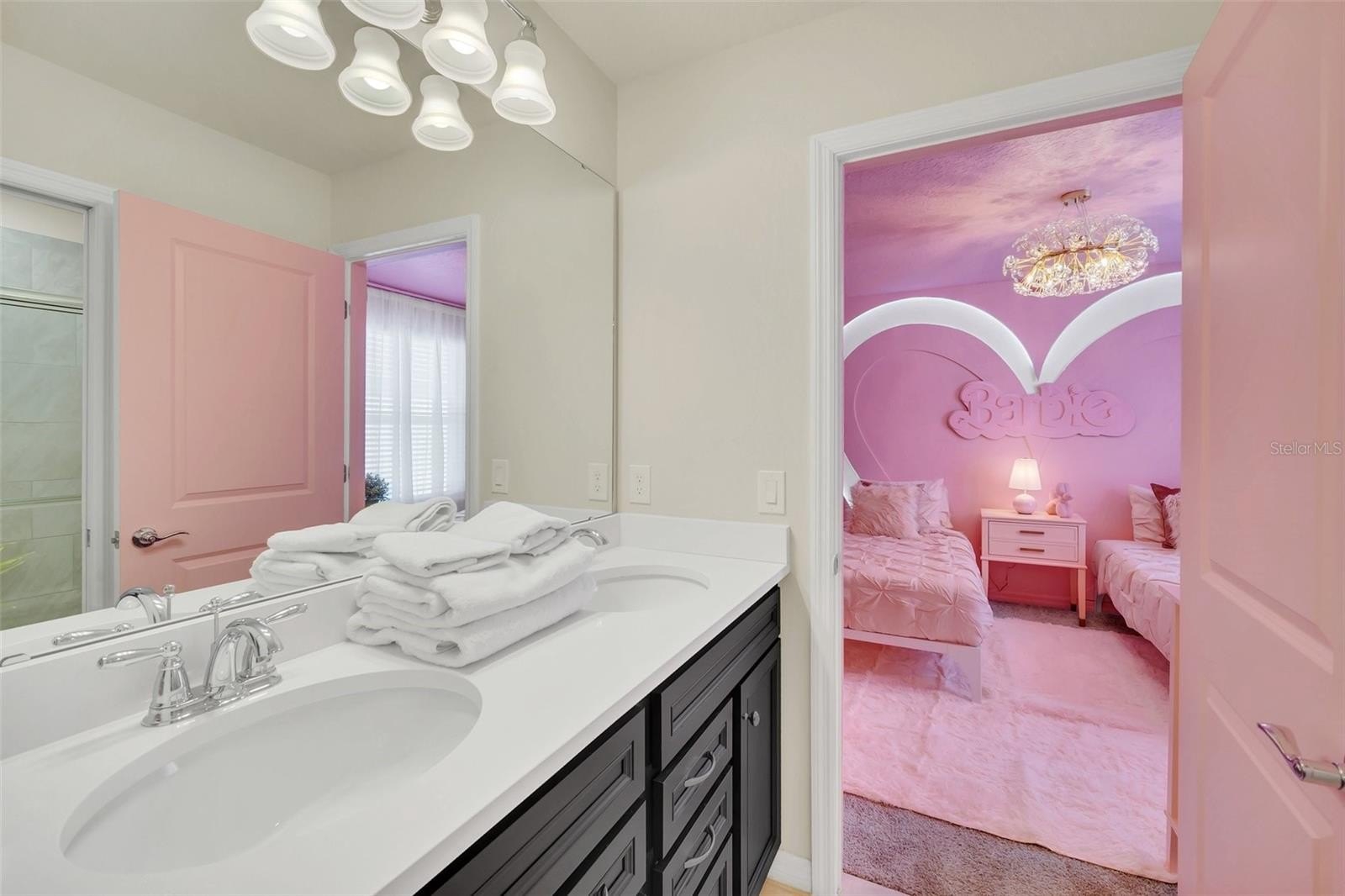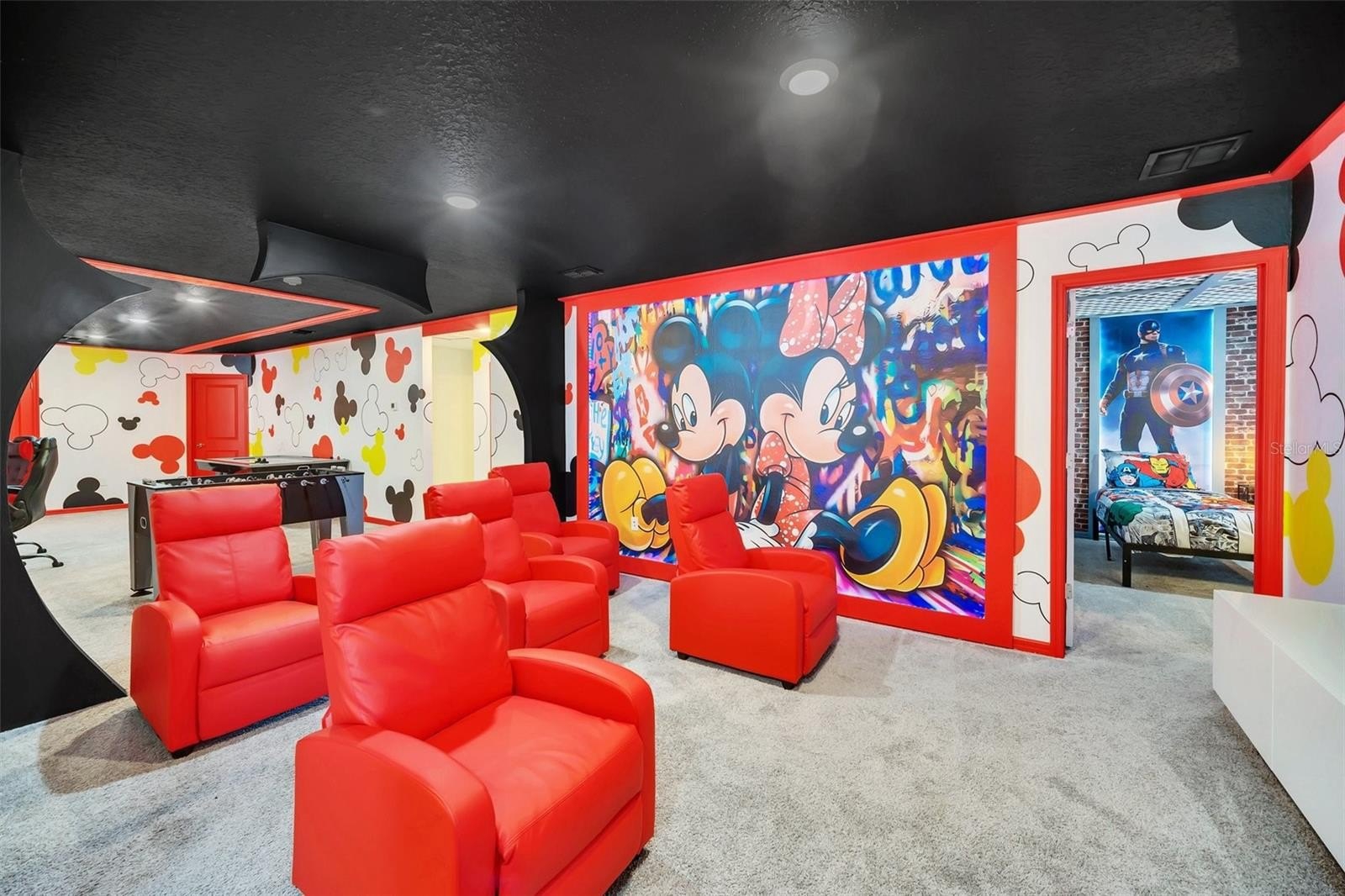 The primary suite features a spacious walk-in closet, while the additional bedrooms offer built-in closets and incredible attention to detail. Several bedrooms are beautifully designed with themed décor, including Harry Potter, Avengers, Mickey Mouse, Frozen, Barbie, and more—creating a fun, immersive atmosphere that truly sets this home apart.