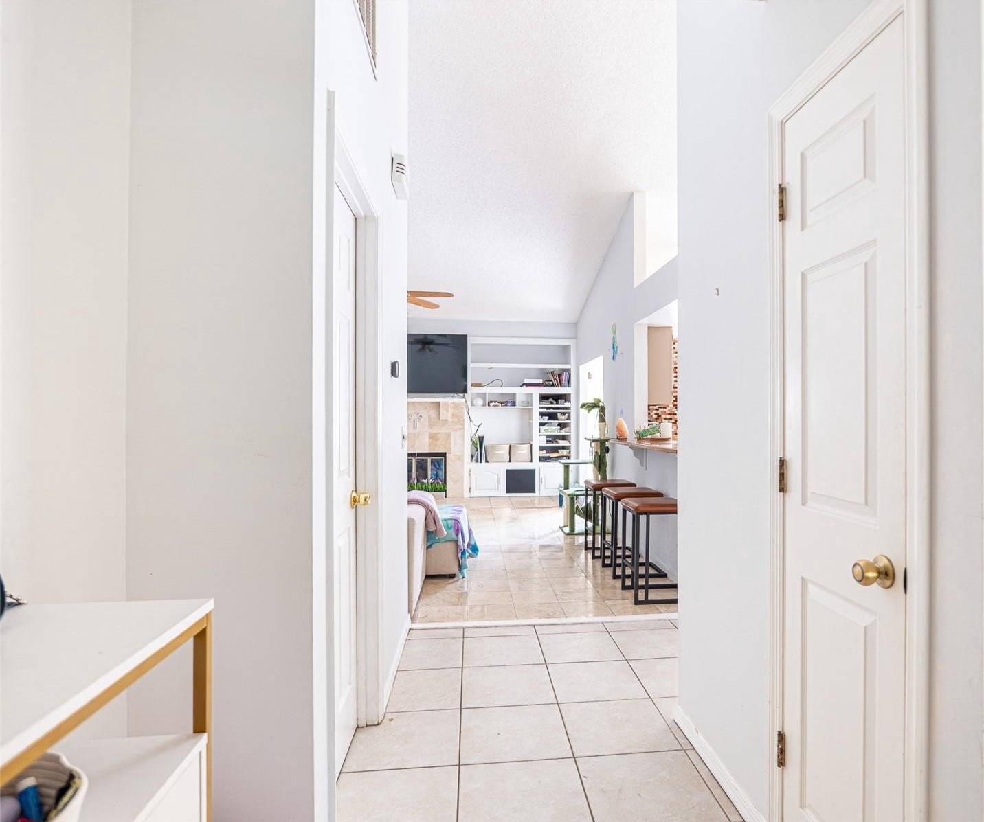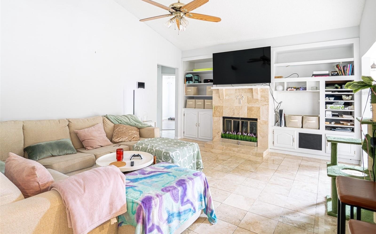 The heart of the home features a comfortable family room with a fireplace and built-in shelving, creating a perfect space to relax or gather with guests. The kitchen is centrally located and opens to the surrounding living areas, offering ample cabinet and counter space, modern appliances, and a breakfast bar ideal for casual meals or entertaining.