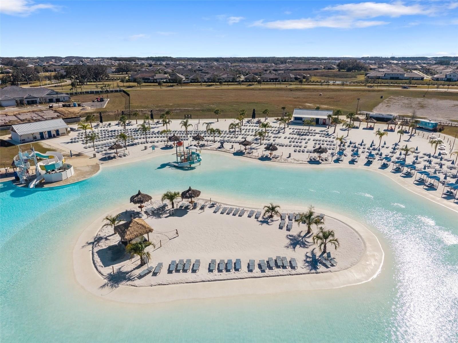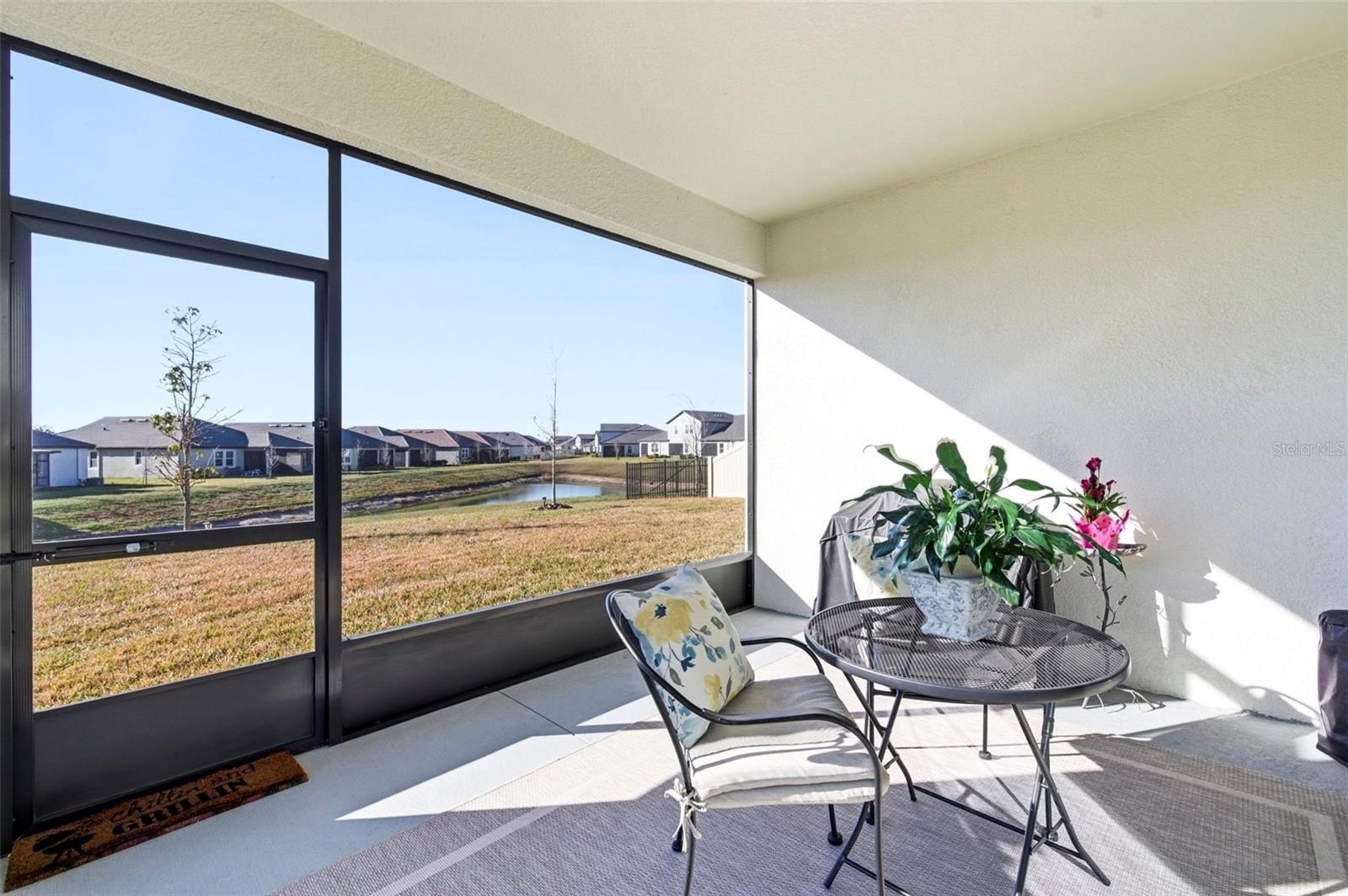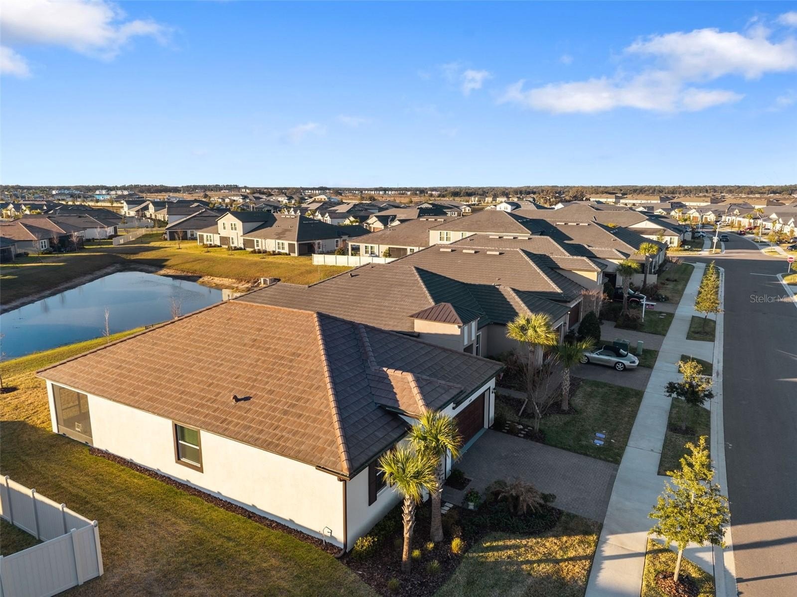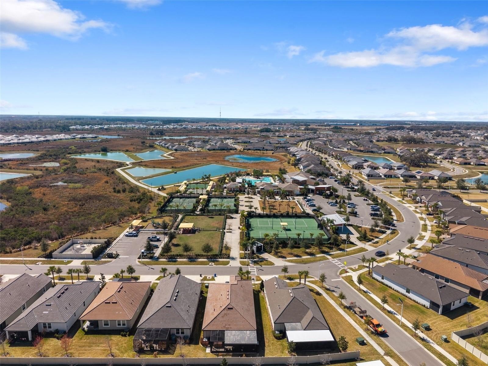 MOVE IN READY. UPGRADED THROUGHOUT. RESORT LIFESTYLE. Welcome to 10499 Gable Dig Loop, A beautifully maintained Morningtide model located in the highly sought after Medley at Mirada, an Active Adult (55+) community. This thoughtfully designed home offers 2 bedrooms, 2 bathrooms, a versatile flex space ideal for a den, office, or hobby area, an open living and dining space, oversized 2 car garage, and a covered, screened lanai overlooking a peaceful pond, perfect for relaxing year-round. This CONCRETE BLOCK includes quality interior highlights such as extended plank tile flooring throughout the entire home with no carpet, custom designer lighting, abundant natural light, and a bright, OPEN LIVING DESIGN. The kitchen and bathrooms feature QUARTZ countertops, brushed nickel finishes, ample cabinetry, a walk in pantry, and a reverse osmosis water connection already built into the quartz for easy future hookup. The primary suite offers dual vanities, a spacious walk-in closet, and a beautifully Finished walk-in shower with frameless glass door, subway tile surround, and built-in niche. A convenient drop zone with quartz counter near the laundry area provides additional everyday functionality. OUTDOOR FEATURES include a fully screened, professionally installed seamless gutters, brick paver walkway and driveway, and a durable flat style concrete tile roof designed for long term performance. Built for efficiency and protection, the home includes a Florida Building Code compliant wind rated garage door, energy efficient double pane Low E windows, Lennar Smart Home technology with smart thermostat, video doorbell, and WiFi garage opener, and an A. O. Smith hybrid heat pump water heater that reduces energy use while helping cool and dehumidify the garage. Ideally located just minutes by golf cart to the PRIVATE Medley residents clubhouse where living like you're on VACATION is a must. Featuring a resort-style pool, state-of-the-art fitness center with a dedicated group exercise studio, elegant ballroom with stage and dance floor, billiards lounge, and a convenient pet spa. Social and dining options include a full-service indoor restaurant and bar, along with a vibrant poolside bar and grill offering food and beverages in a true resort setting. Exclusively for Medley residents, the soon to be completed Tiki Pavilion will boast a scenic boardwalk to the private community beach, complemented by mini golf, a putting green, bocce ball courts, welcoming social areas, and a clubhouse with restroom facilities. Your new home offers convenient access to amenities while remaining tucked away from community traffic for added peace and privacy. Medley residents enjoy MAINTENANCE FREE living with comprehensive lawn care, irrigation, exterior maintenance, and cable & high speed UltraFi internet. Ownership at Medley includes exclusive resident access to the 15-acre Mirada Lagoon, with guest passes available for family and friends. Enjoy private sandy beach areas, resident-only swimming zones, kayaking, paddleboarding, food and beverage service, and year-round events. Resort-style features include a waterslide, lounge areas with cabanas, and a swim-out island perfect for relaxing in the Florida sunshine. Conveniently located near I-75, The Shops at Wiregrass, Tampa Premium Outlets, KRATE at the Grove, dining, medical facilities, and everyday conveniences.