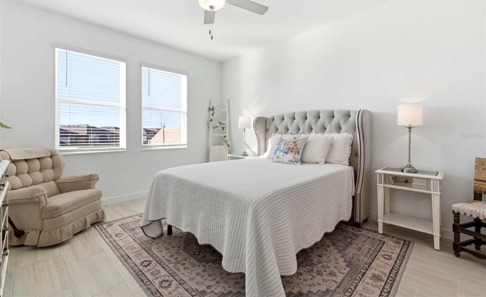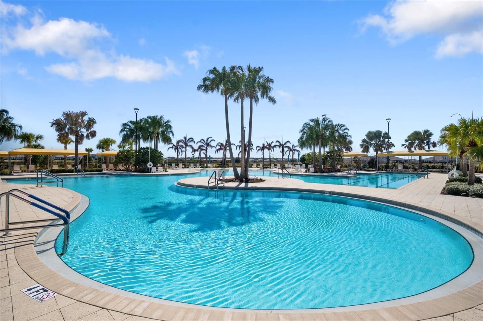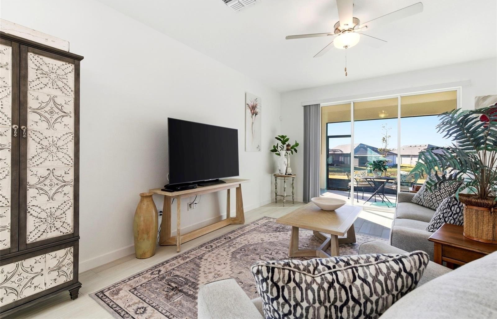 MOVE IN READY. UPGRADED THROUGHOUT. RESORT LIFESTYLE. Welcome to 10499 Gable Dig Loop, A beautifully maintained Morningtide model located in the highly sought after Medley at Mirada, an Active Adult (55+) community. This thoughtfully designed home offers 2 bedrooms, 2 bathrooms, a versatile flex space ideal for a den, office, or hobby area, an open living and dining space, oversized 2 car garage, and a covered, screened lanai overlooking a peaceful pond, perfect for relaxing year-round. This CONCRETE BLOCK includes quality interior highlights such as extended plank tile flooring throughout the entire home with no carpet, custom designer lighting, abundant natural light, and a bright, OPEN LIVING DESIGN. The kitchen and bathrooms feature QUARTZ countertops, brushed nickel finishes, ample cabinetry, a walk in pantry, and a reverse osmosis water connection already built into the quartz for easy future hookup. The primary suite offers dual vanities, a spacious walk-in closet, and a beautifully Finished walk-in shower with frameless glass door, subway tile surround, and built-in niche. A convenient drop zone with quartz counter near the laundry area provides additional everyday functionality. OUTDOOR FEATURES include a fully screened, professionally installed seamless gutters, brick paver walkway and driveway, and a durable flat style concrete tile roof designed for long term performance. Built for efficiency and protection, the home includes a Florida Building Code compliant wind rated garage door, energy efficient double pane Low E windows, Lennar Smart Home technology with smart thermostat, video doorbell, and WiFi garage opener, and an A. O. Smith hybrid heat pump water heater that reduces energy use while helping cool and dehumidify the garage. Ideally located just minutes by golf cart to the PRIVATE Medley residents clubhouse where living like you're on VACATION is a must. Featuring a resort-style pool, state-of-the-art fitness center with a dedicated group exercise studio, elegant ballroom with stage and dance floor, billiards lounge, and a convenient pet spa. Social and dining options include a full-service indoor restaurant and bar, along with a vibrant poolside bar and grill offering food and beverages in a true resort setting. Exclusively for Medley residents, the soon to be completed Tiki Pavilion will boast a scenic boardwalk to the private community beach, complemented by mini golf, a putting green, bocce ball courts, welcoming social areas, and a clubhouse with restroom facilities. Your new home offers convenient access to amenities while remaining tucked away from community traffic for added peace and privacy. Medley residents enjoy MAINTENANCE FREE living with comprehensive lawn care, irrigation, exterior maintenance, and cable & high speed UltraFi internet. Ownership at Medley includes exclusive resident access to the 15-acre Mirada Lagoon, with guest passes available for family and friends. Enjoy private sandy beach areas, resident-only swimming zones, kayaking, paddleboarding, food and beverage service, and year-round events. Resort-style features include a waterslide, lounge areas with cabanas, and a swim-out island perfect for relaxing in the Florida sunshine. Conveniently located near I-75, The Shops at Wiregrass, Tampa Premium Outlets, KRATE at the Grove, dining, medical facilities, and everyday conveniences.