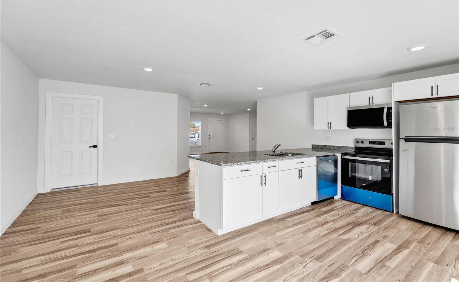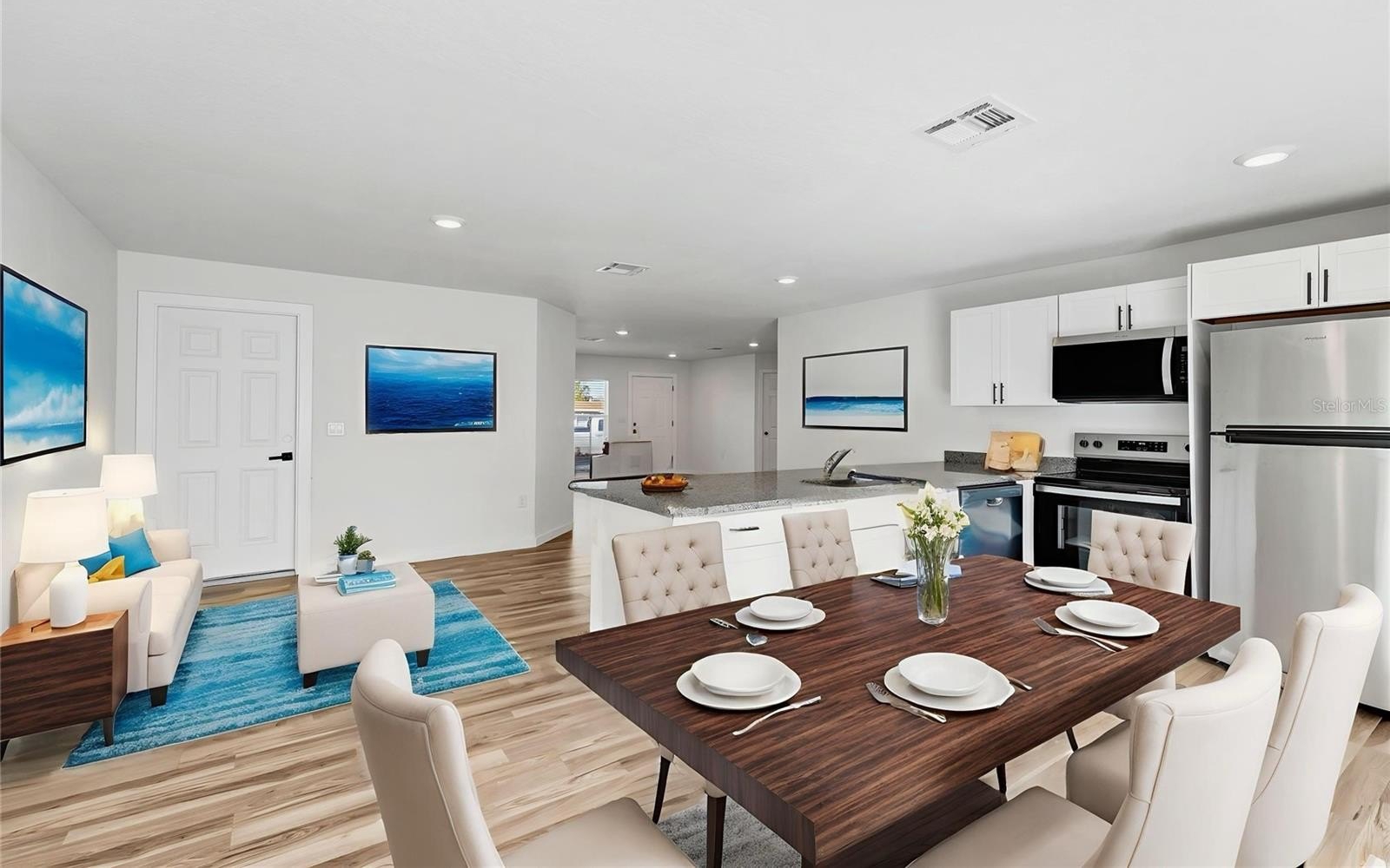 The heart of the home is a stylish kitchen featuring granite countertops, modern cabinetry, and upgraded finishes that create a clean, contemporary feel. The seamless flow between the kitchen, dining, and living areas provides the perfect space for gatherings while maintaining a warm, inviting atmosphere.